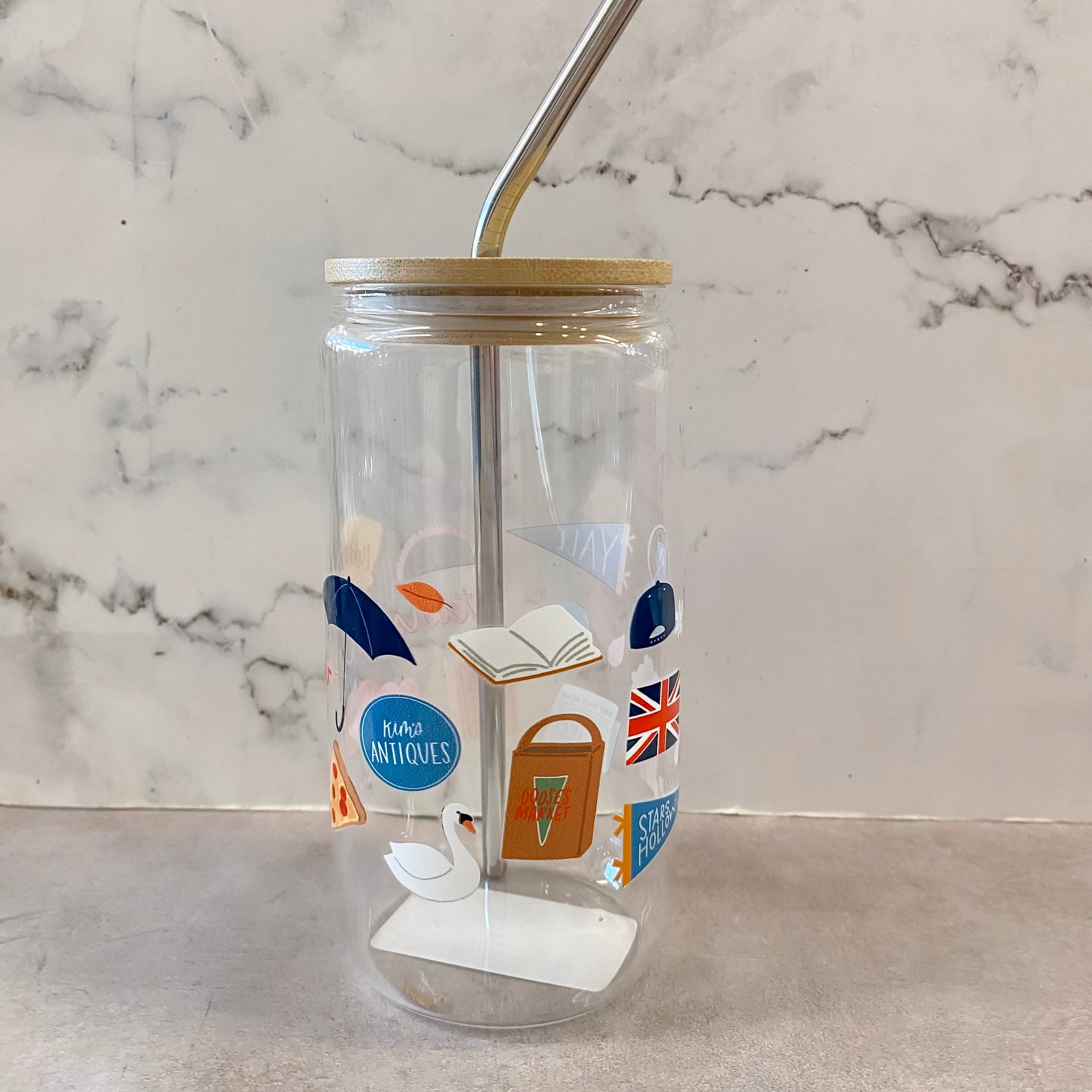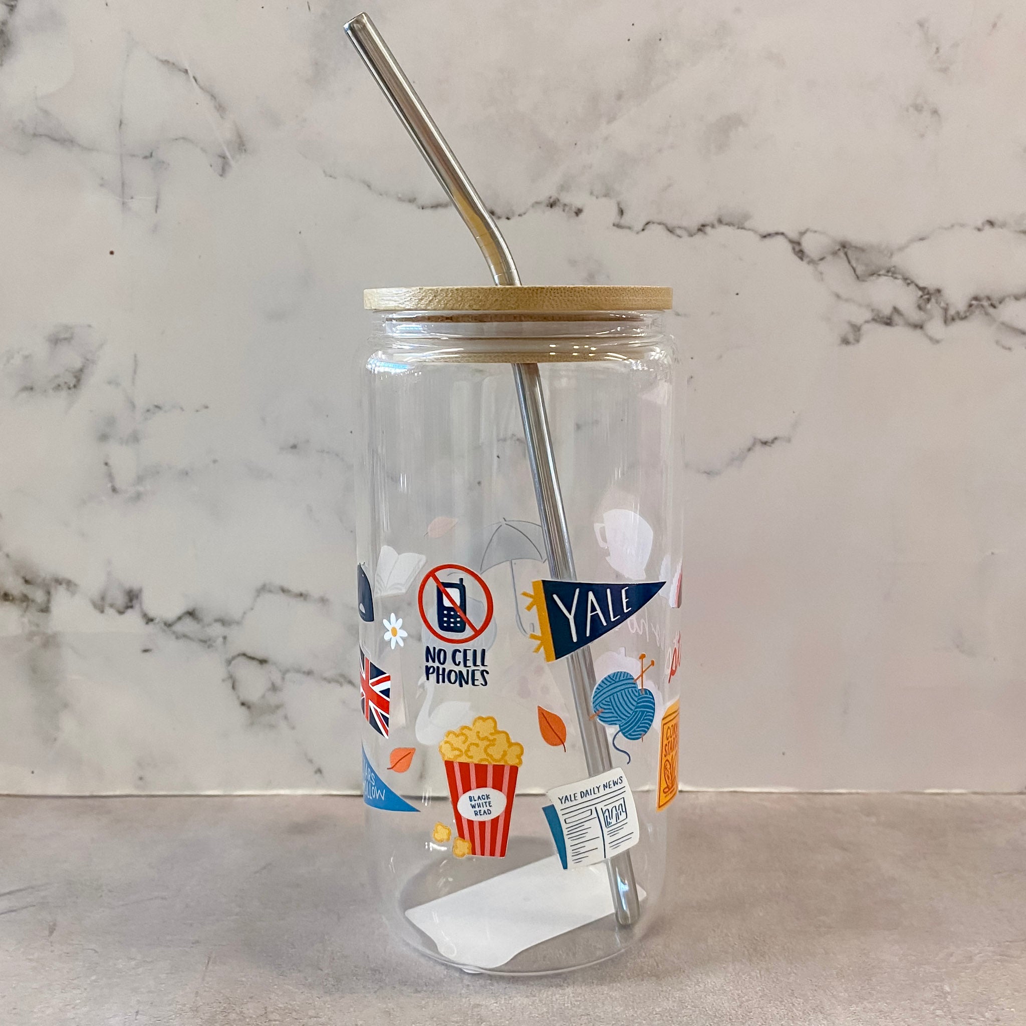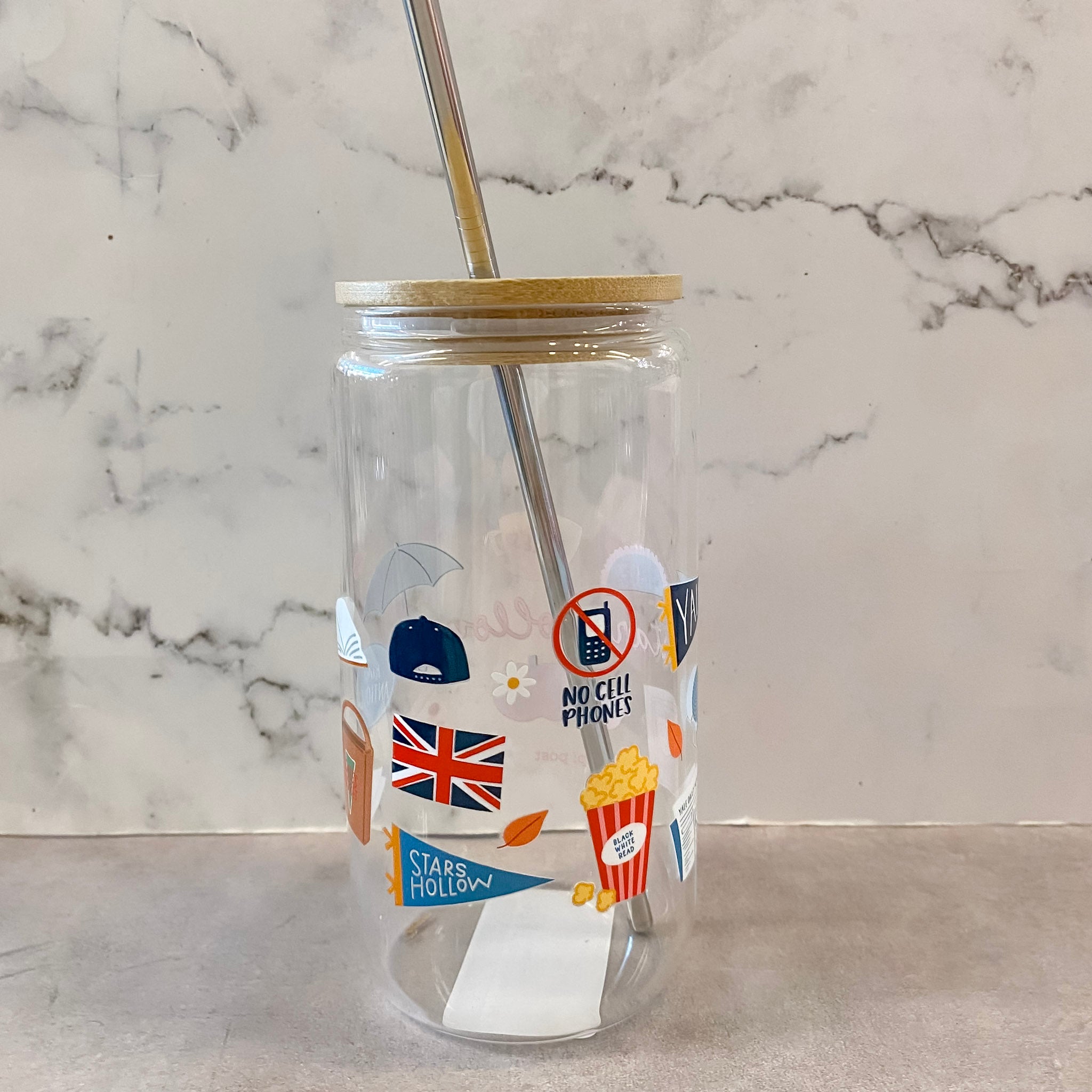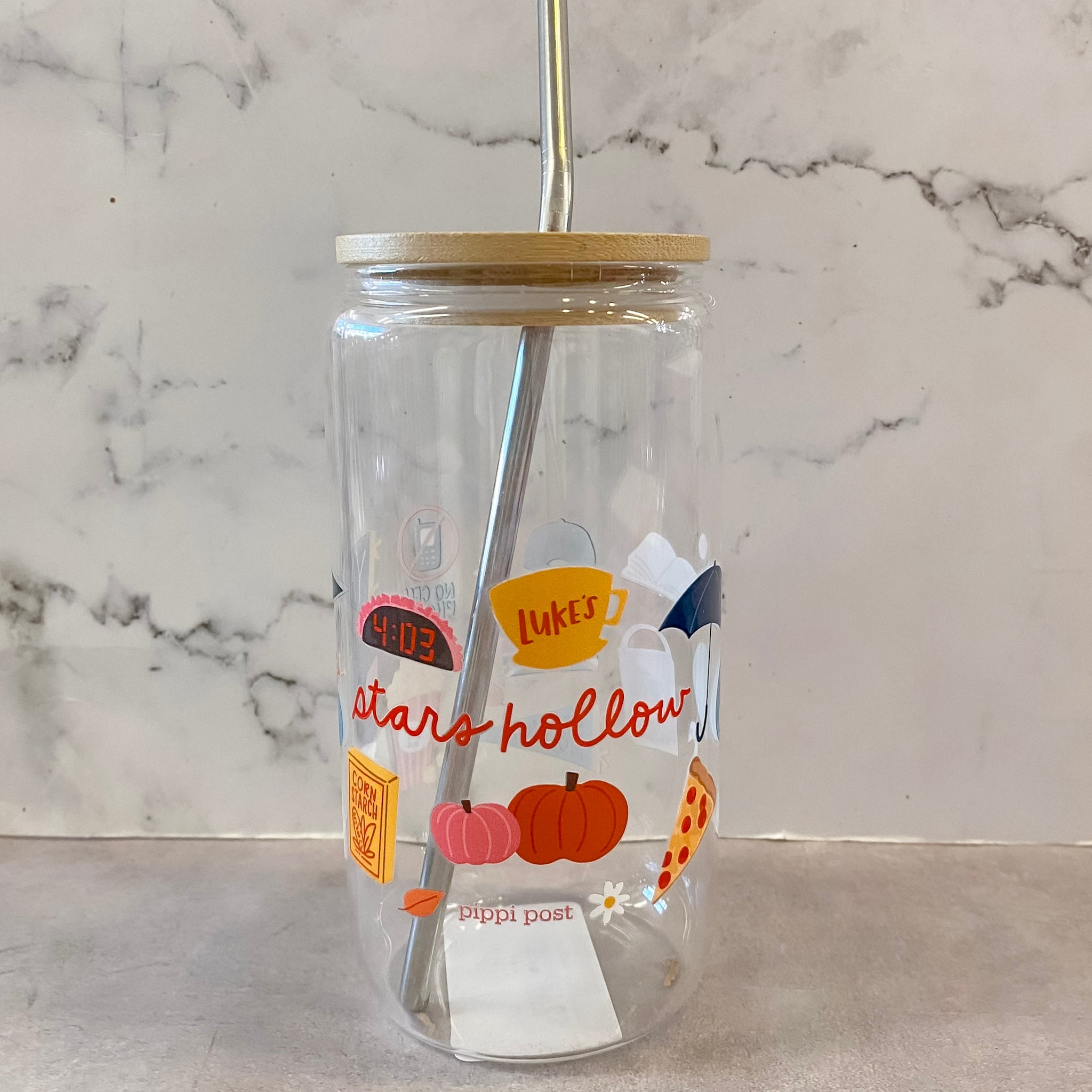 Bring a piece of Stars Hollow to your beverage with our Stars Hollow in the Fall Glass Can! Featuring charming hand-illustrated icons from Gilmore Girls, including a Yale banner, pumpkins, a book, umbrella, swan, pizza, and more, this glass can captures the cozy spirit of the beloved show. Whether you're sipping your morning coffee, afternoon tea, or a refreshing sparkling water, let the nostalgia of Stars Hollow accompany you. Ideal for Gilmore Girls fans or anyone who loves small-town charm, our Stars Hollow in the Fall Glass Can makes a great gift for birthdays, holidays, or any special occasion.