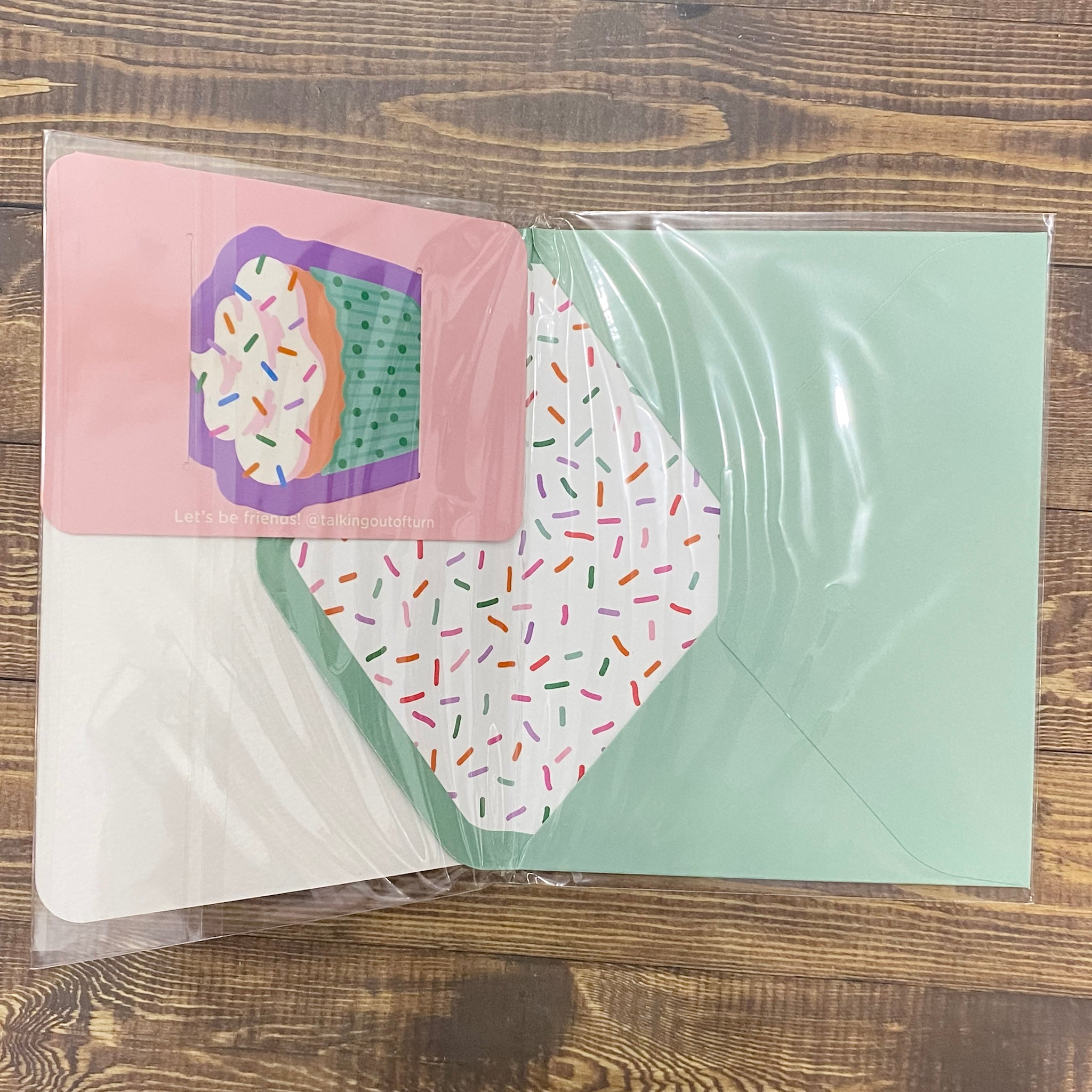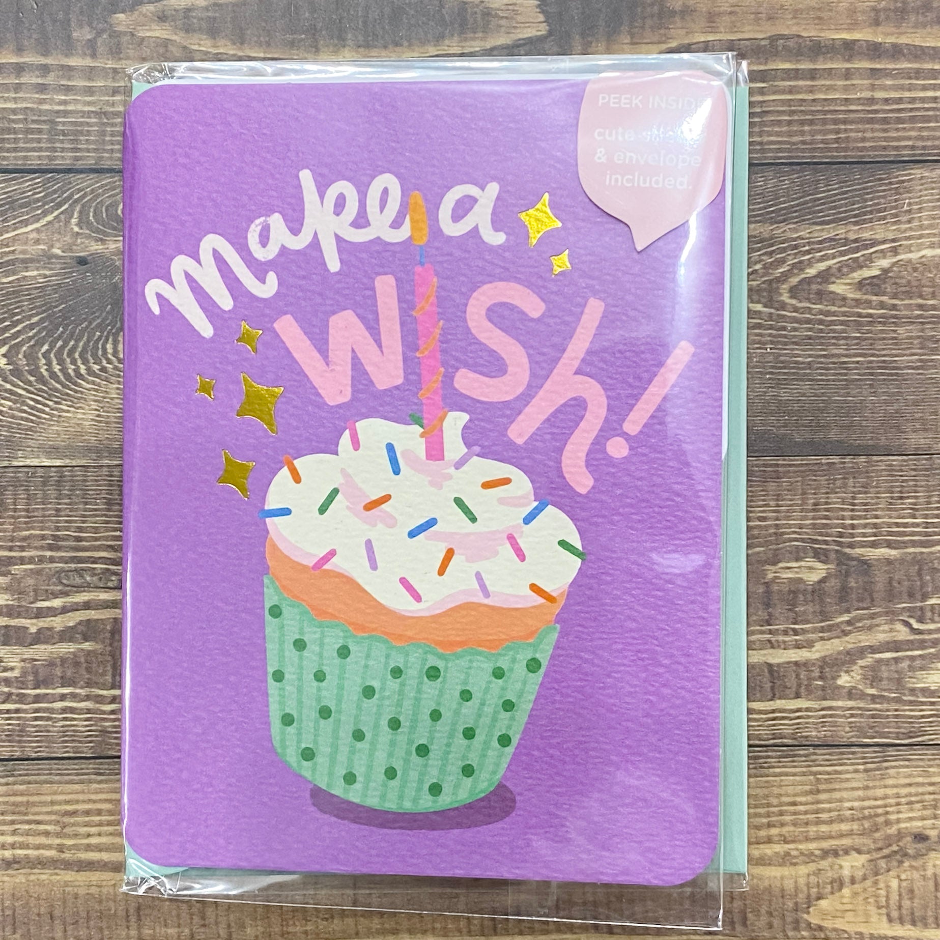 A charming purple greeting card featuring a delightful cupcake illustration topped with swirled frosting and colorful sprinkles. The design is completed with whimsical lettering that reads “Make a Wish.” Sweet, celebratory, and perfect for any birthday moment.