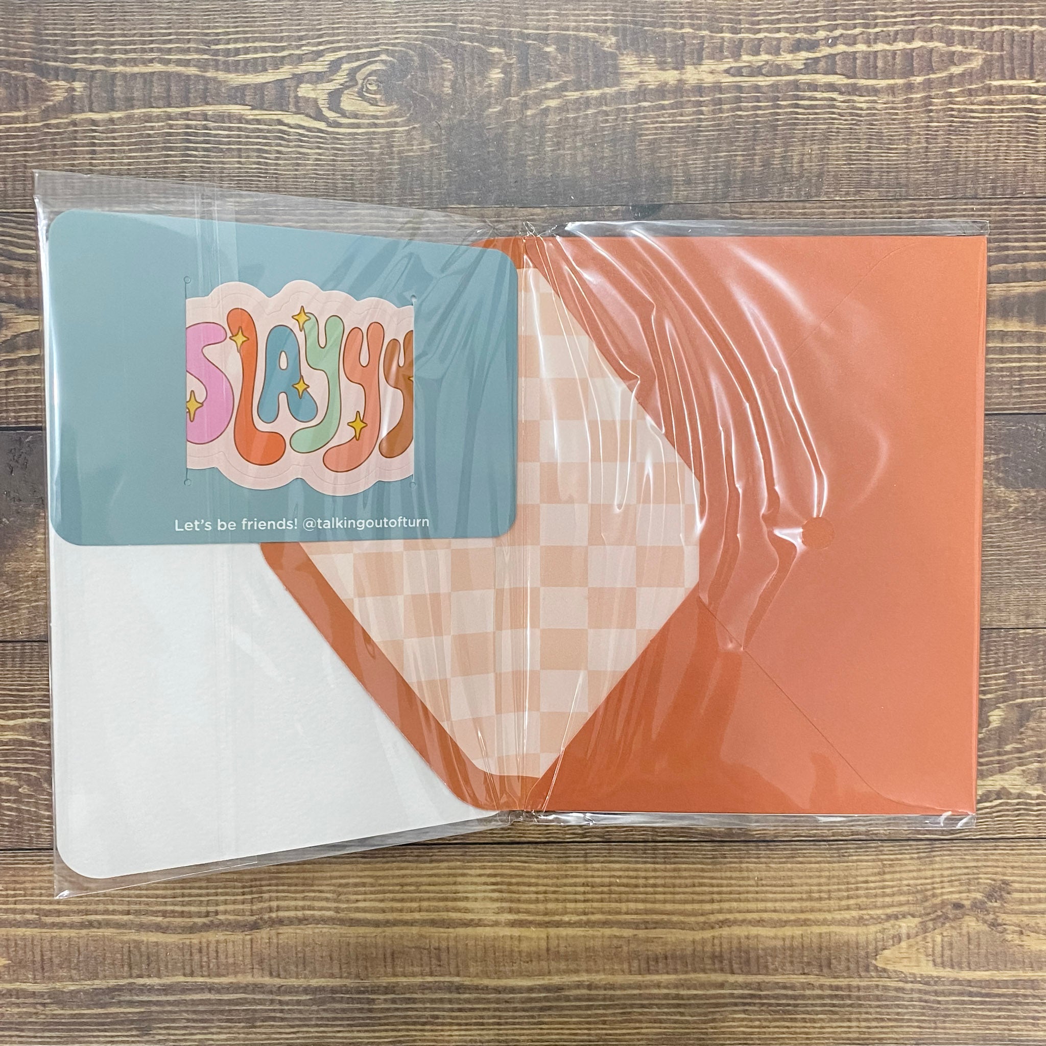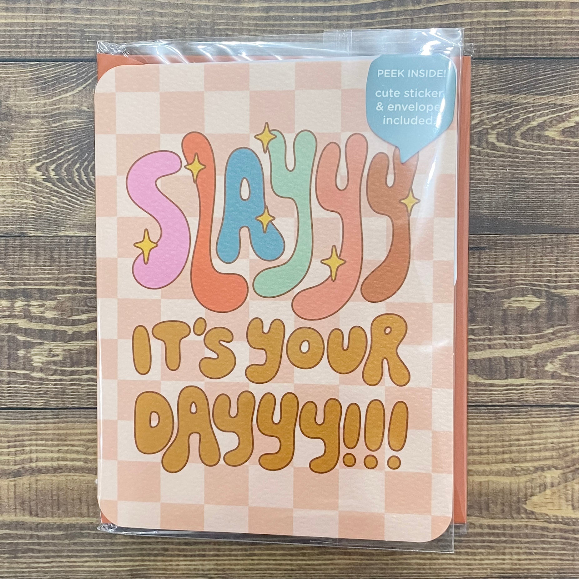 A stylish pink checkered greeting card adorned with bold, colorful bubble letters that read “Slay, It’s Your Day.” The playful typography and vibrant pattern create a fun, confident vibe—perfect for celebrating anyone who deserves to shine on their special day.