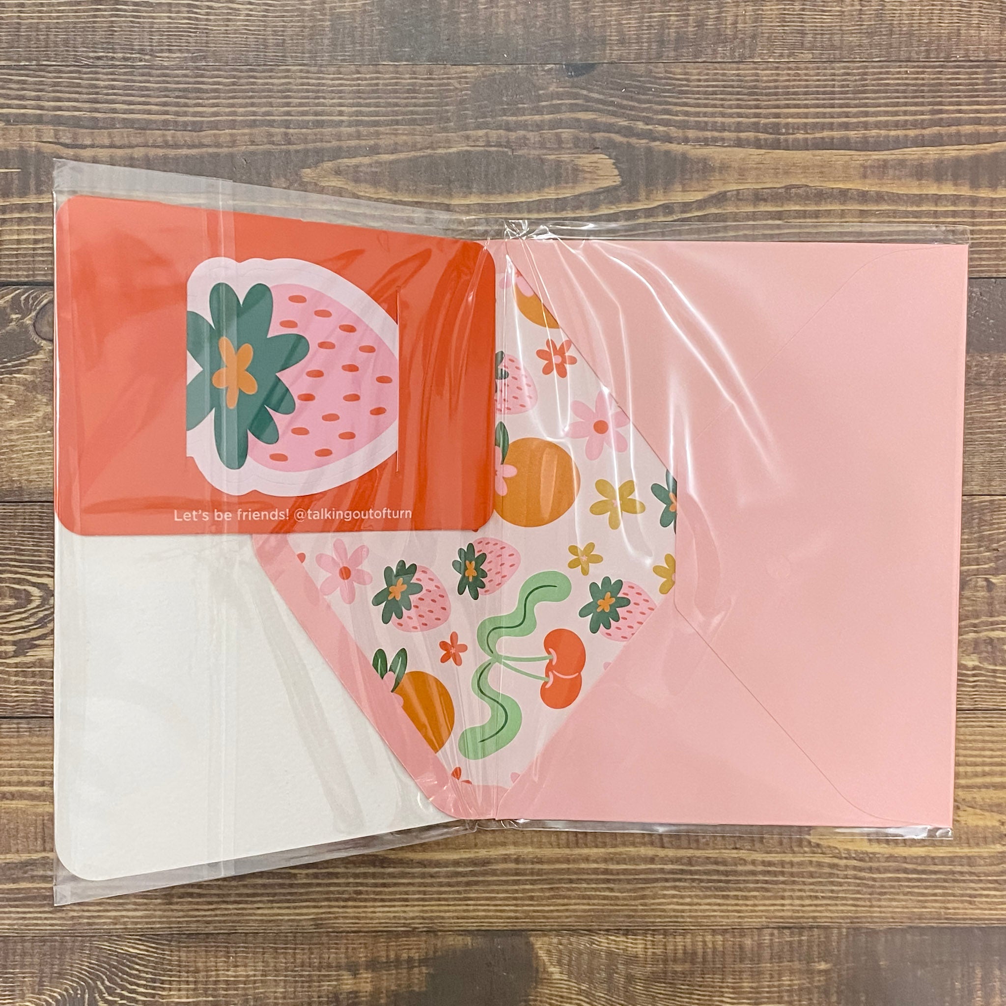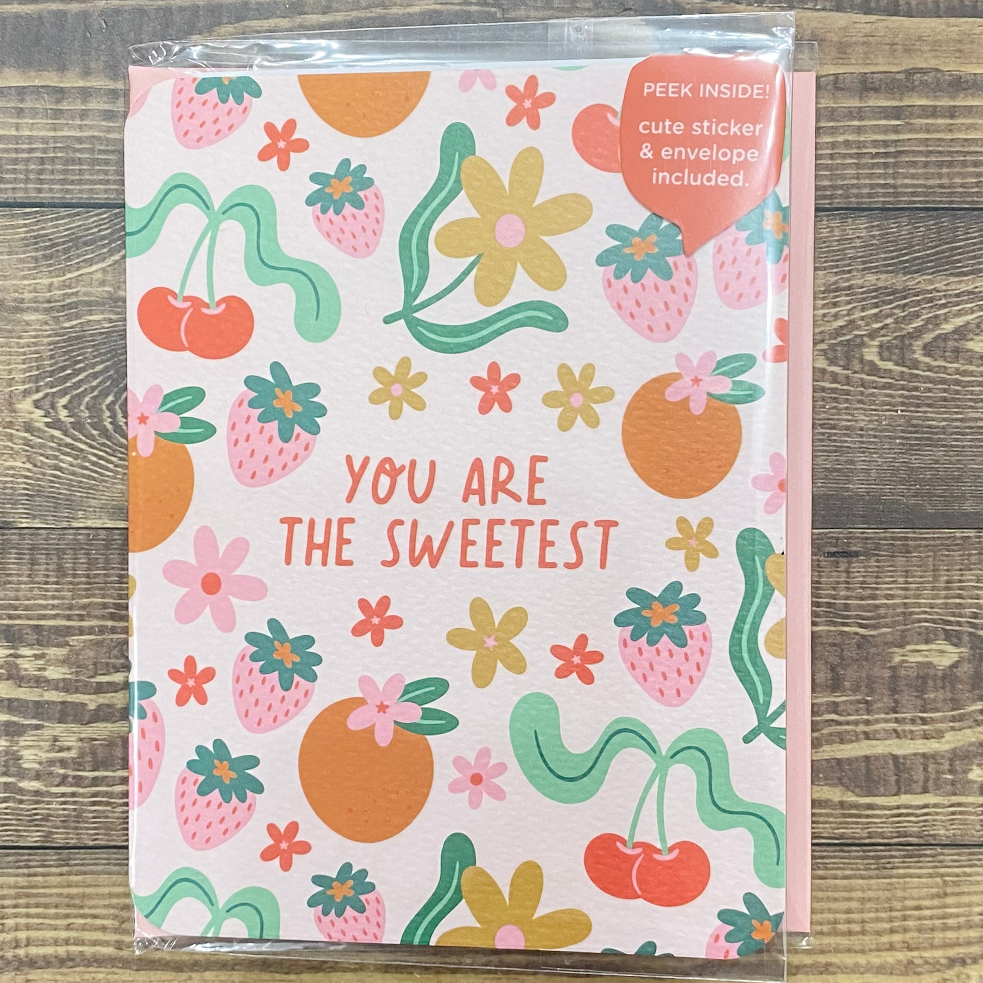A pink, colorful, and delightfully eccentric card decorated with an assortment of playful fruit illustrations. Bold, cheerful lettering reads “You Are the Sweetest,” perfectly matching the card’s bright, fruity charm. Ideal for sending a sweet compliment to someone you appreciate.