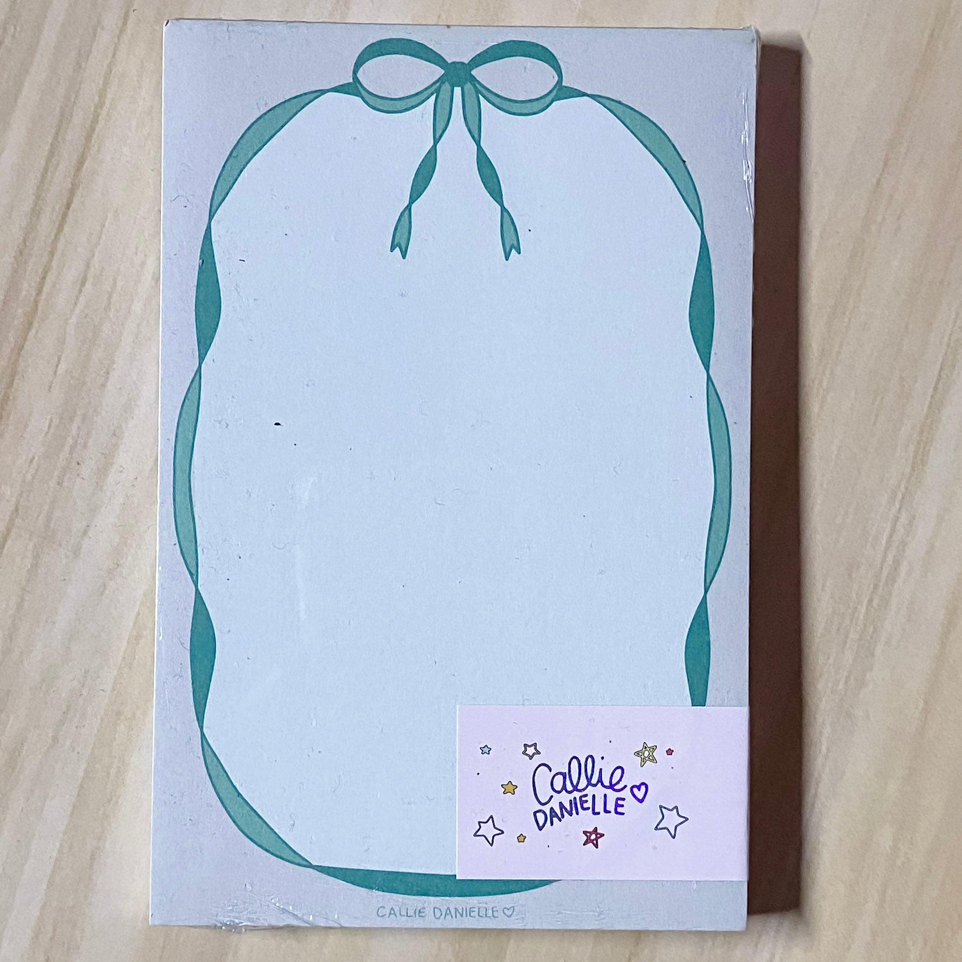 Stay organized in style with the Green Coquette Bow 4x6 Notepad. This beautifully designed notepad features a delicate hand-drawn bow border in a lovely green shade, making it a must-have for list-making, journaling, or daily planning. A great gift for coquette aesthetic fans and stationery lovers alike!