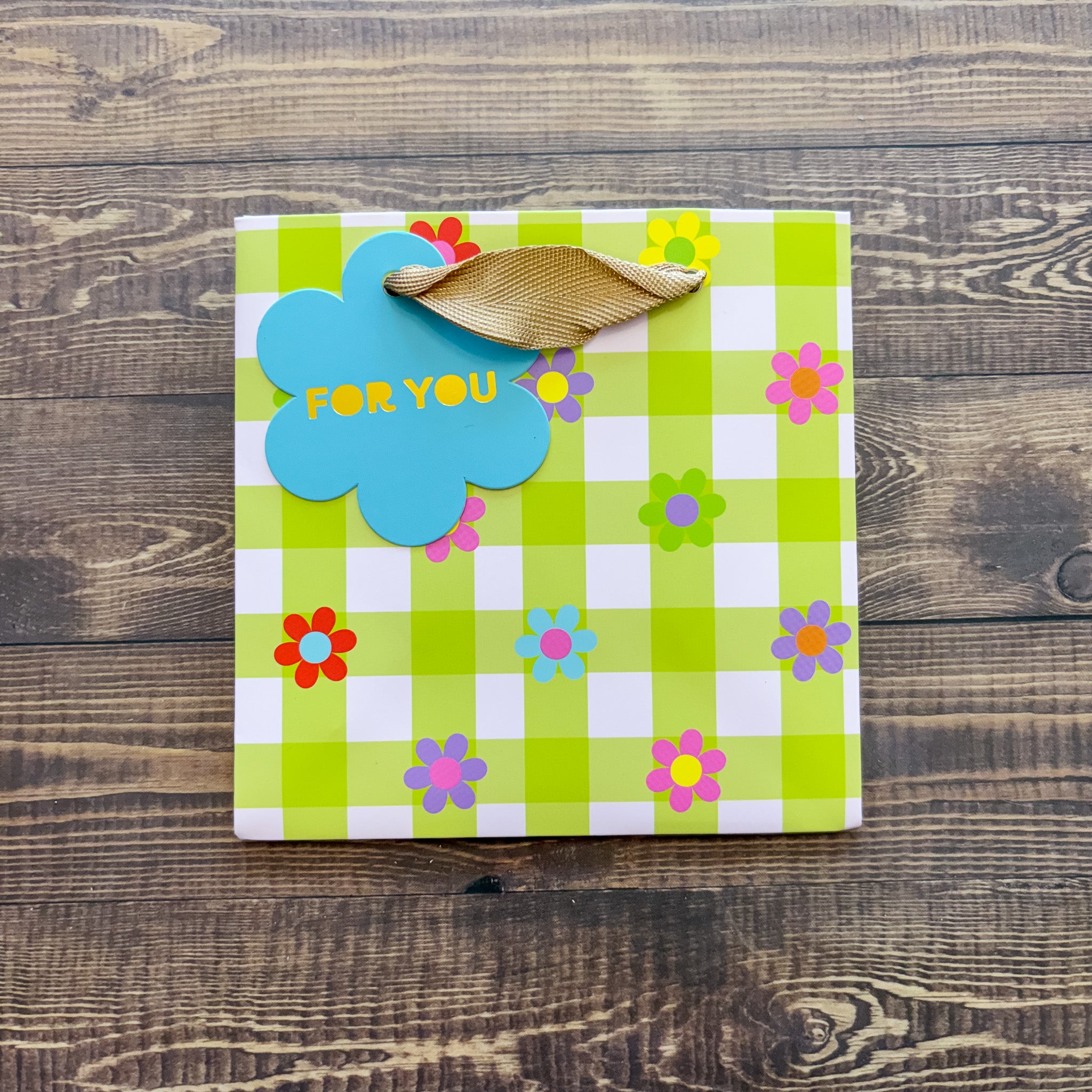 Green gingham and floral pattern printed on gift bag