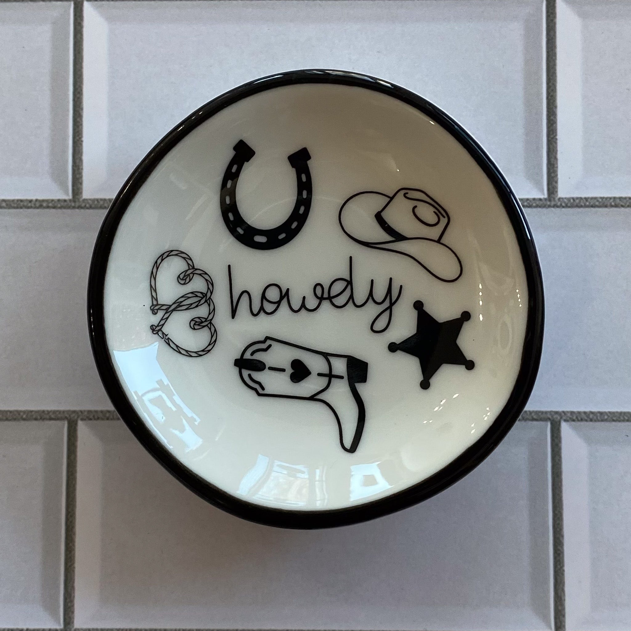 Saddle up your jewelry and greet the day in style. A ceramic ring dish stamped with “Howdy”. Perfect for keeping rings, earrings, or small keepsakes organized with a touch of rustic charm.