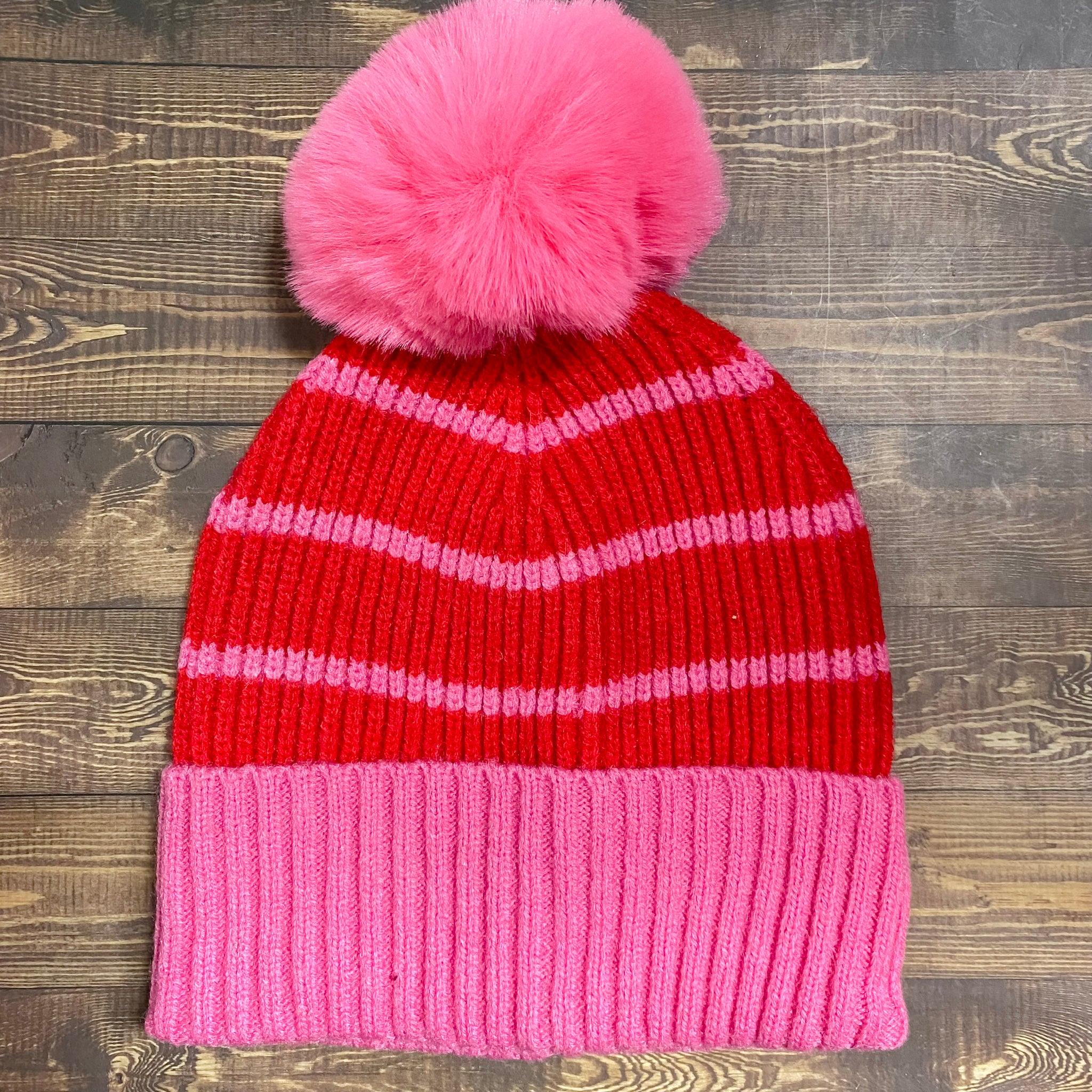 Top off your winter look with the Allison Beanie, a colorful knit hat that’s full of charm. Featuring bold stripes, a chunky ribbed cuff, and an oversized top pom, this beanie adds a fun twist to any cold-weather outfit. The soft knit keeps you warm and cozy, while the playful palette keeps your vibe bright even on gray days. Whether you're bundling up or just heading out for errands, this hat is the cherry on top.