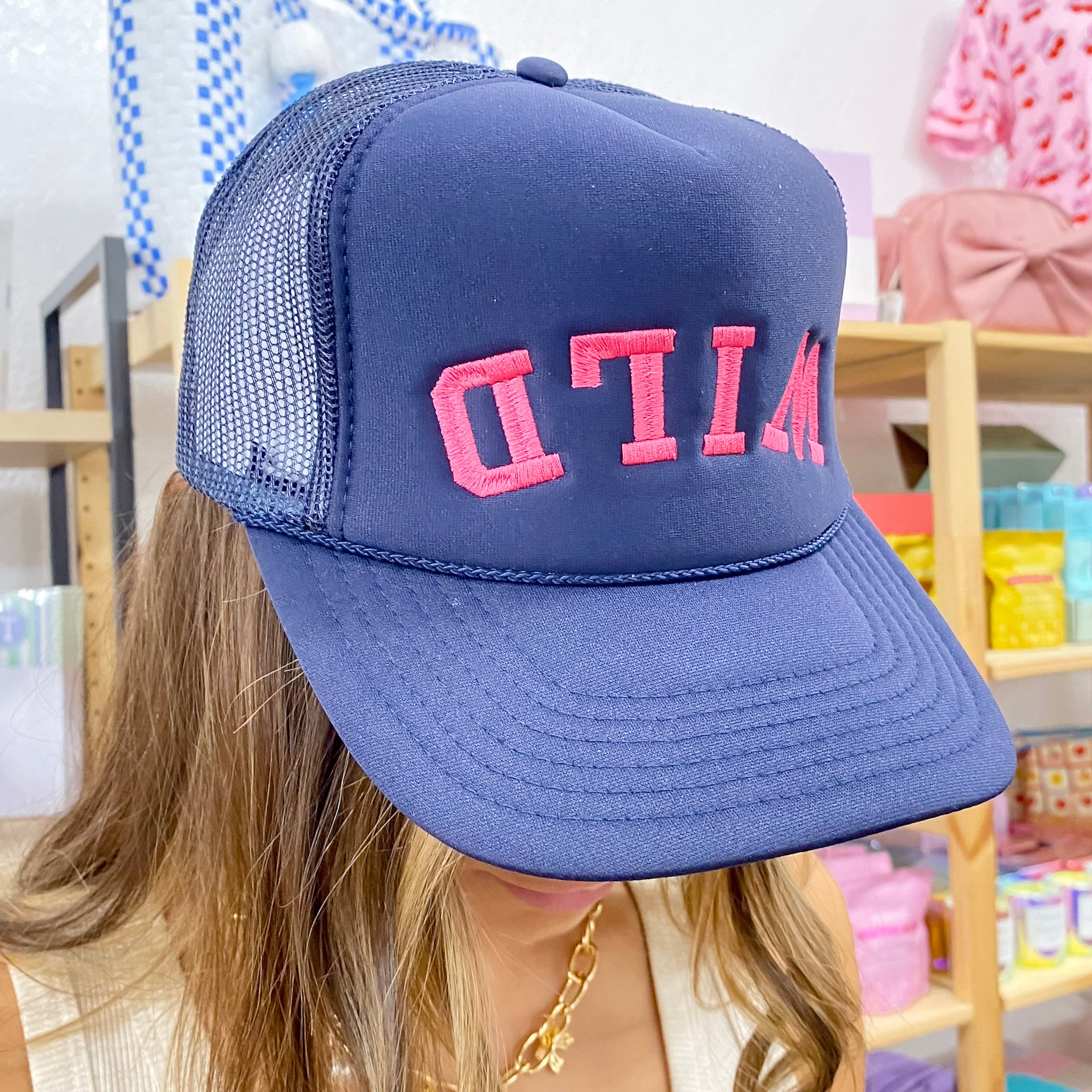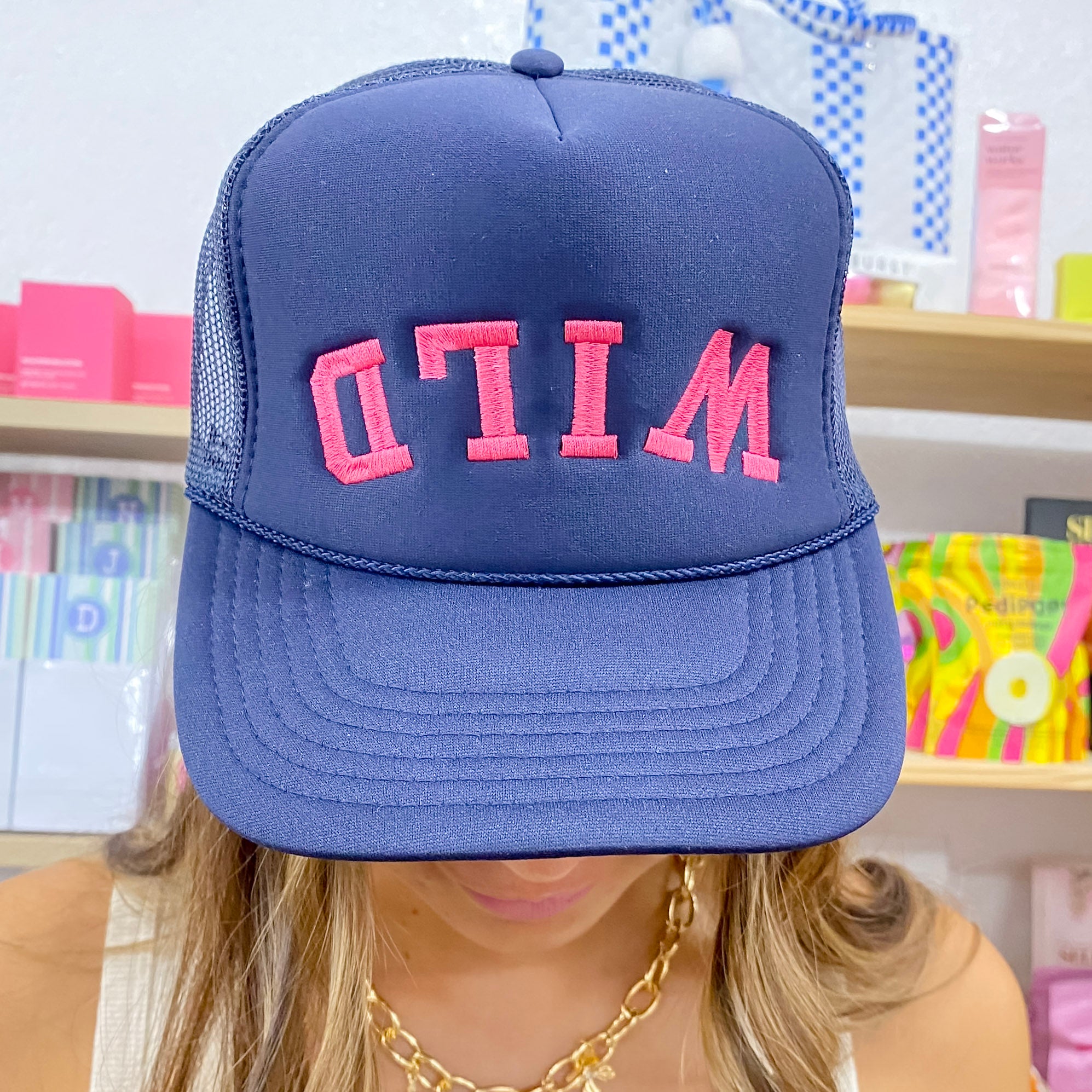 A navy trucker hat with the word WILD embroidered in bright pink, playfully stitched upside down across the front. Designed with a breathable mesh back and adjustable snap closure, it’s a bold and fun twist on a classic cap.