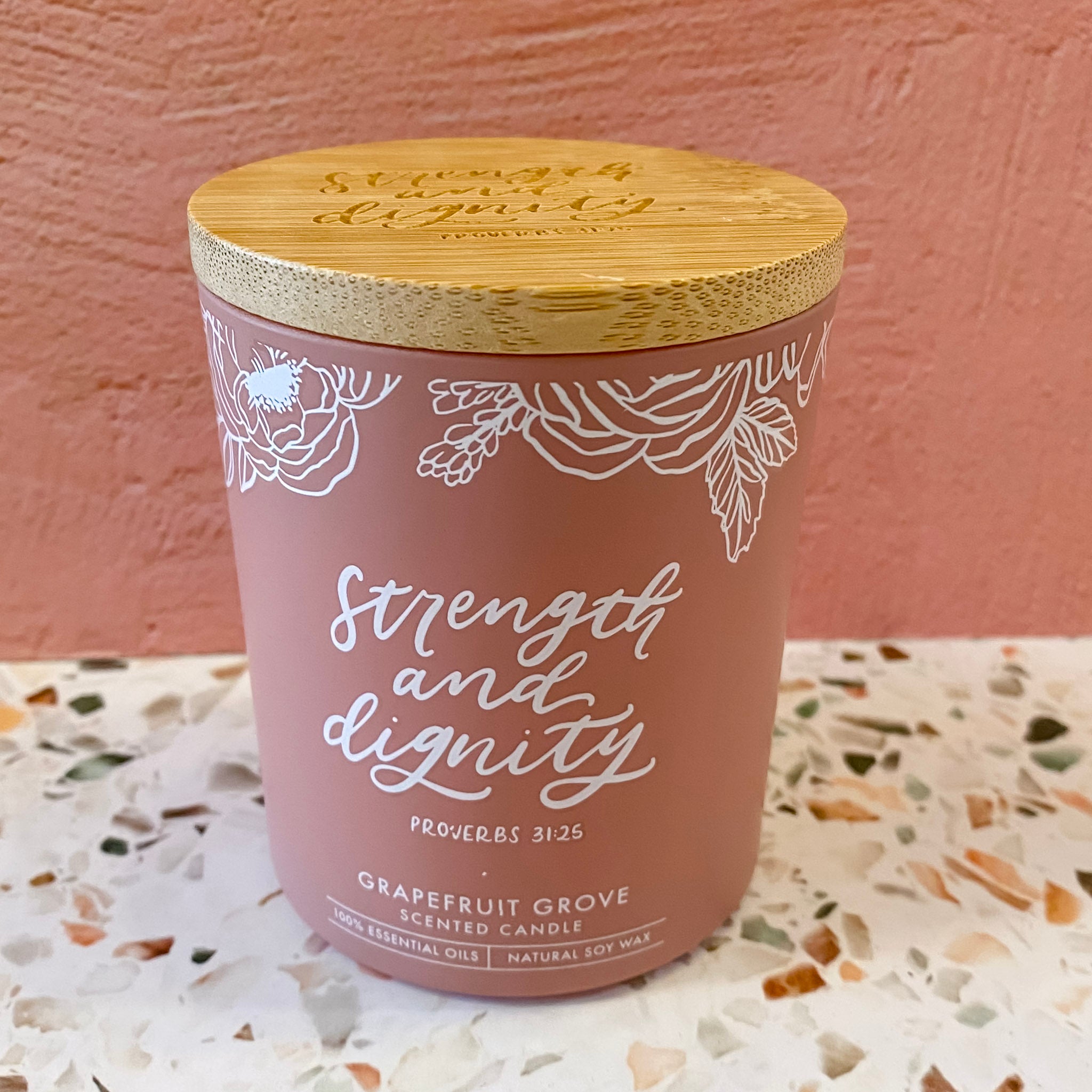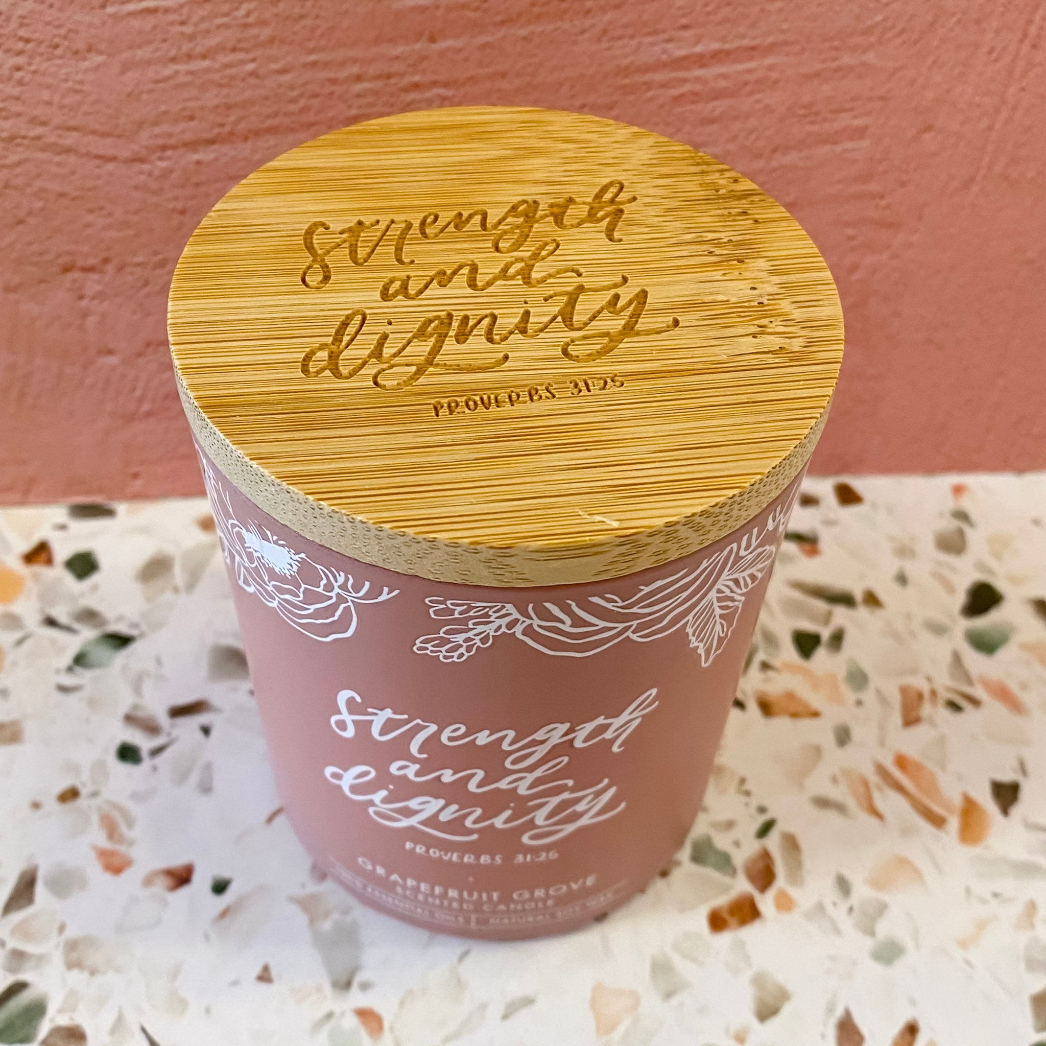 Strength and Dignity Grapefruit Scented Candle in a Peach Glass Jar