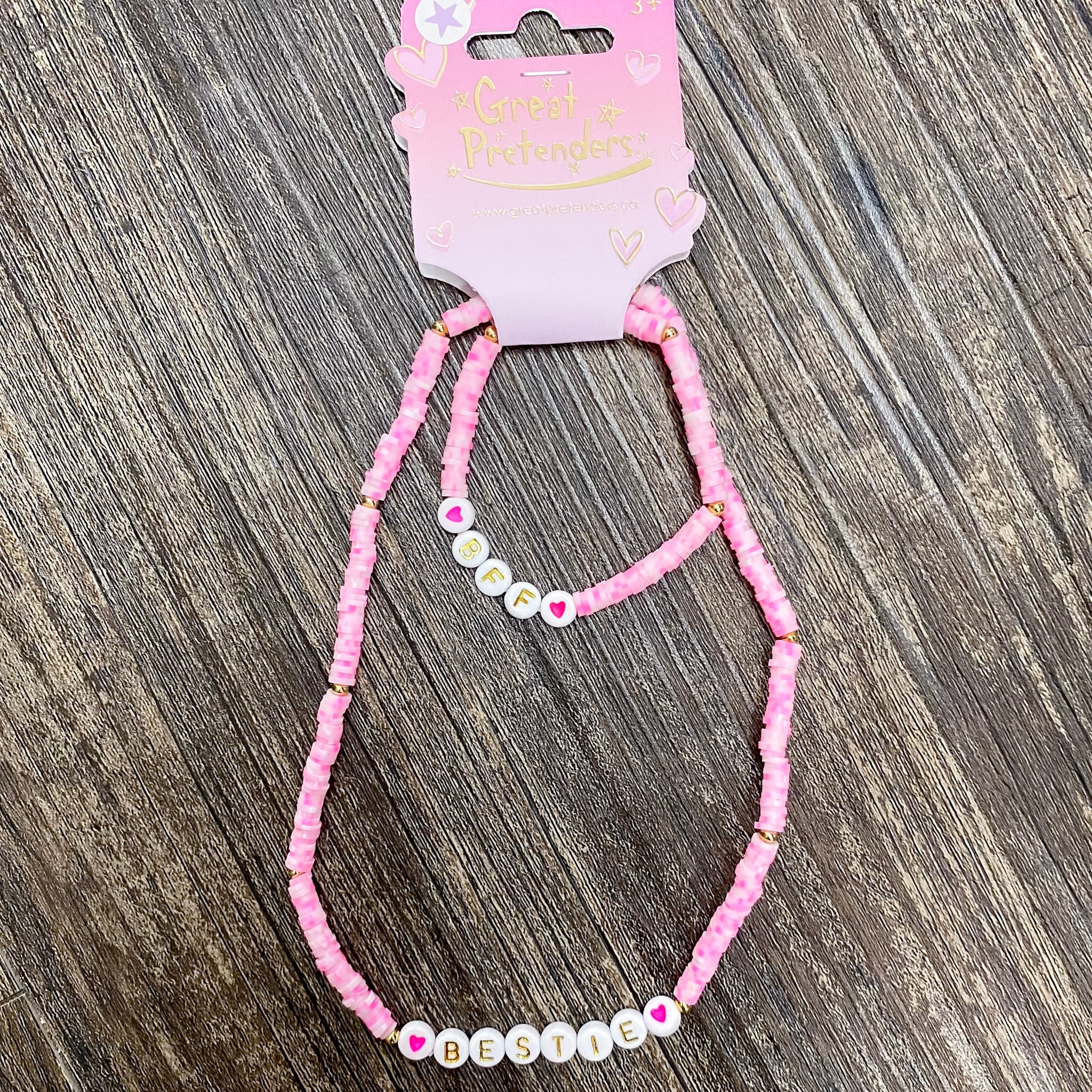 Celebrate friendship with this adorable bestie bracelet and necklace set! Featuring pretty pink beads accented with shiny gold beads in between, each piece is a fun way for kids to match with their best friend. Stretchy, lightweight, and a comfortable wear. This set is a cheerful reminder of the special bond between besties!
