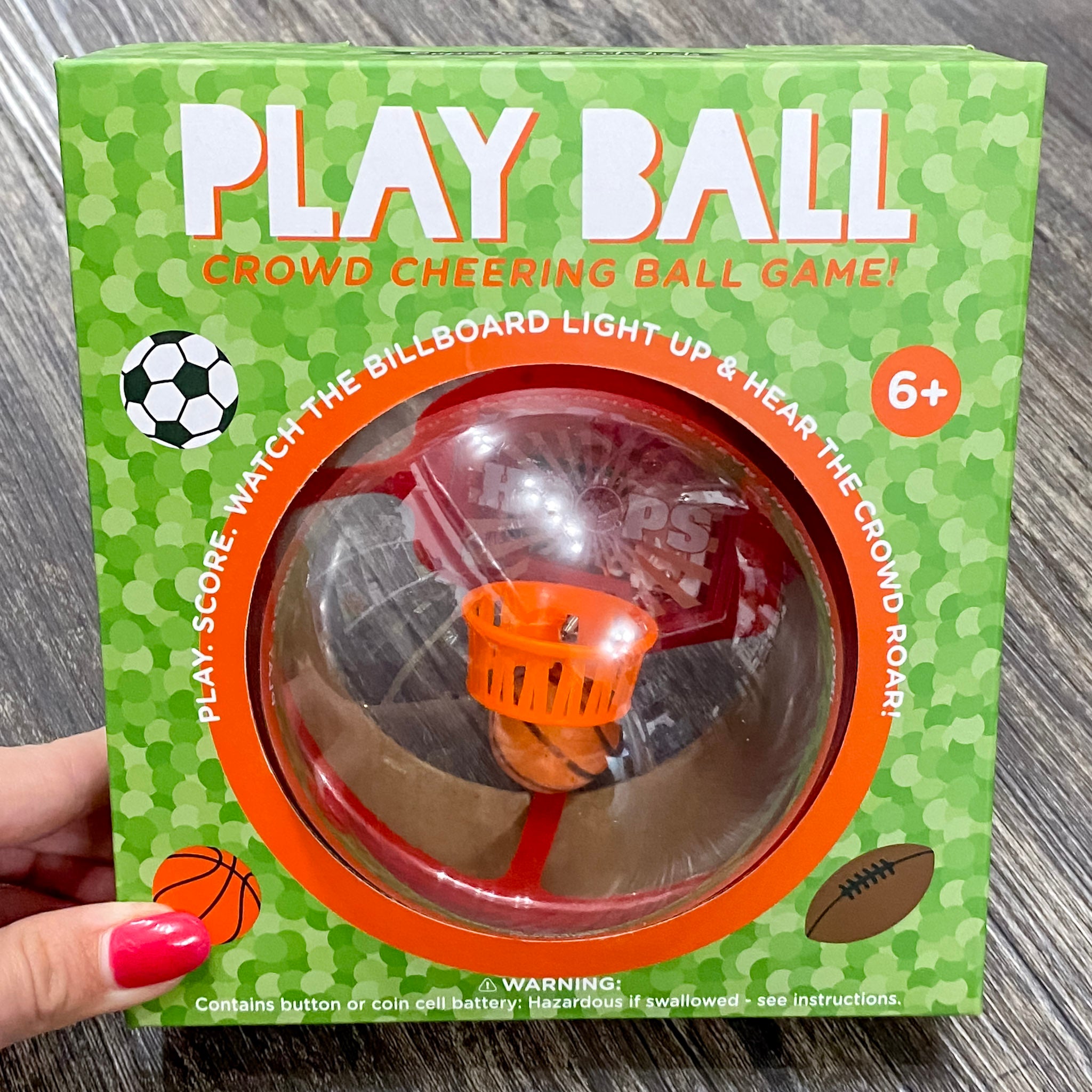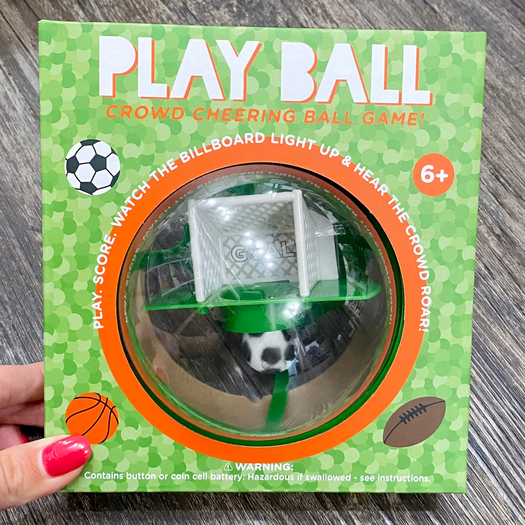 Our lights and sound Play Ball is the perfect game for any sports enthusiast! Once you start playing, you will not be able to stop. Move the ball around to score and when you do lights and sound will cheer you on! Chose from basketball, football, or soccer game.
