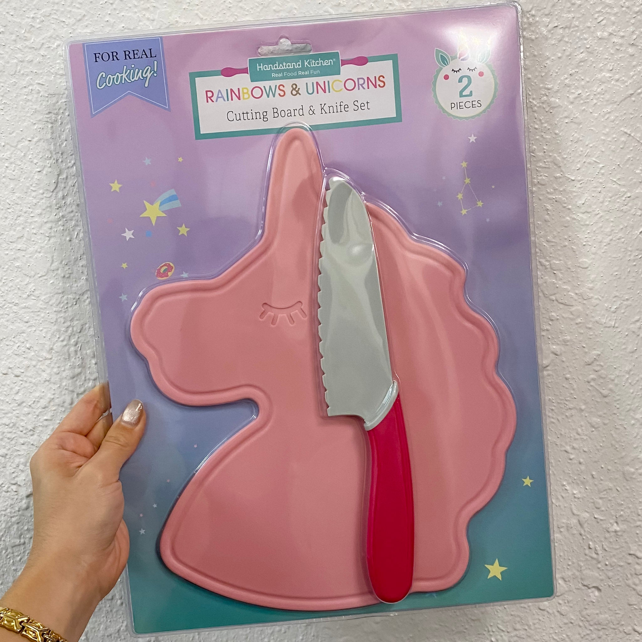 Includes: 1 medium serrated knife and 1 unicorn-shaped cutting board.