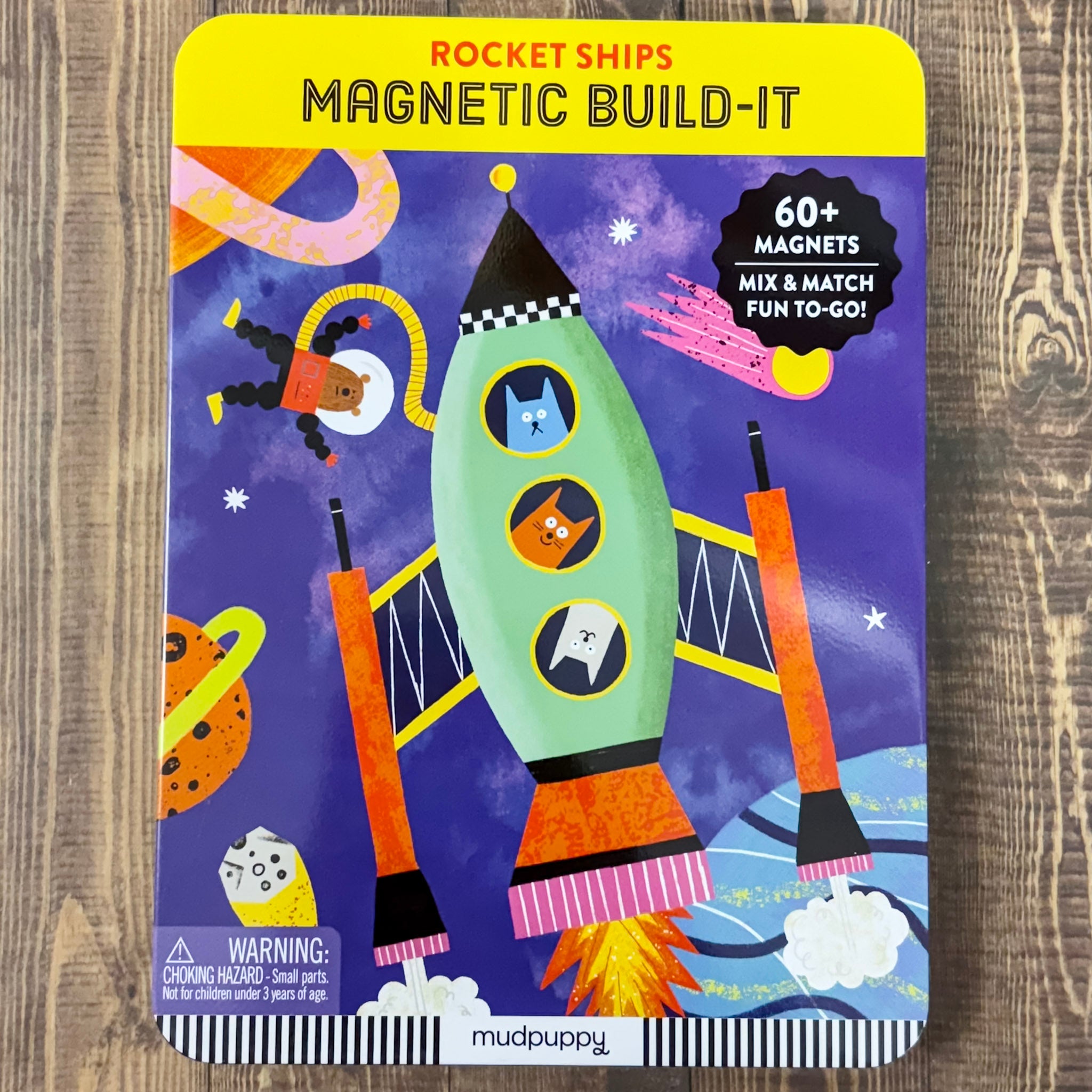 The Rocket Ships Magnetic Build-It set comes with 2 illustrated magnetic build surfaces and 3 sheets of mix and match magnetic shapes, all stored in a sturdy hinged tin.