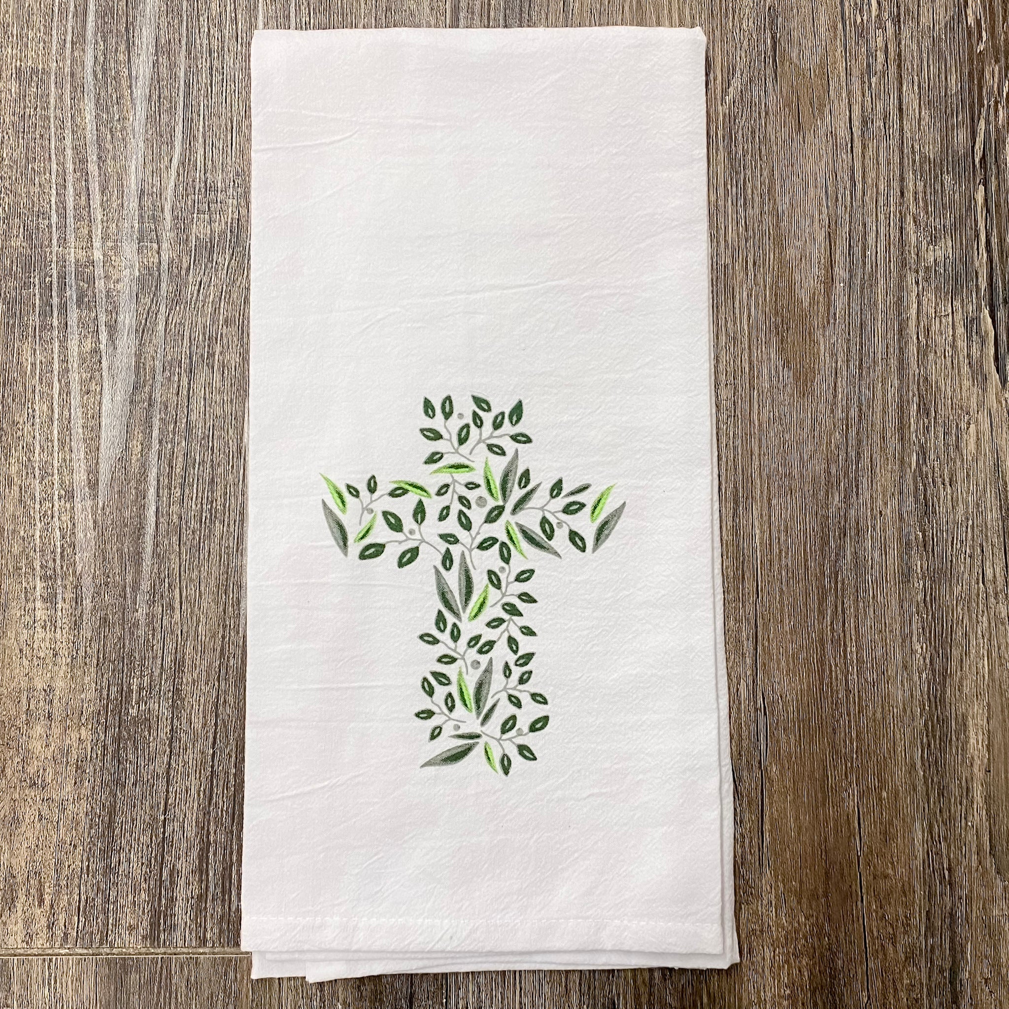 Perfect for a new homewoner, this white hand towel features a cross made out of branches at the bottom.