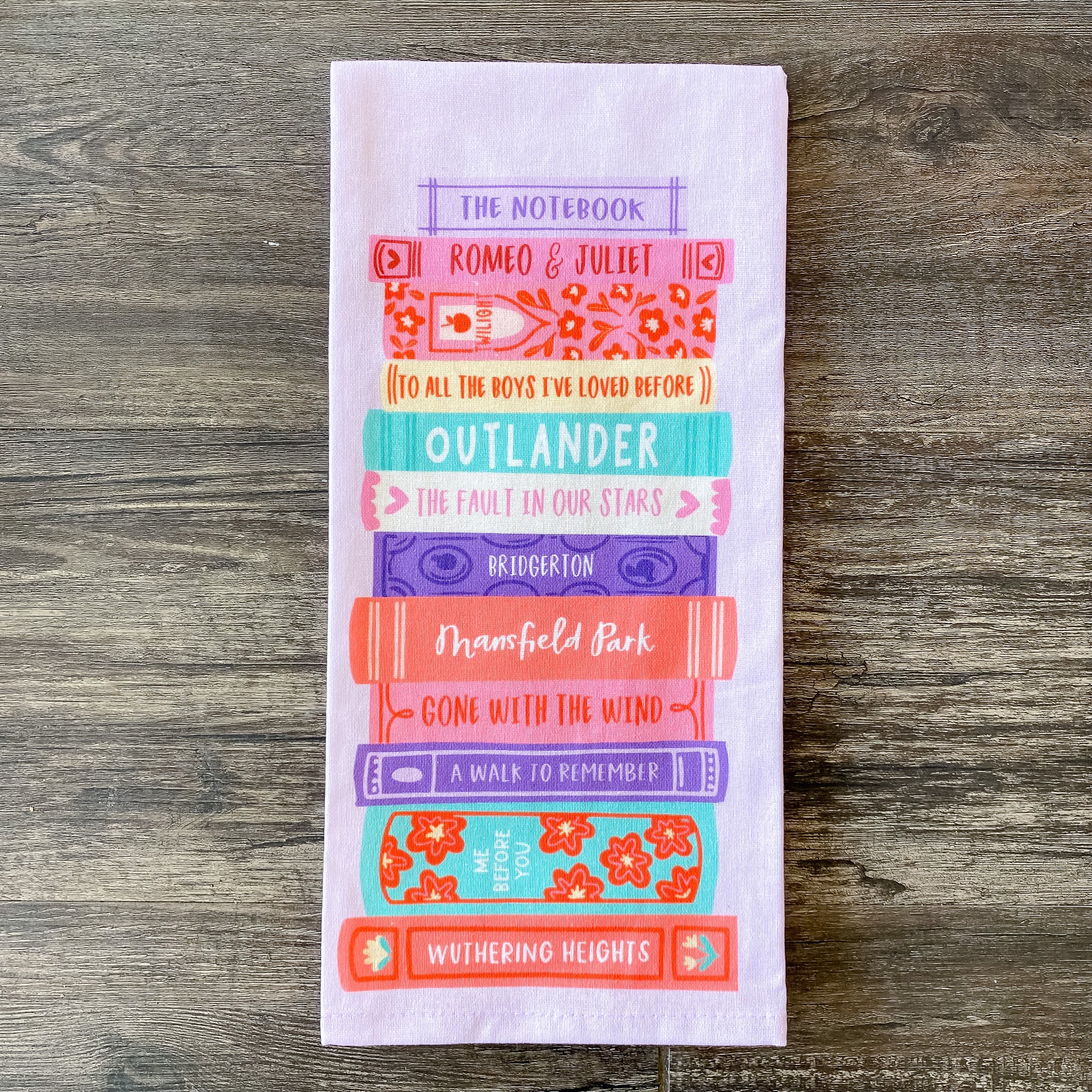 Indulge in a bit of literary romance with our Romance Novels Tea Towel! Featuring a hand-illustrated book stack design of beloved romantic novels, including The Notebook, Twilight, Outlander, The Fault in Our Stars, Mansfield Park, A Walk to Remember, Wuthering Heights, and more, this towel is a must-have for book lovers and romantics alike. Whether you're drying dishes or simply adding a touch of literary charm to your kitchen, this tea towel brings a dash of passion and excitement to every task. Ideal for romance enthusiasts or anyone who loves a good love story, our Romance Novels Tea Towel makes a great gift for birthdays, anniversaries, or any occasion. Let these timeless tales of love and adventure inspire you as you go about your day!
