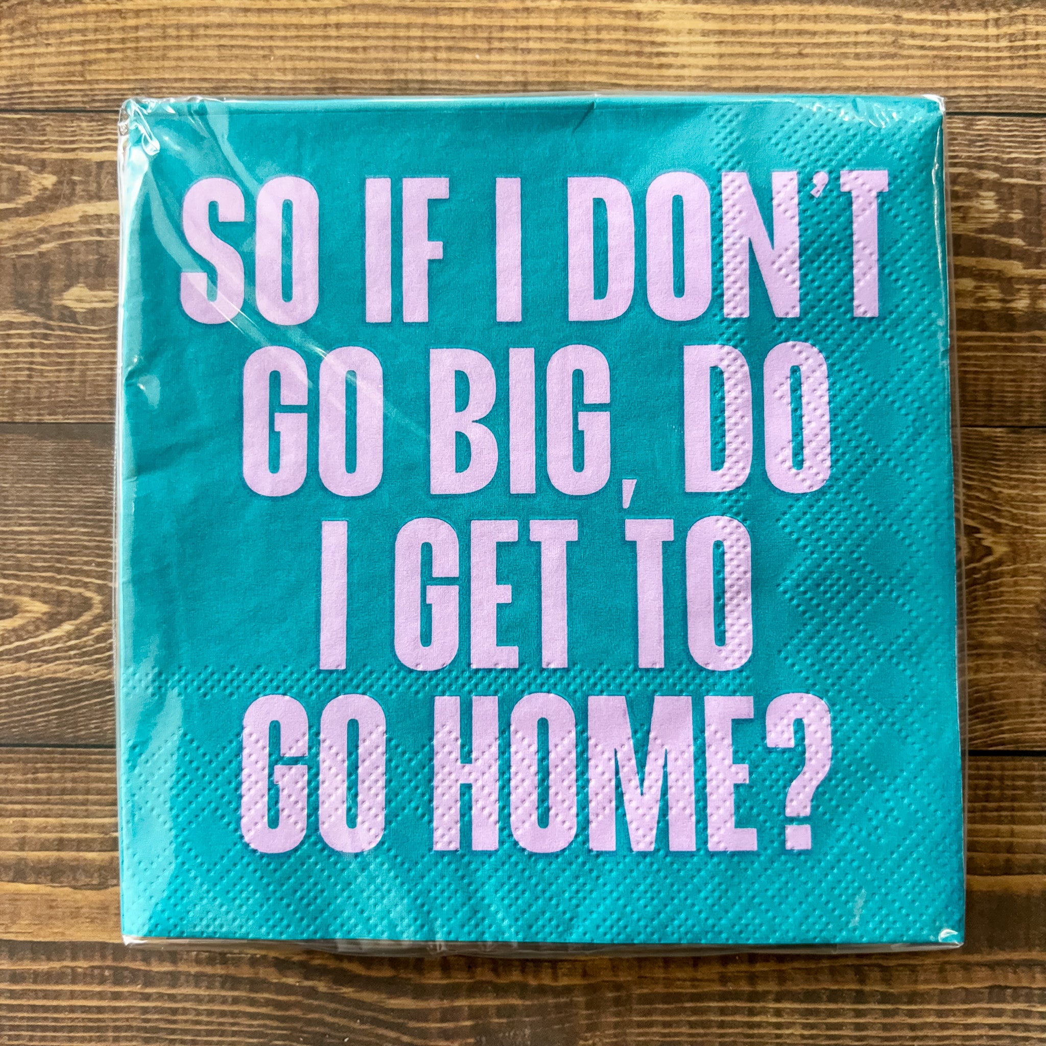 Funny Cocktail Napkin | Go Big Go Home If I Don't Go Big Do I Get to Go Home These colorful and funny paper cocktail napkins are perfect for tabletop decoration. These party napkins are thick, soft and absorbent and help in cleaning stains and spills with great ease. You can use these funny paper napkins for any gathering or party. The fun design on the napkins makes them a fit for any occasion. Great gift for any fun loving hostess, friend, family member or co-worker.