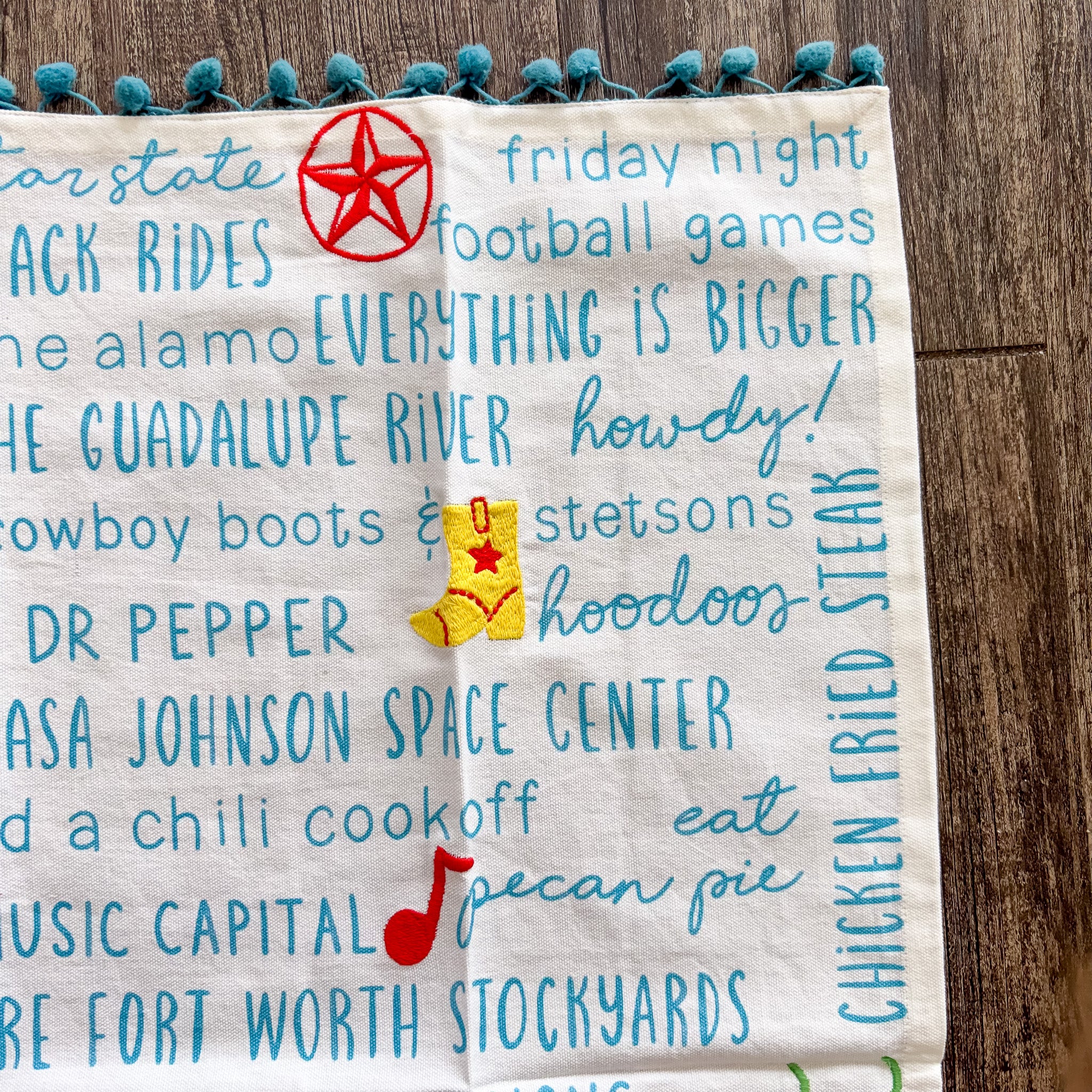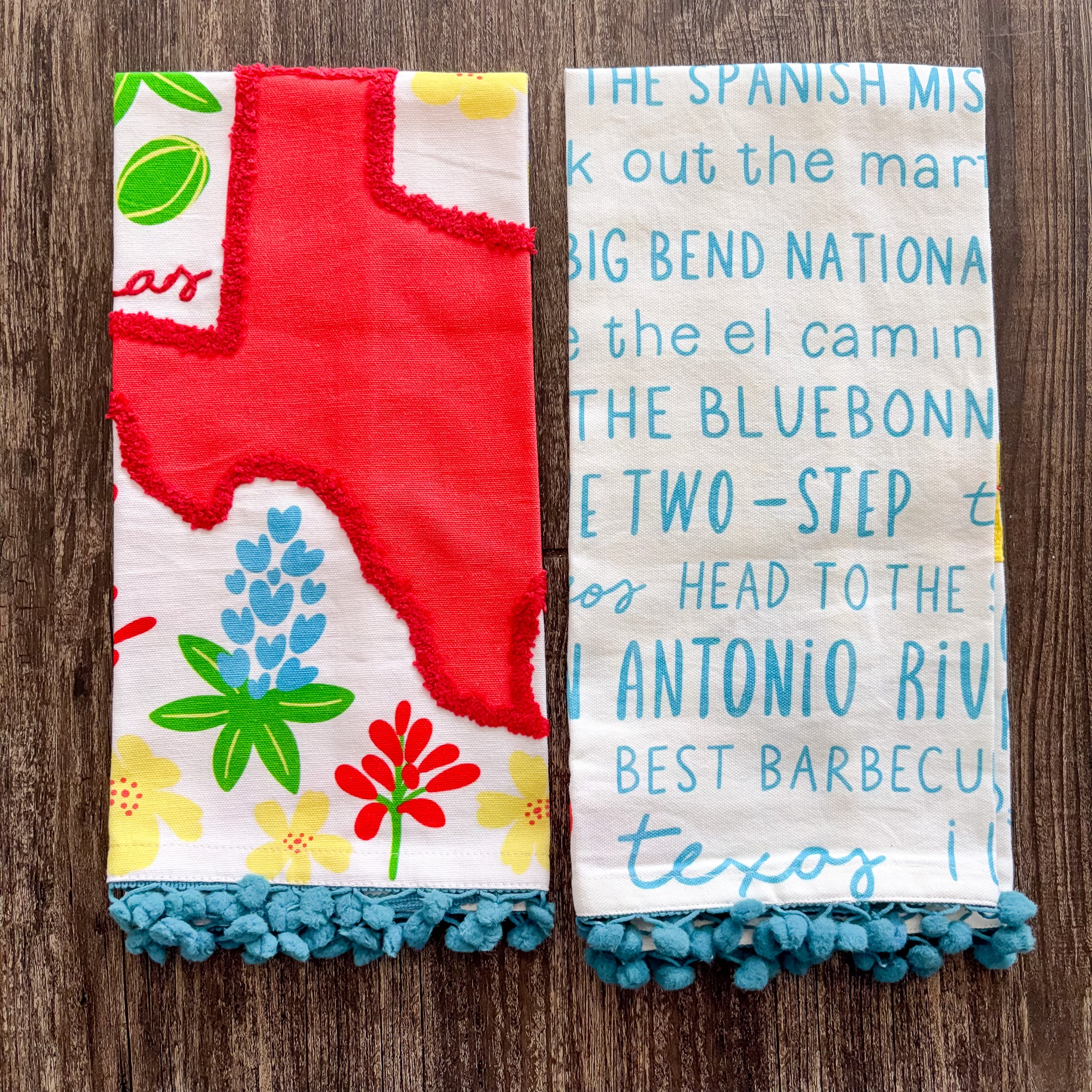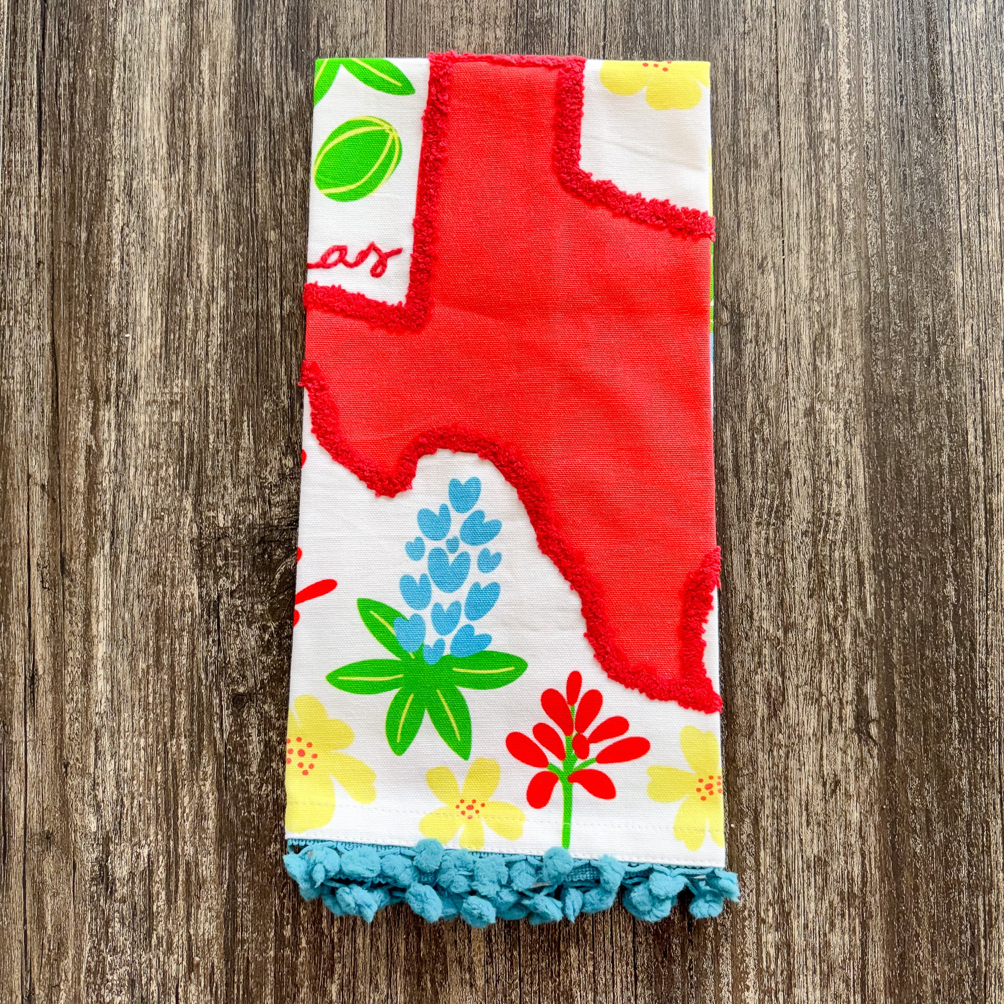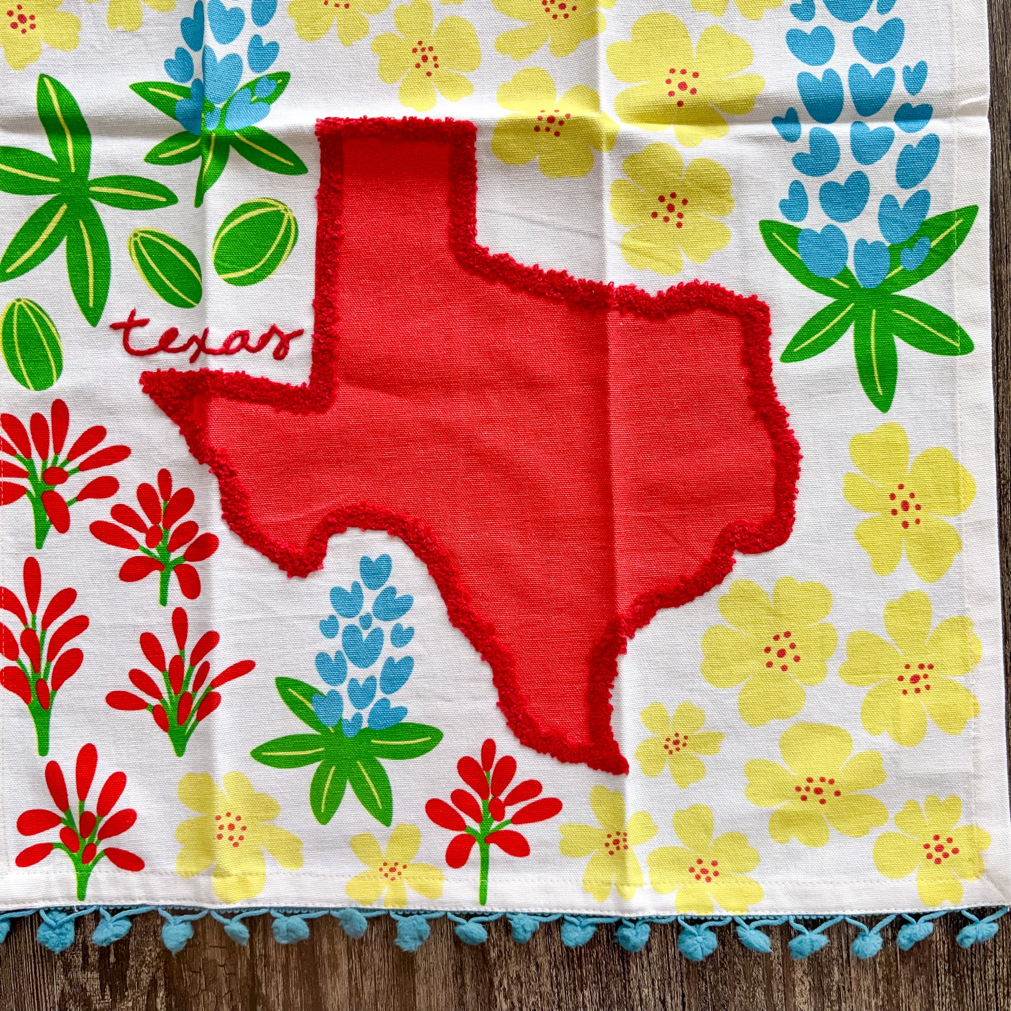 Texas In Bloom Pom Pom Tea Towel - Red State is backordered and will ship as soon as it is back in stock.