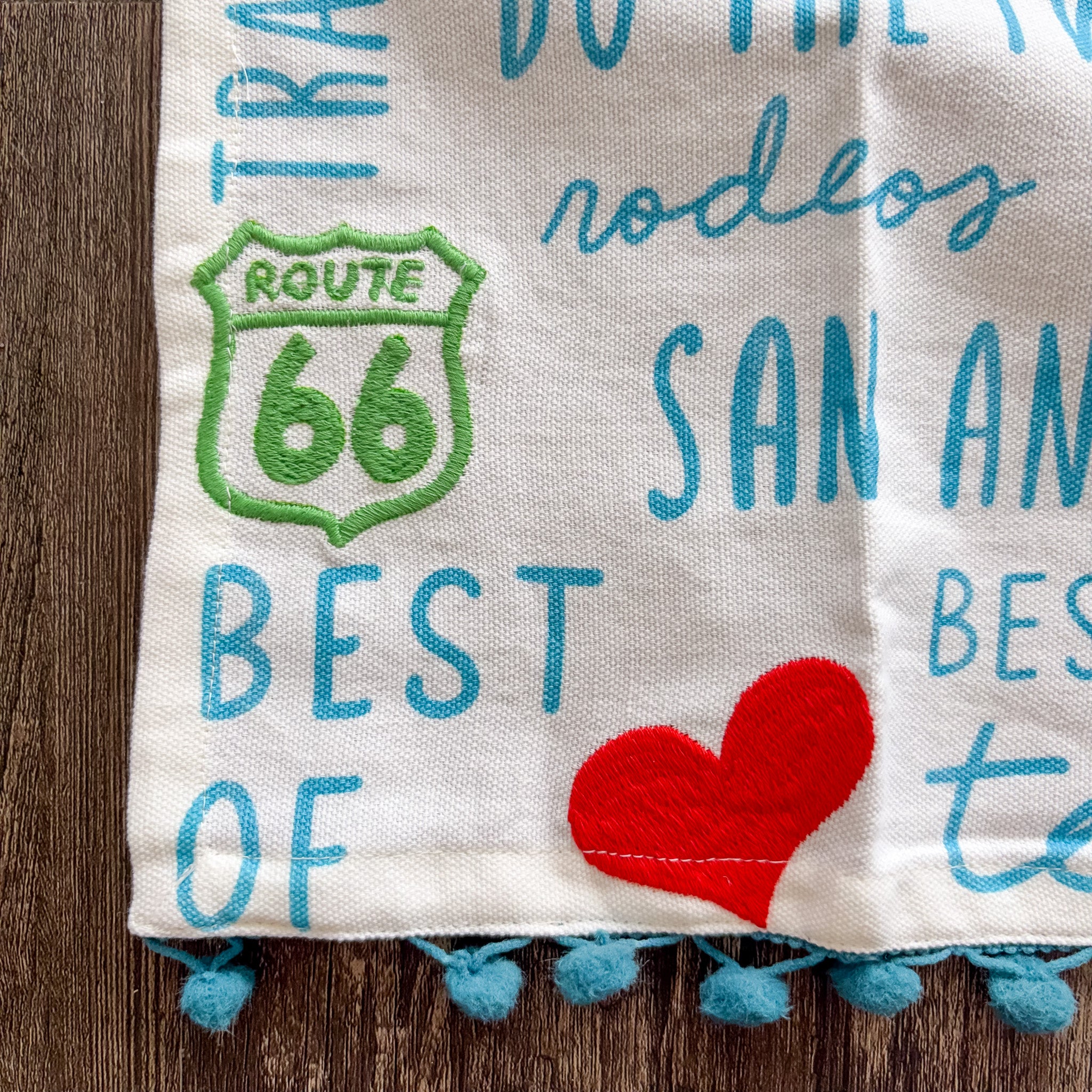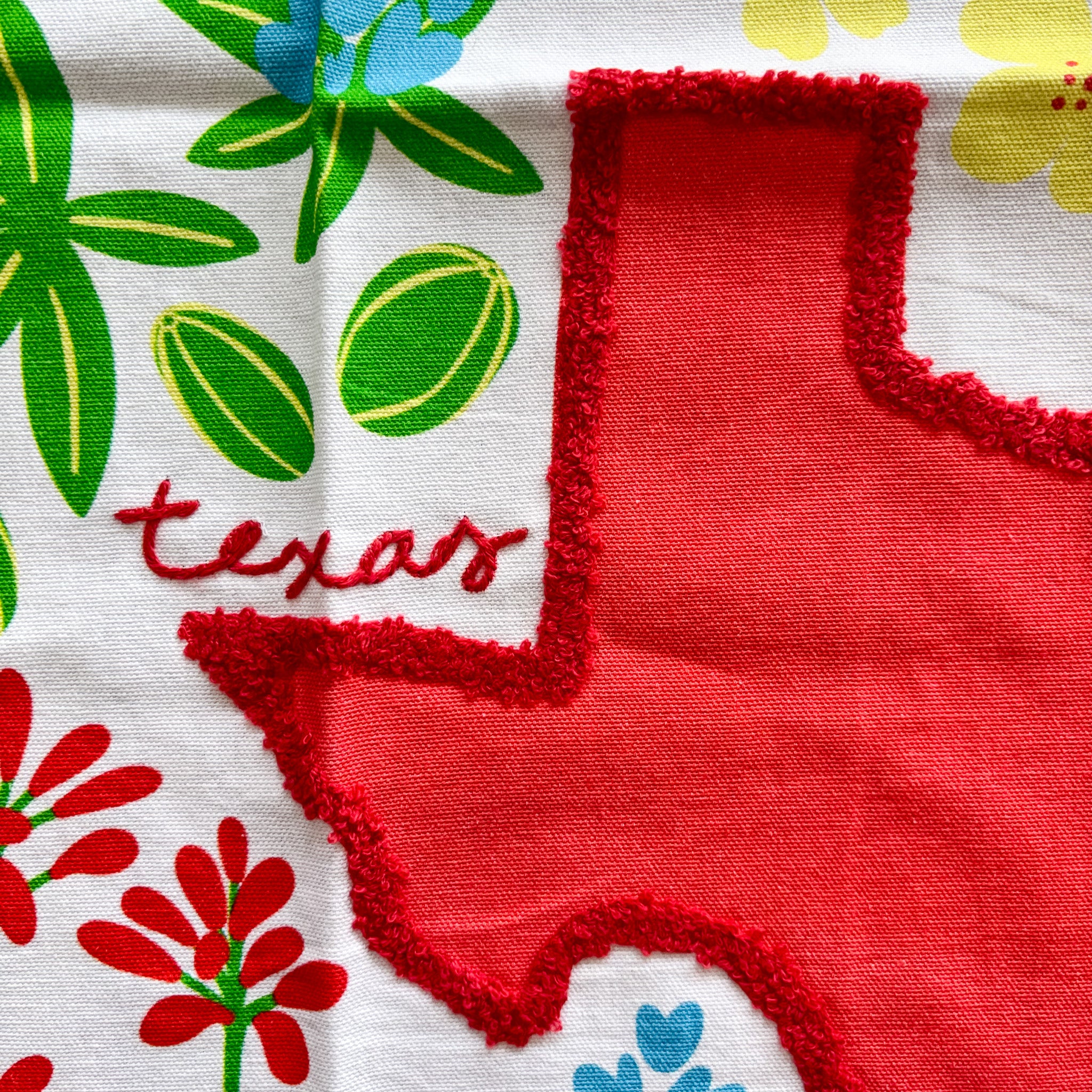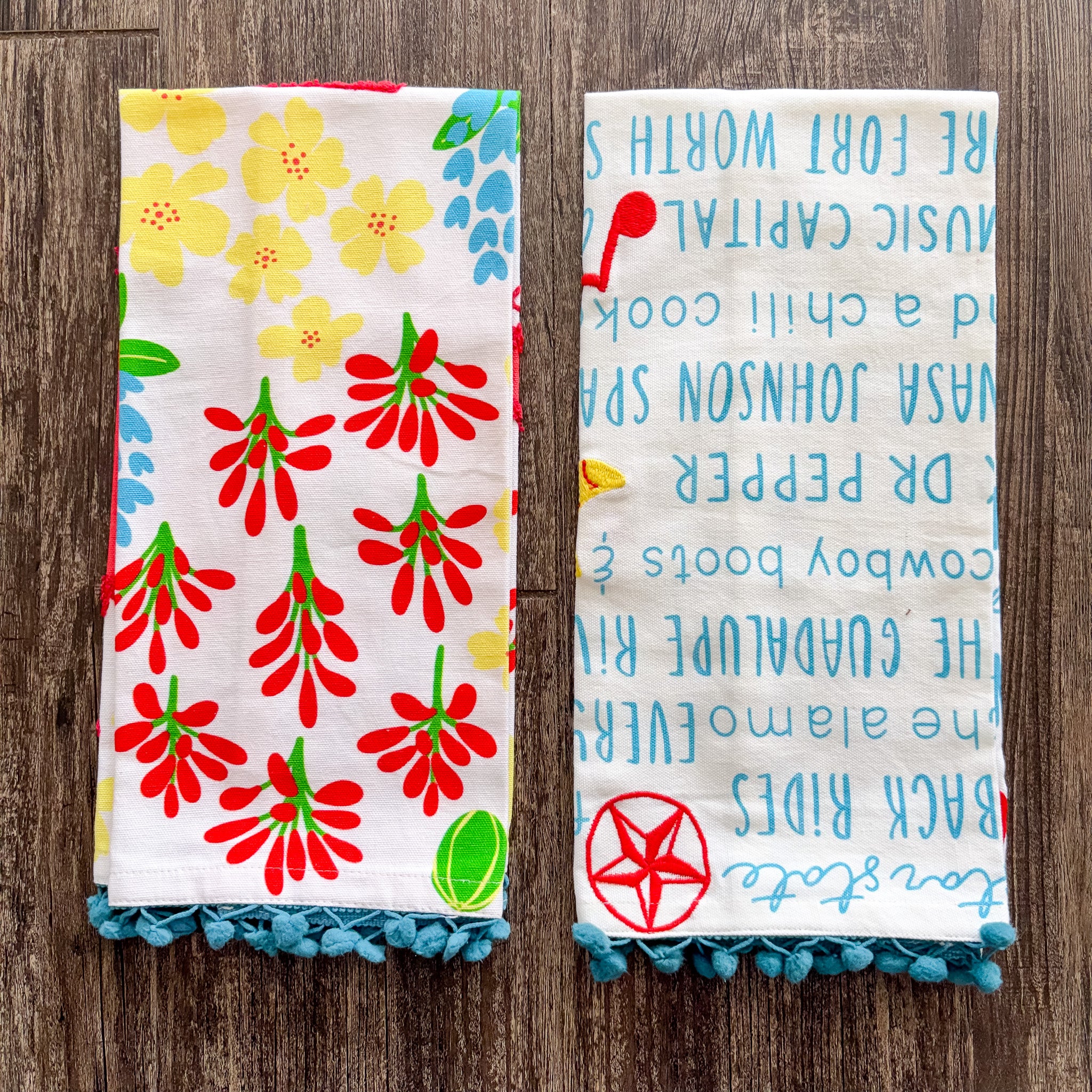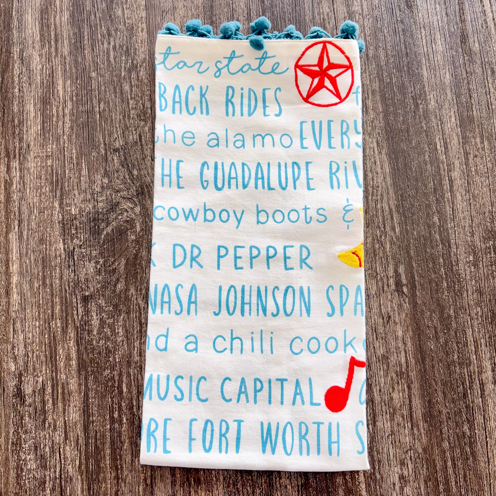 Texas In Bloom Pom Pom Tea Towel - Red State is backordered and will ship as soon as it is back in stock.