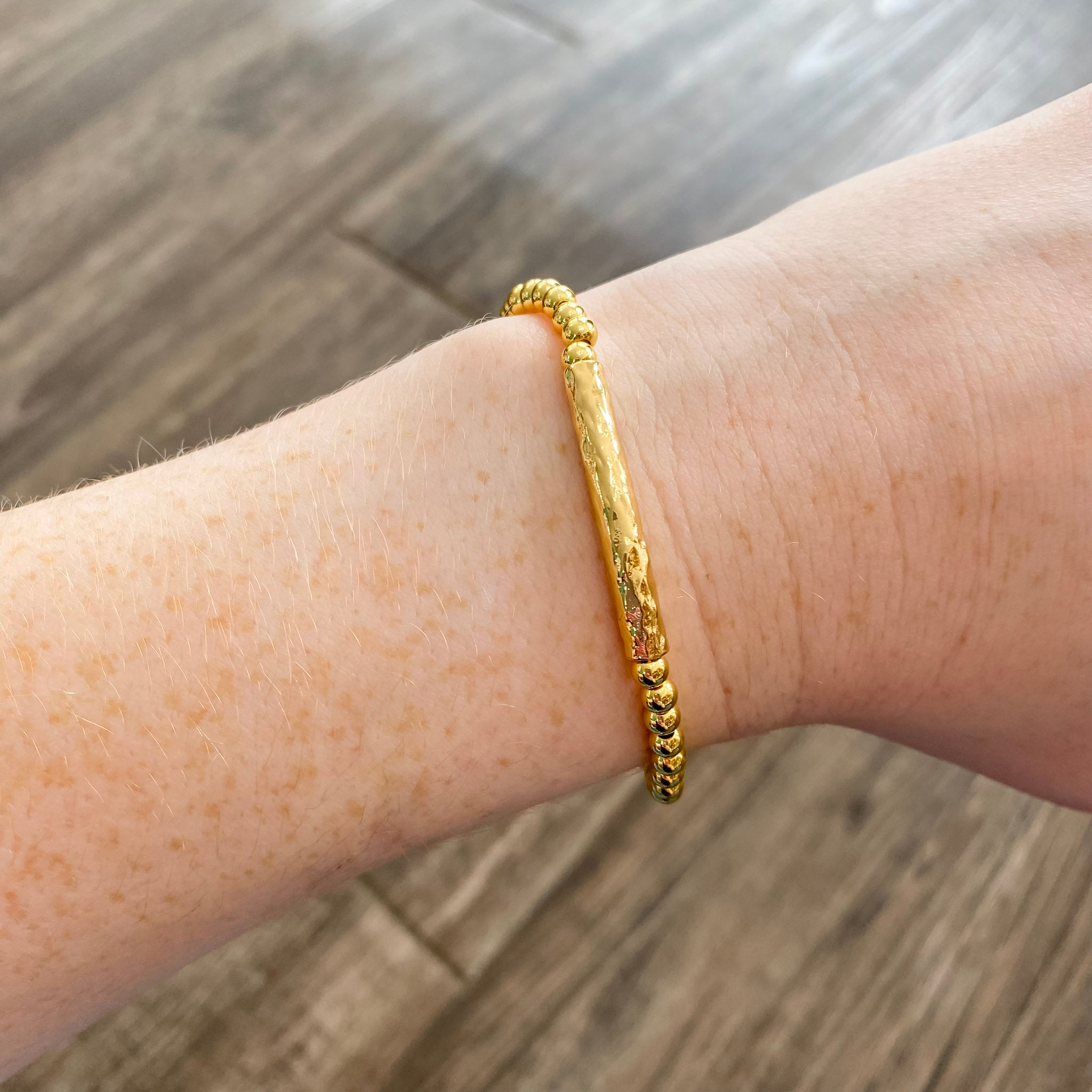 This high-quality, affordable bracelet is perfect for women seeking versatile and comfortable style. It has 4mm gold beads with a solid gold bar that has a wonderful texture allowing it to shine on your wrist.