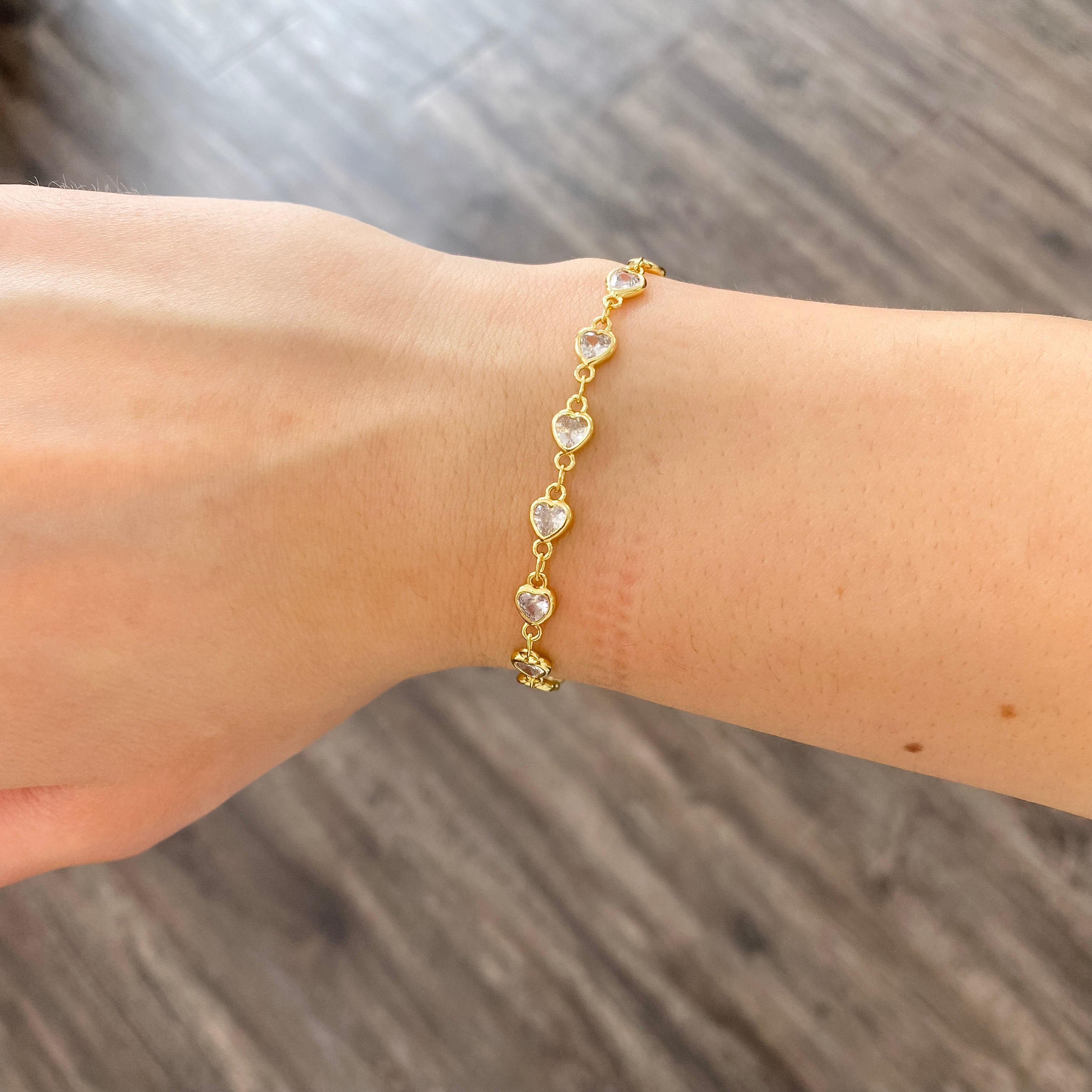 A delicate bracelet featuring elegant Iridescent hearts seamlessly set along the band. This timeless piece adds a subtle sparkle and romantic touch, perfect for everyday wear or special occasions.