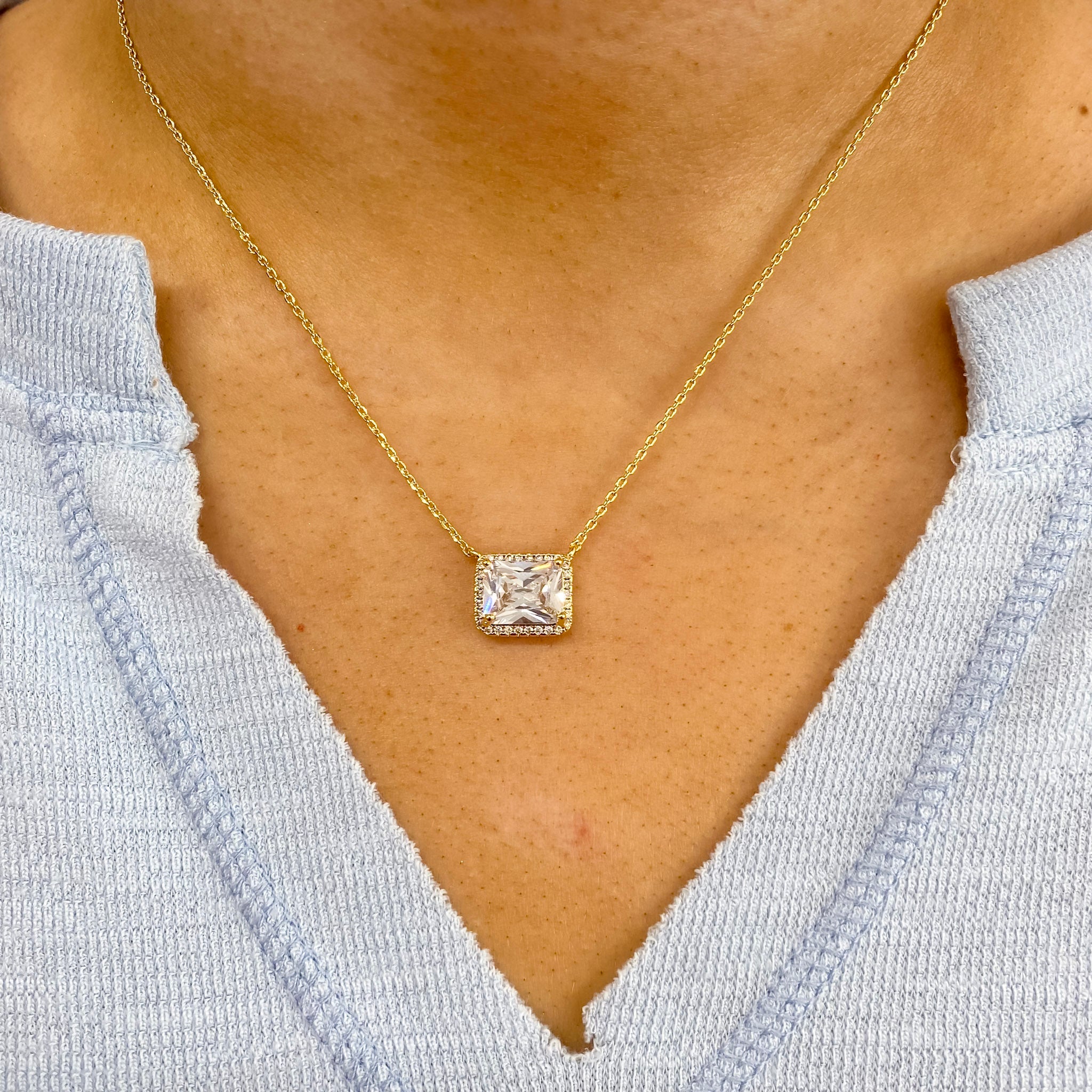 This simple gold necklace features a sleek rectangular cubic zirconia pendant on a delicate chain. The clean, modern design highlights the sparkle of the stone while keeping the look minimal and elegant, making it perfect for everyday wear or layering with other pieces.