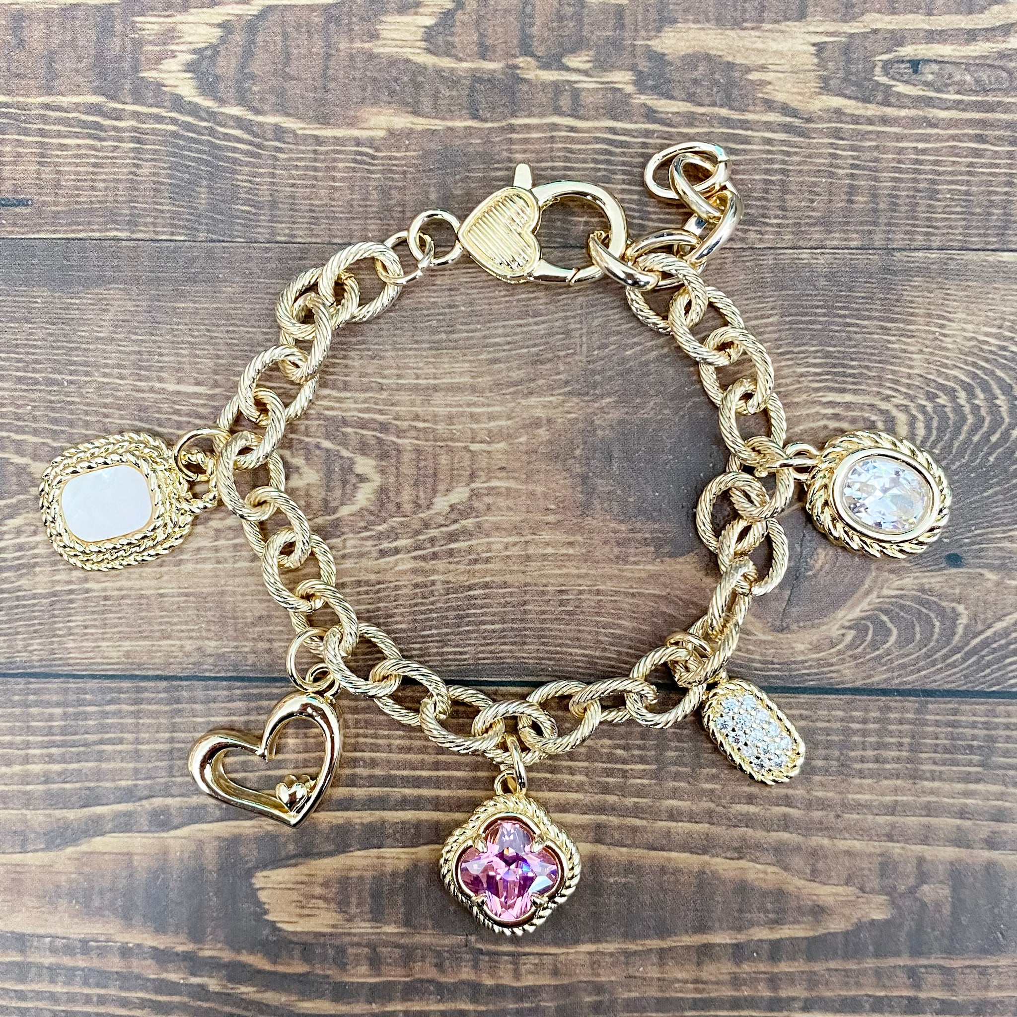 A gold chain bracelet featuring pink and clear gemstone charms and a charming heart-shaped claw clasp. The delicate chain showcases the vibrant, sparkling gems, while the heart clasp adds a playful and romantic focal point. Elegant yet whimsical, this bracelet is perfect for adding a touch of color and personality to any outfit, whether worn alone or layered.