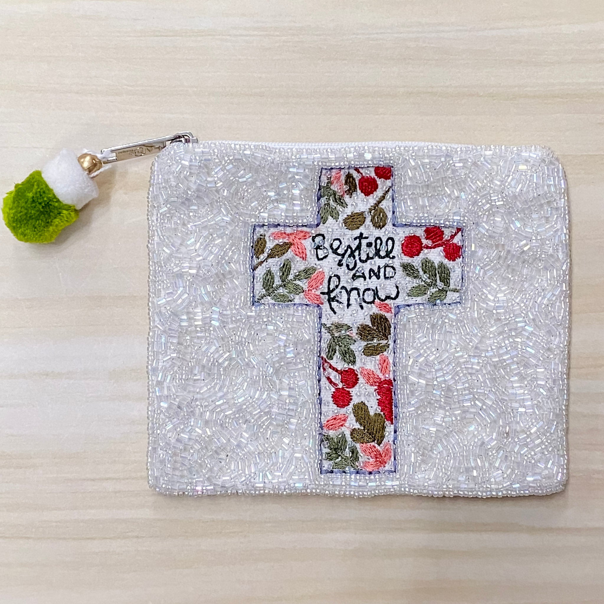 Be Still & Know Beaded Pouch! Perfect for keeping your coins secure and stylish, it's the ultimate accessory for anyone.
