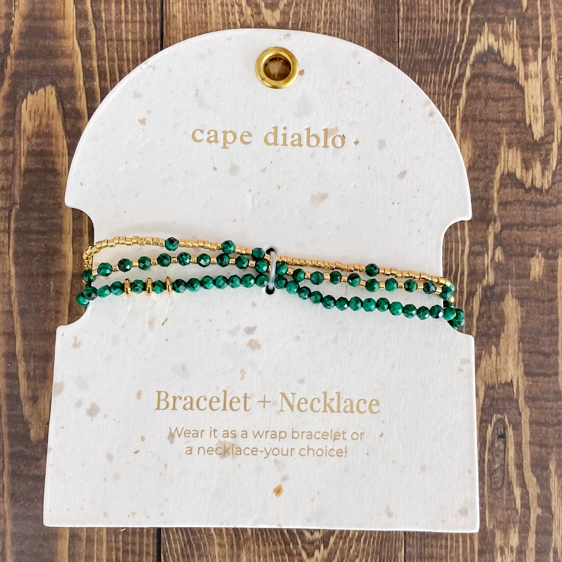 Elevate your accessory game with the Emerald Aura Multi-Style Bracelet/Necklace—a luxurious piece that seamlessly transitions between a chic bracelet and an elegant necklace. This exquisite wrap features stunning dark green stones that exude a sense of tranquility and sophistication, beautifully complemented by shimmering gold accents that catch the light with every movement.