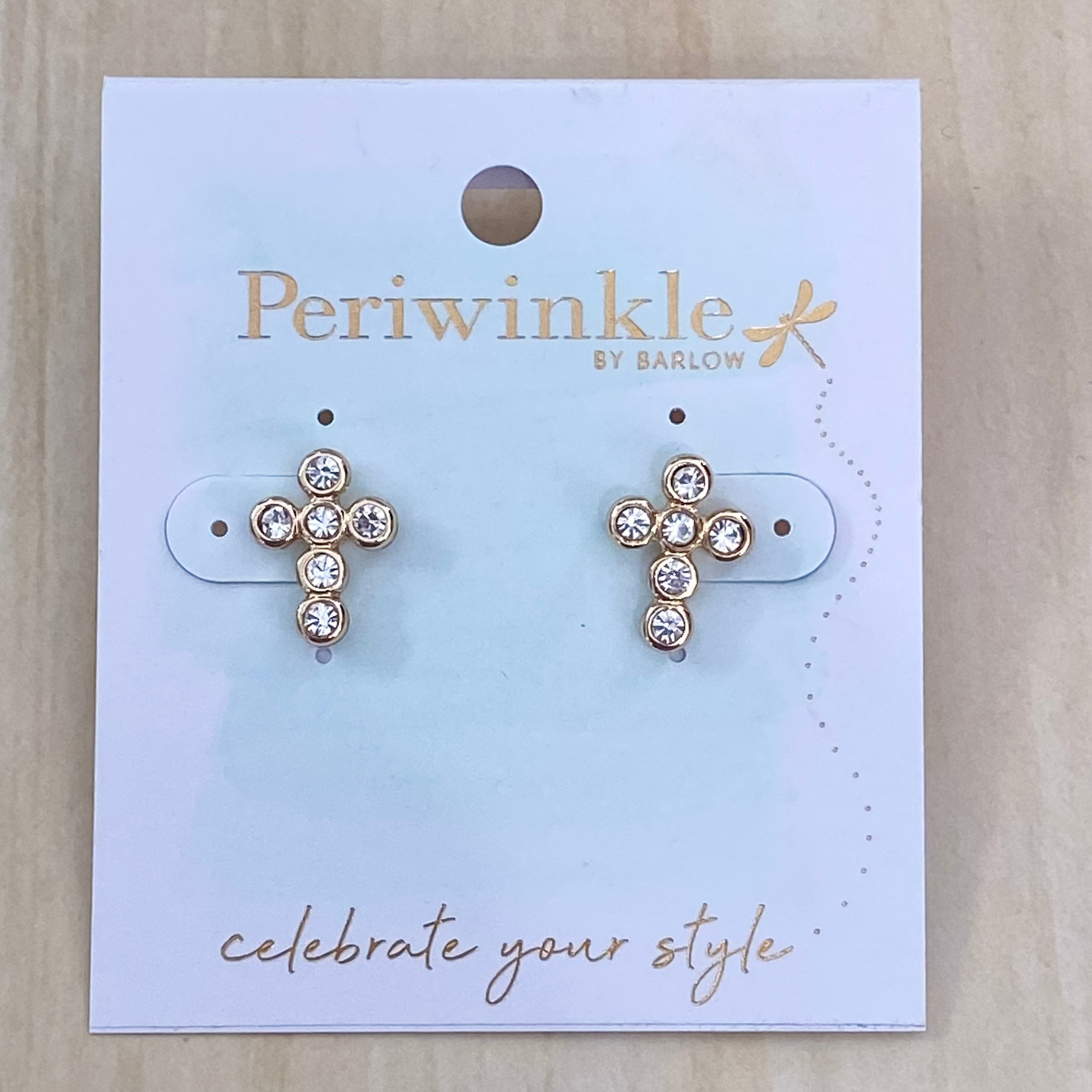 These sweet gold circle cross earrings are a great look for an everyday outift. The crosses are chunky so they are very visable and sparkle nicely! The gems allow for a clean and shimmery look.
