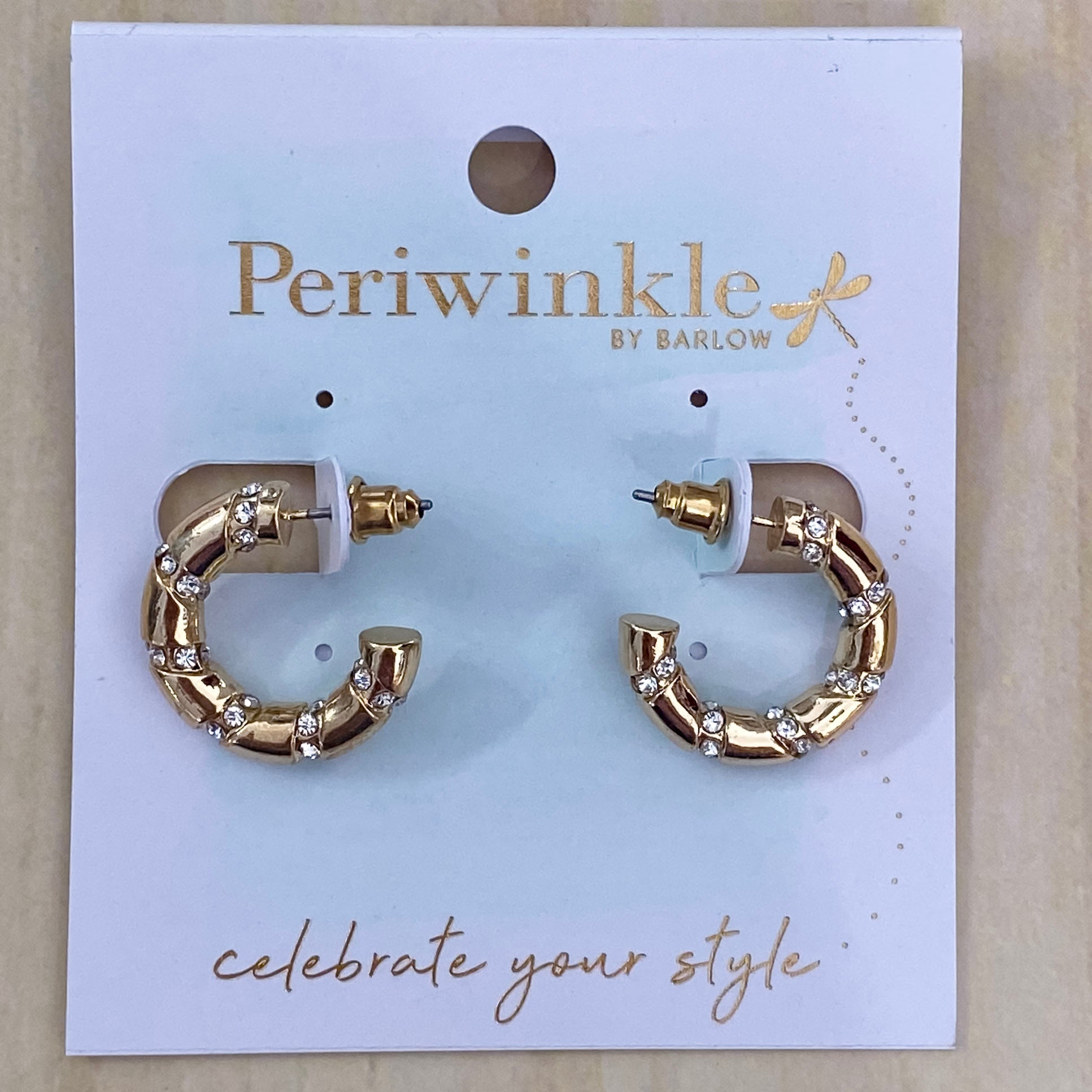 These gold hoops are elegantly crafted with small, sparkling gems subtly integrated along the band. The gems add just the right amount of shimmer and color, enhancing the warm glow of the polished gold. Delicate yet eye-catching, they strike the perfect balance between classic sophistication and a touch of sparkle.