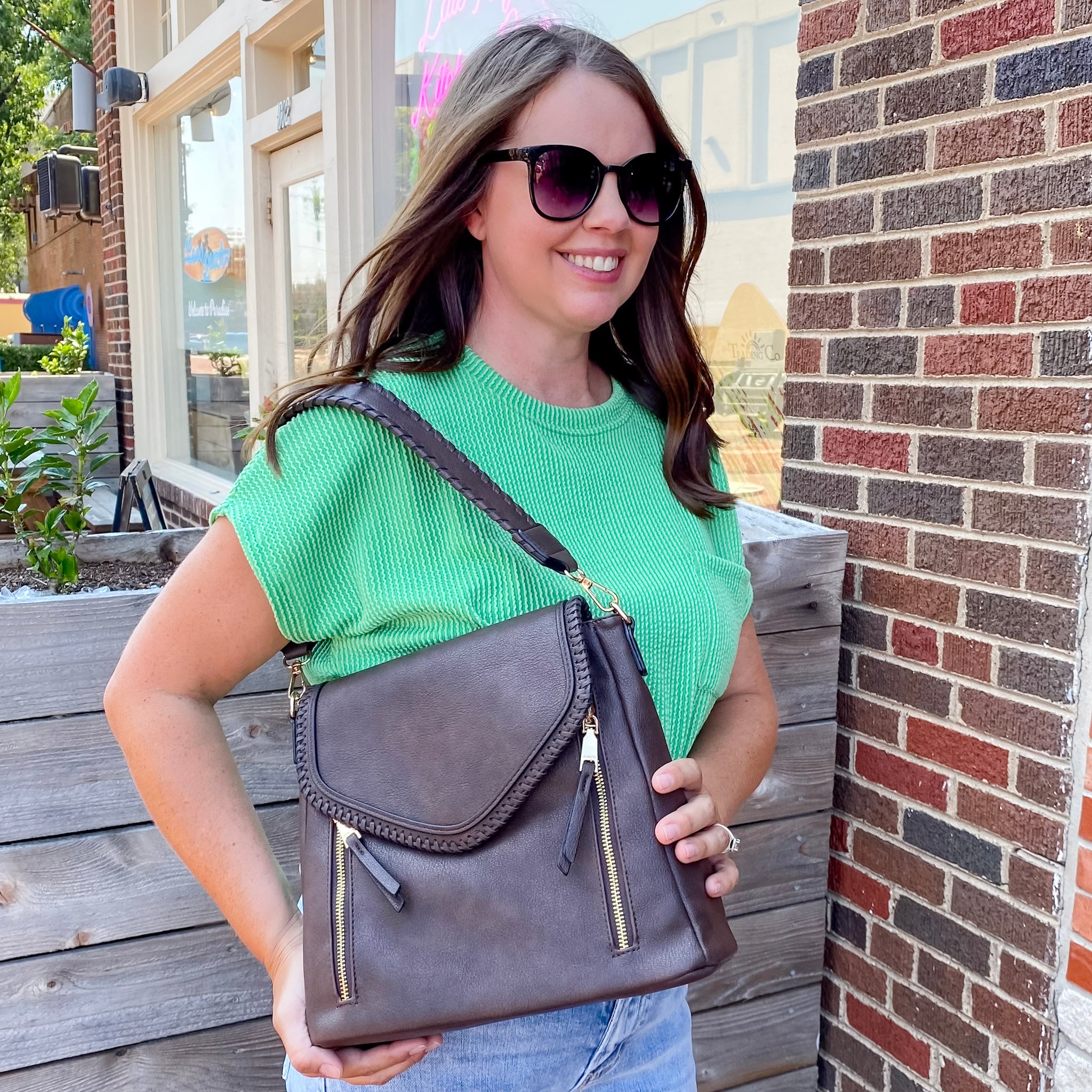 Lorelei is one of our top new styles! Make it your new everyday bag. This crossbody features a dual zip front pocket, a braided edge flapover that snaps closed, and two straps: a removable braided shoulder strap and an adjustable/removable crossbody strap. The inside is lined with slip and zip pockets. Made of soft vegan leather.