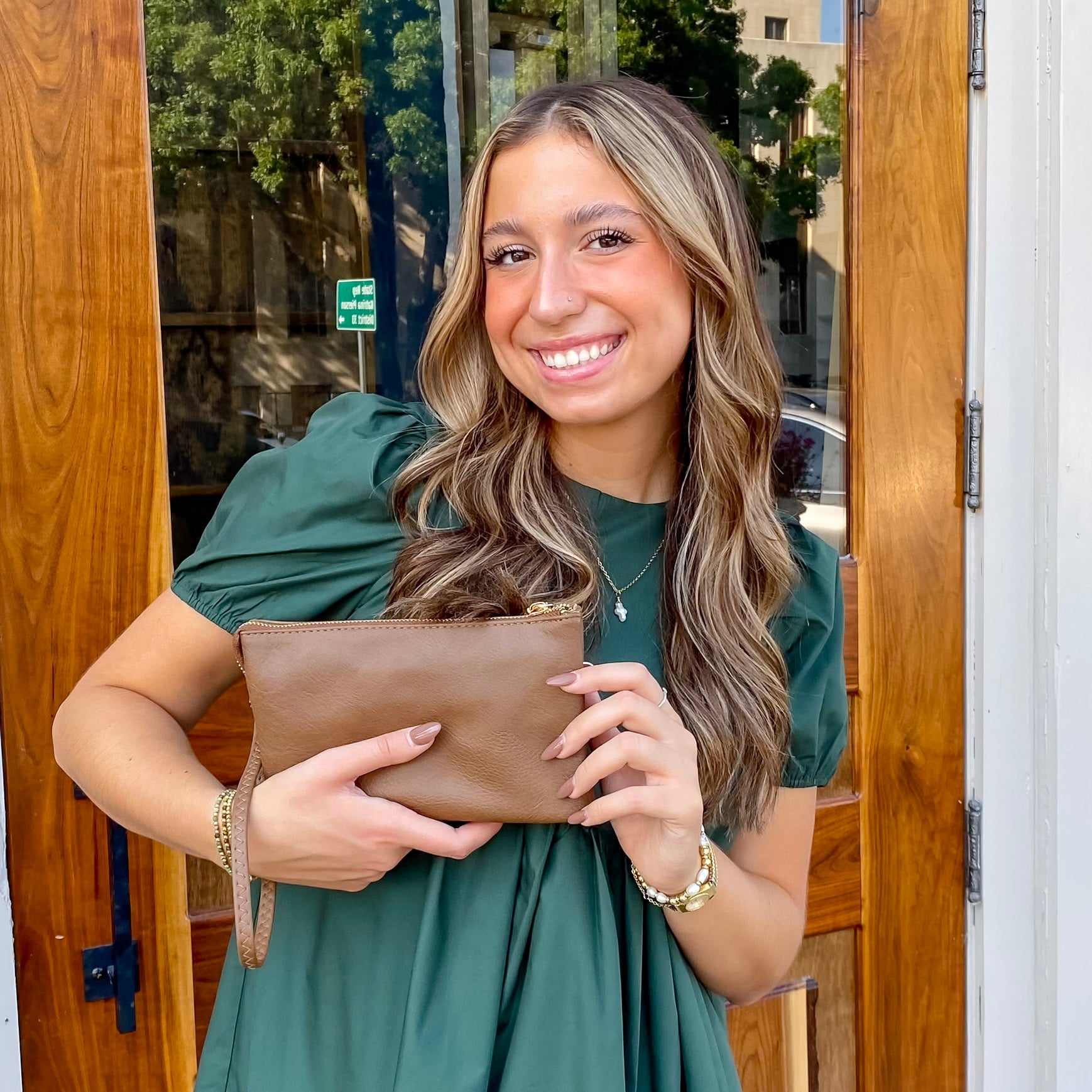 The Riley bag by Jen & Co is one of our top sellers. This crossbody/clutch has two major compartments with one middle zipper pocket and a top zipper closure. Inside are two slip pockets and six cardholders. Wear it as a crossbody or use it as a clutch! Includes a detachable wristlet strap and an adjustable shoulder strap.