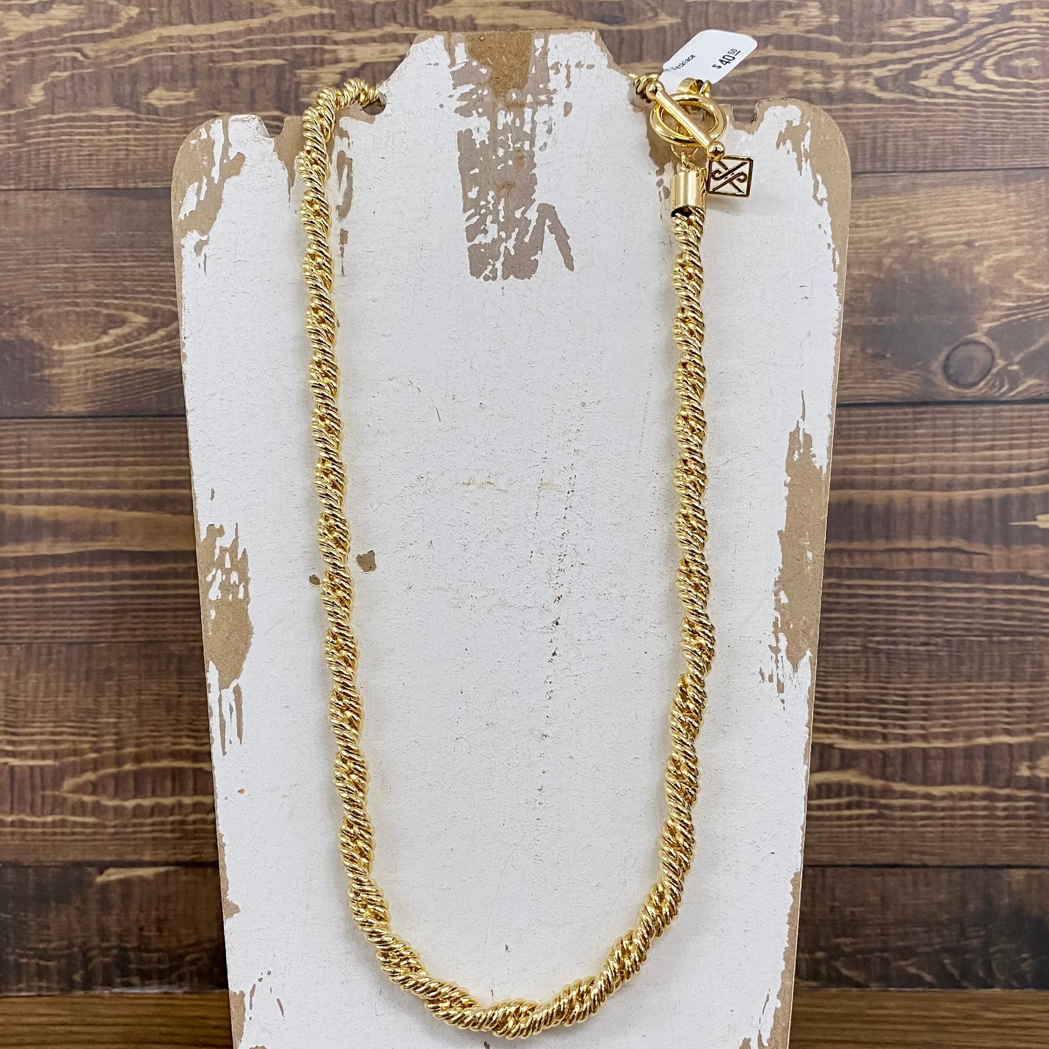 Elegant and versatile, this gold necklace features a finely woven design that exudes texture and craftsmanship. The toggle clasp adds a classic touch while ensuring easy, secure wear. Perfect worn alone for subtle sophistication or layered with other pieces, this necklace is a timeless accessory — and as a bonus, it comes with a matching woven bracelet to complete the look.