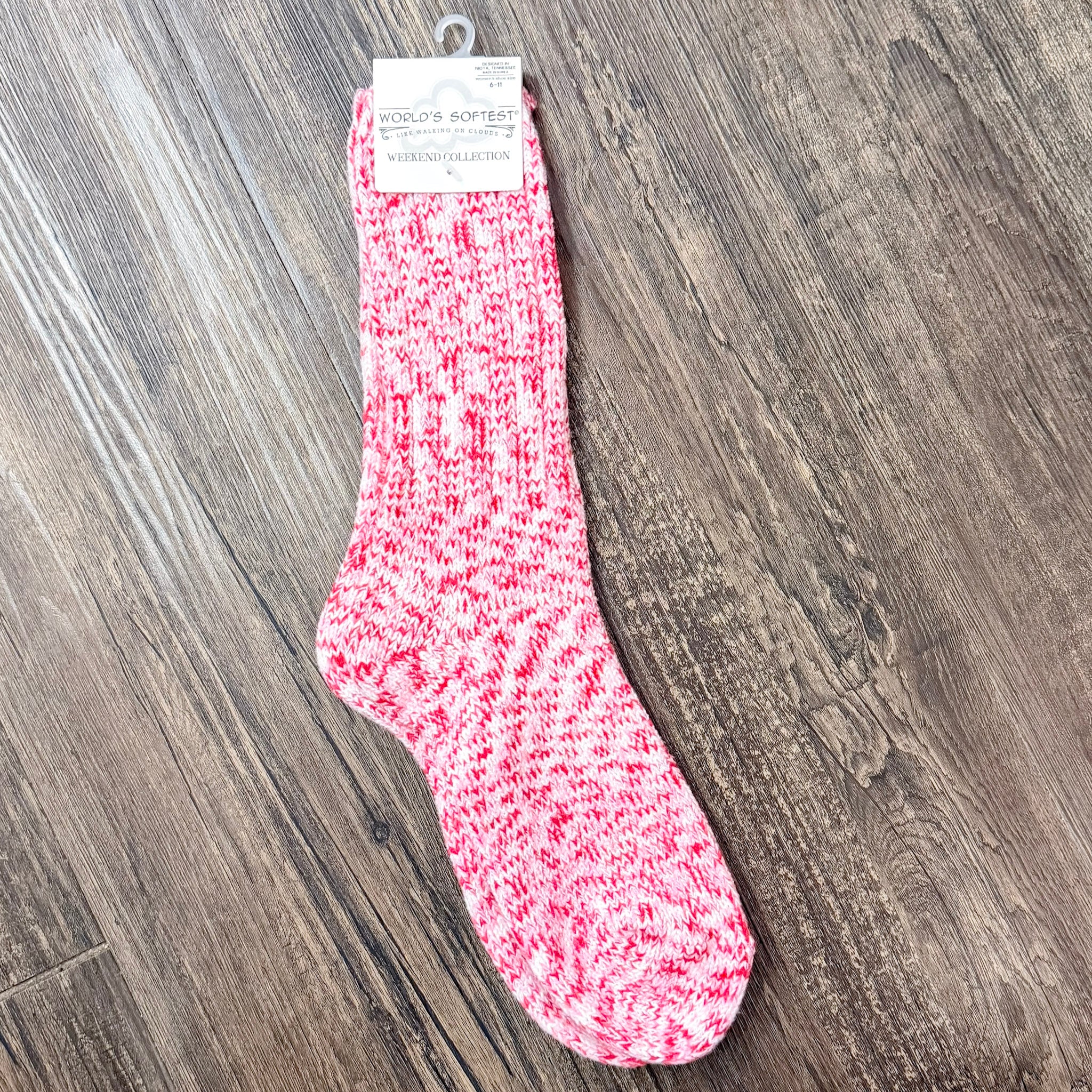 Comfy red socks accented with soft hints of white. Cozy and cheerful, they’re perfect for everyday wear or adding a festive touch to your lounging and layering.