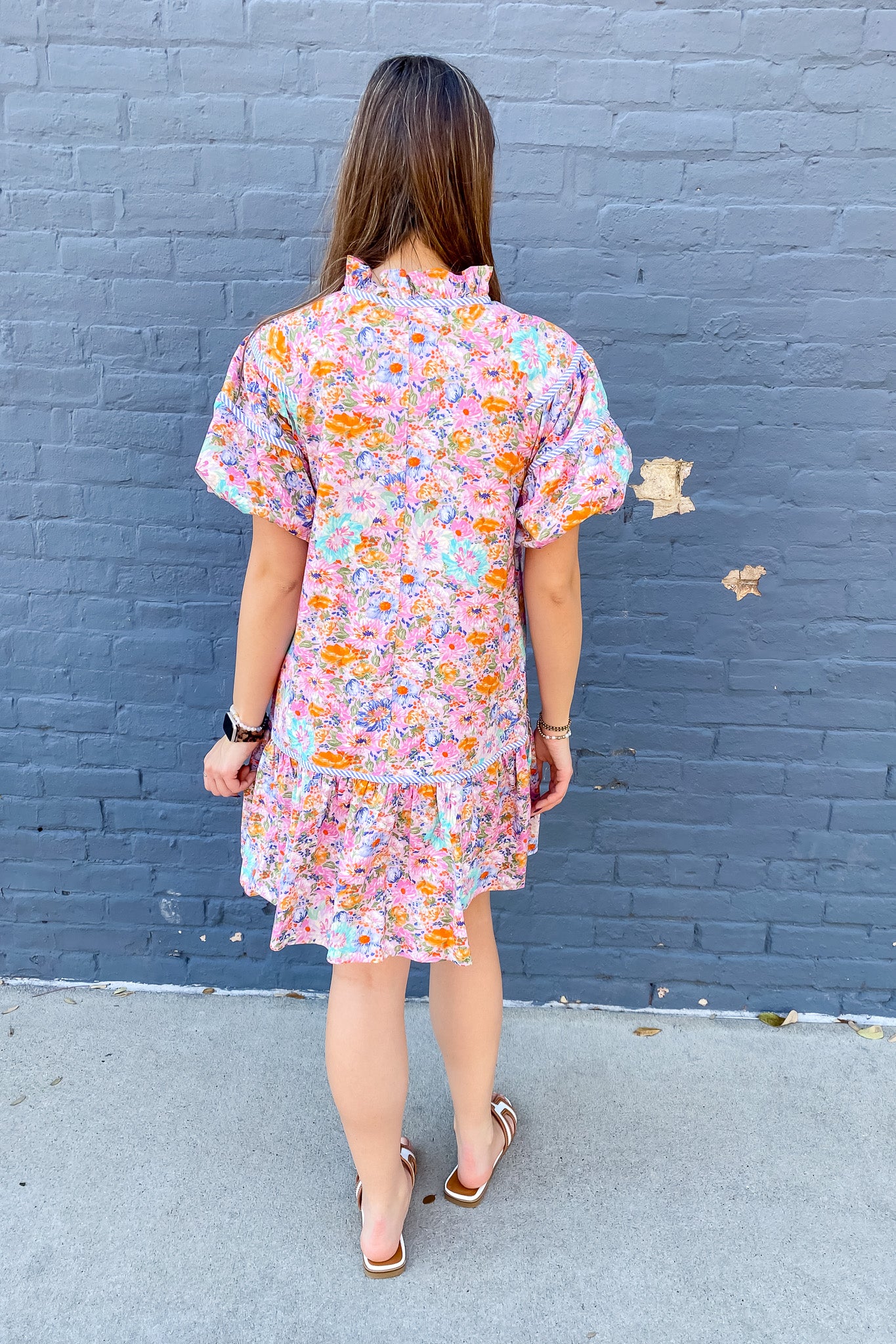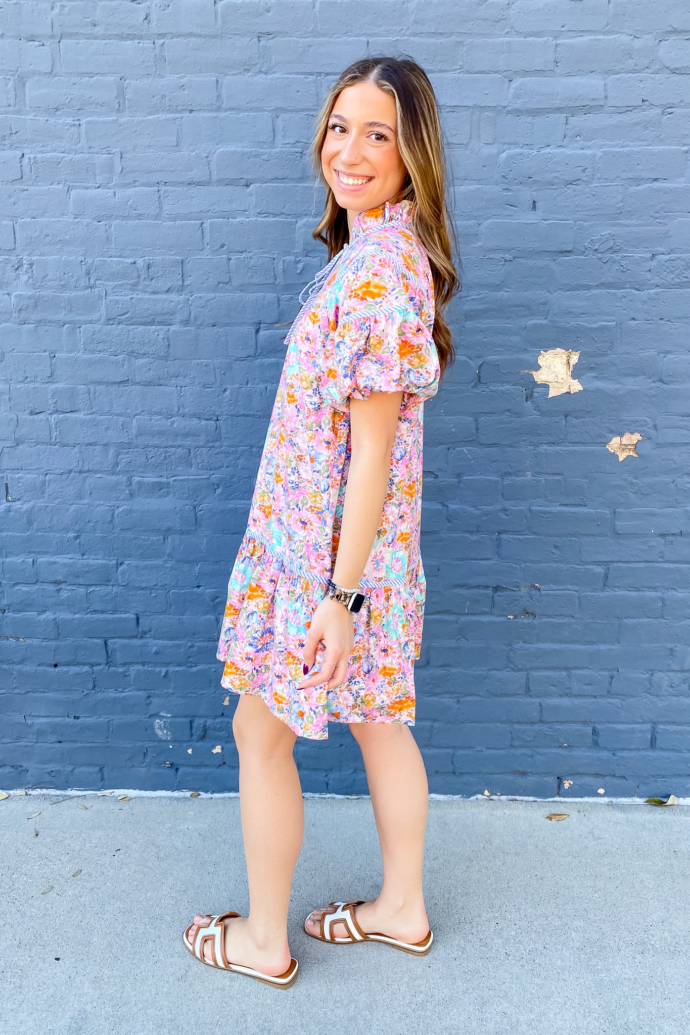 This statement dress features a vibrant peony mix print layered over a soft base, blending shades of pink, coral, lavender, and green for a lively yet balanced look. Designed with a relaxed silhouette, the dress includes short puff sleeves that add volume and shape without feeling heavy. Decorative trim details run along the bodice and sleeves, giving the piece a thoughtfully finished look. The tiered skirt adds movement and dimension, while the lightweight fabric keeps the dress comfortable and easy to wear all day.