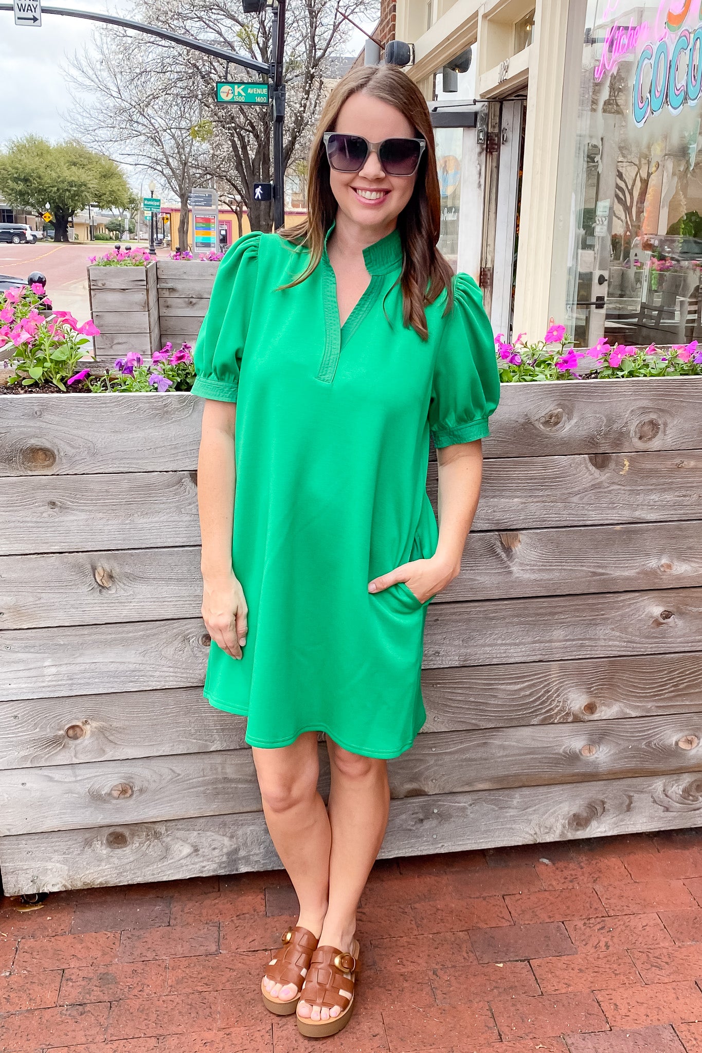 This vibrant green dress is the definition of easy and eye-catching. Designed in a rich emerald hue, it features a soft, smooth knit fabric that drapes beautifully and feels comfortable all day long. The relaxed shift silhouette gives it an effortless fit, while the subtle V-slit neckline adds a polished touch without feeling fussy. Short puff sleeves bring just the right amount of feminine flair, finished with gently gathered cuffs that balance structure and softness. Clean lines and a timeless shape make this dress a go-to for when you want to feel put together with minimal effort.