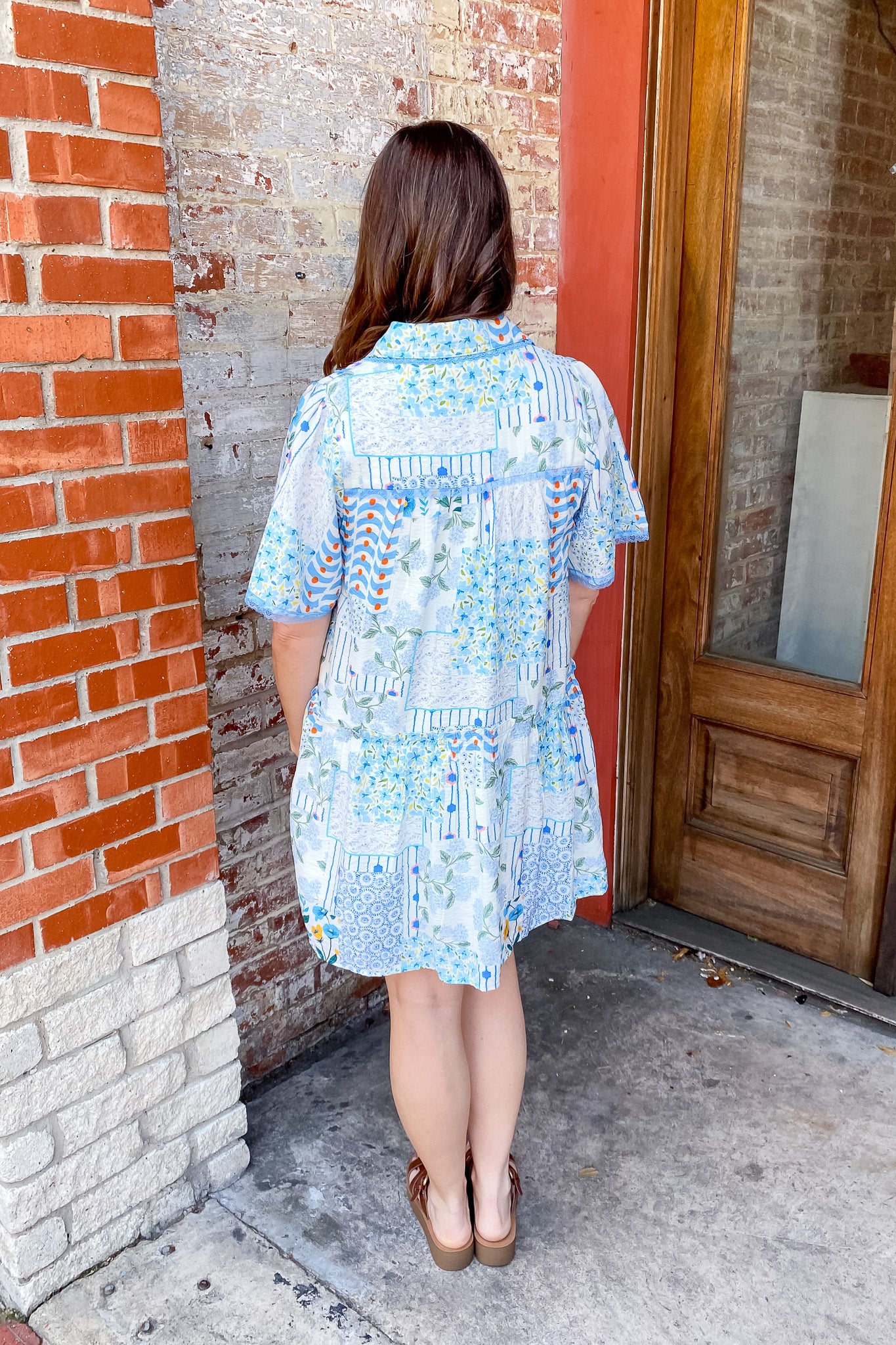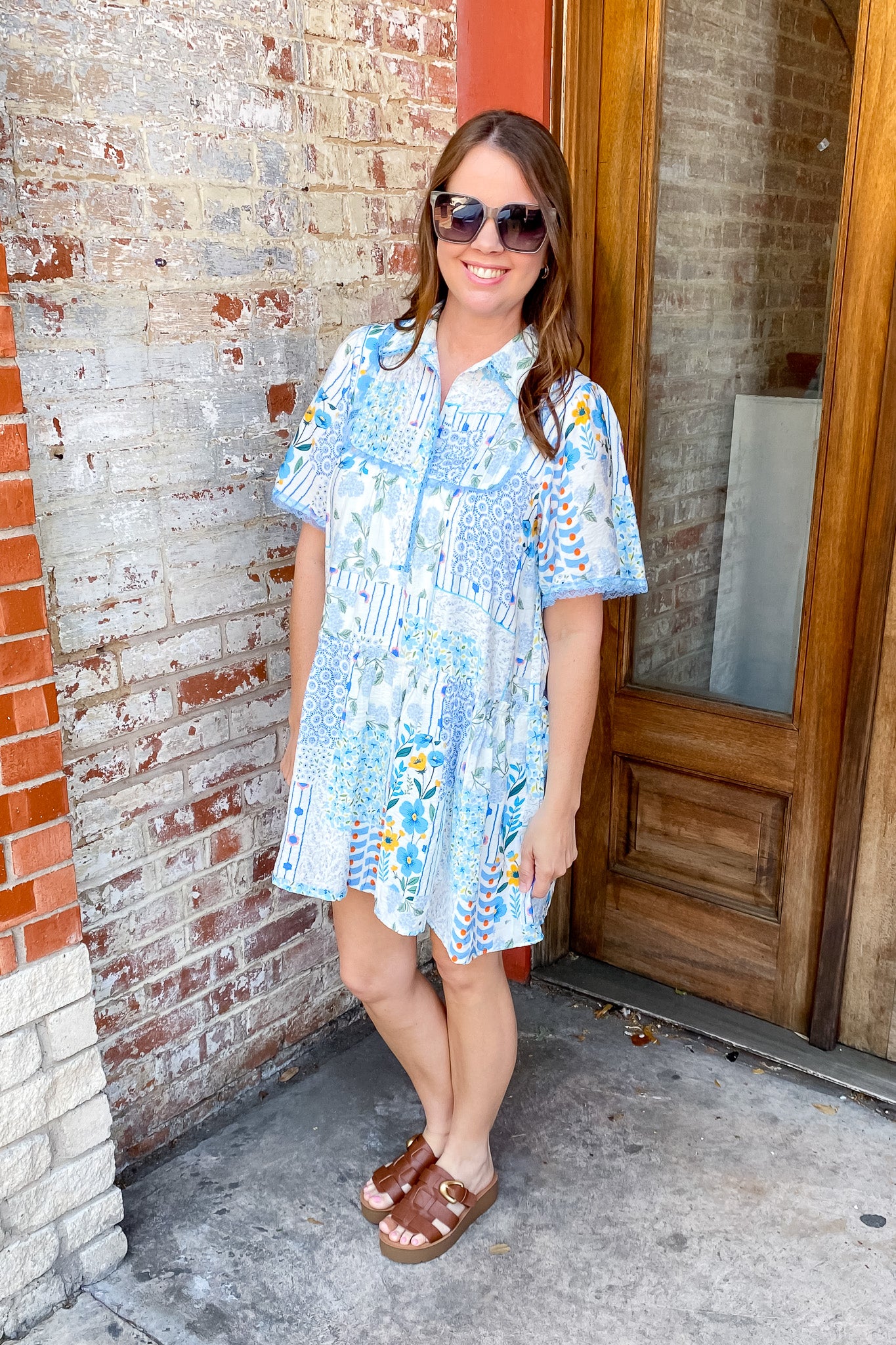 This blue patchwork mini dress is such a fun mix of soft color and playful detail. Designed with a relaxed, flowy silhouette, it features a charming patchwork-style print made up of delicate florals, subtle stripes, and tiny geometric patterns all in shades of blue, white, and hints of soft yellow and green. The collared neckline adds a slightly polished touch, while the button-front detail keeps it feeling easy and effortless. Short sleeves and a tiered hem give it that breezy movement you’ll love, and the lightweight fabric makes it perfect for warm days when you still want to look put together.