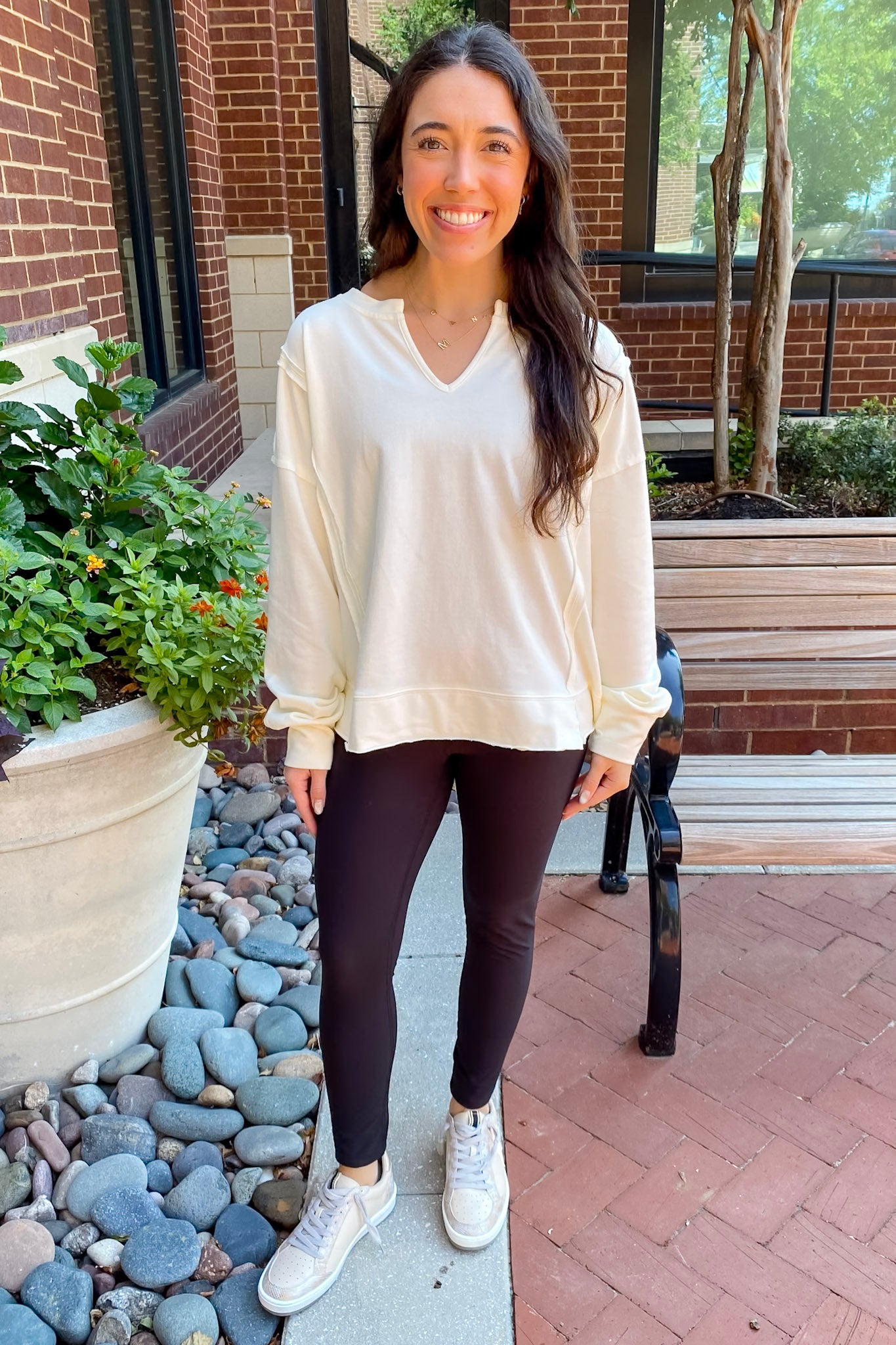 Stay effortlessly cozy and cute in this ivory pullover, featuring a mineral wash finish for that lived-in look you’ll love. With a raw edge hem, exposed seams, and a notch neckline, it’s the perfect mix of laid-back and put-together. The roomy fit makes it ideal for layering as the weather cools down, while the soft texture keeps things comfy all day long.