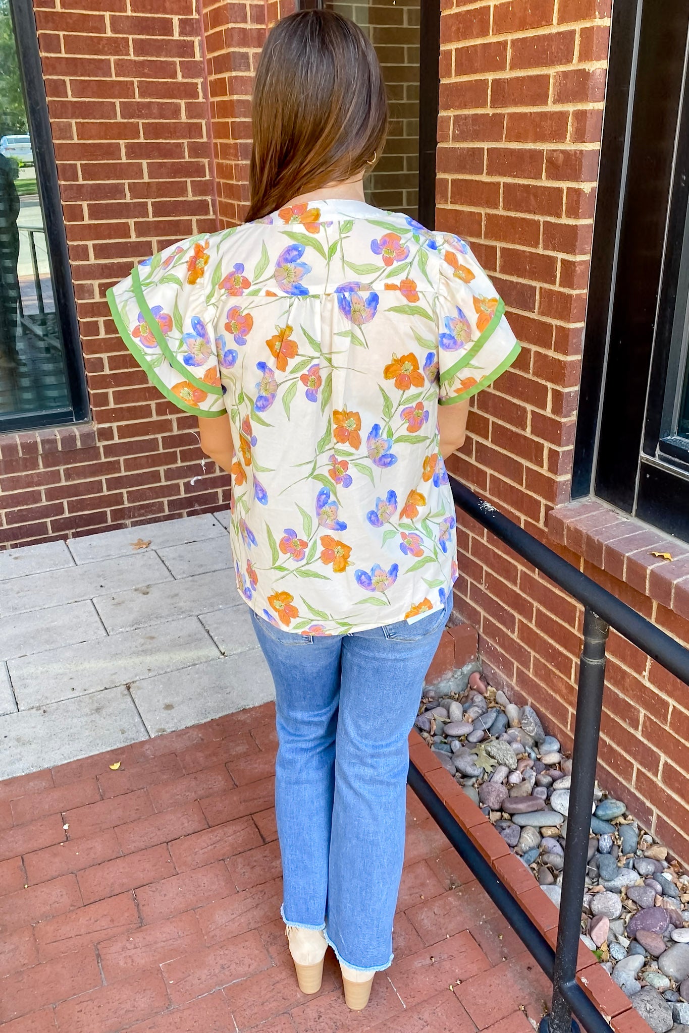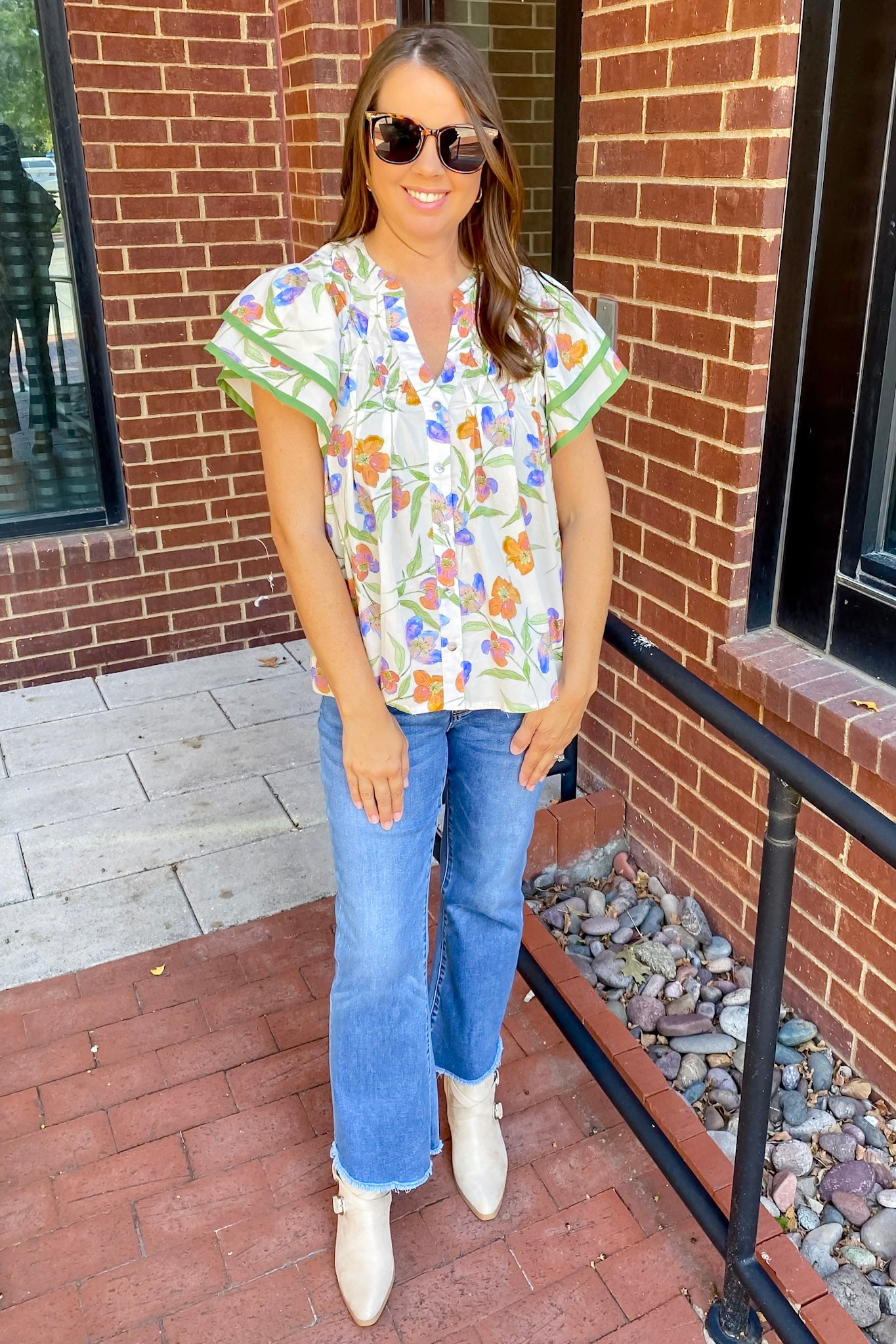 This top is giving sweet meets statement! With layered flutter sleeves trimmed in deep green, delicate pintuck detailing at the shoulders, and a playful floral print in pumpkin orange and periwinkle blue—this button-front blouse is the perfect way to add a soft, feminine pop to your fall wardrobe. The lightweight feel makes it easy to wear now and layer later.