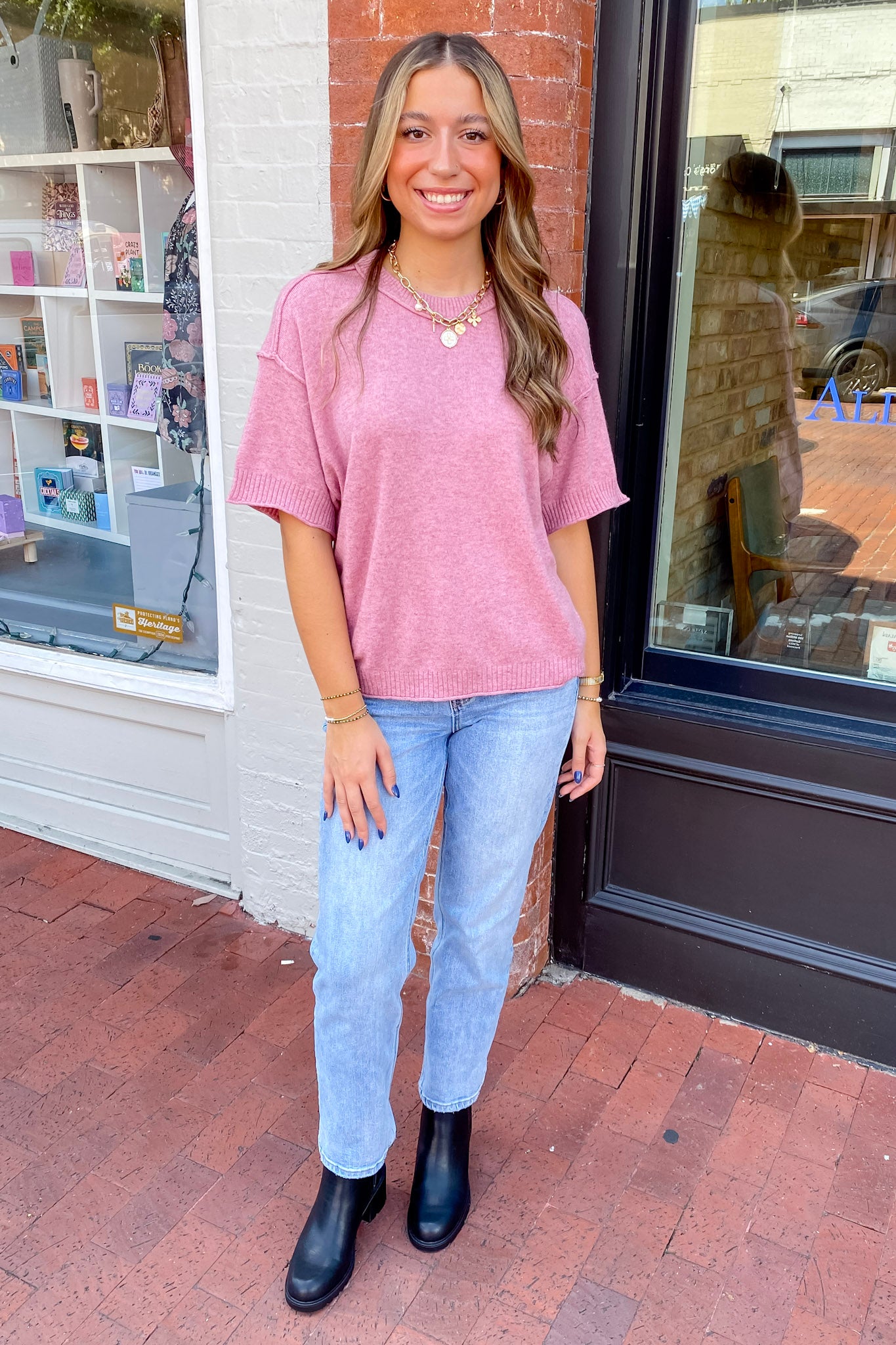 Say hello to your newest layering BFF. The Believe It Or Not Mauve Top delivers the perfect blend of cozy texture and effortless polish. With its bold mauve hue, soft ribbed trim, and boxy fit, this top is equal parts classic and modern. The lightweight knit makes it ideal for transitional fall weather—wear it solo or layered under a jacket for extra flair.