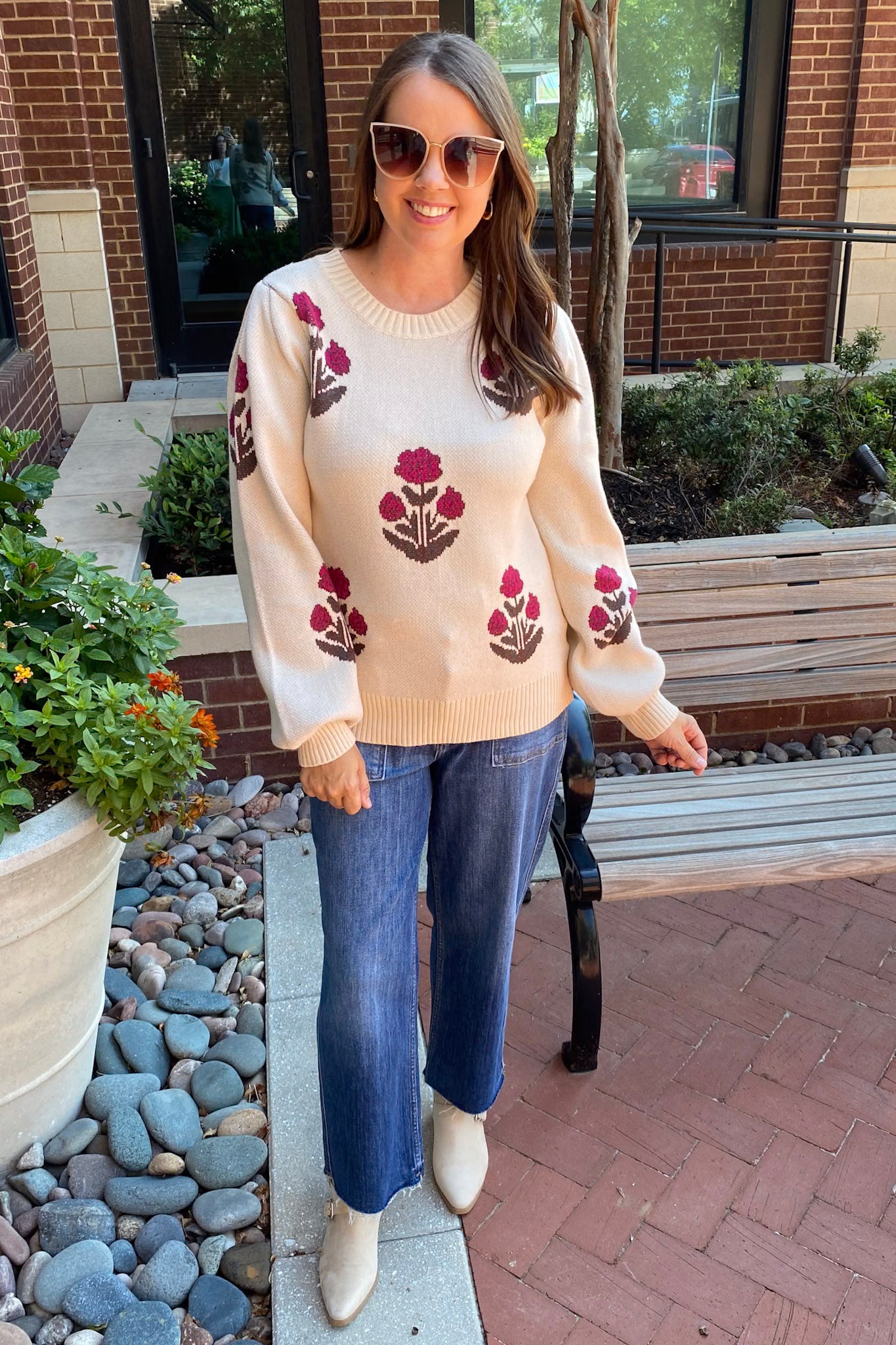 Cozy meets playful in the Going To Go Floral Print Cream Sweater, a soft ecru pullover dotted with darling deep-pink floral knit details. With its relaxed fit, ribbed hem, and balloon sleeves, this sweater feels vintage-inspired but totally easy to wear. It’s that perfect in-between piece for crisp days when you want warmth and personality.