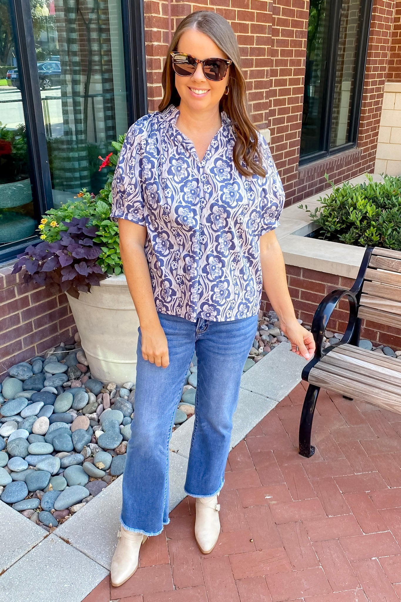 A fresh fall update in your favorite silhouette—this puff sleeve blouse features a rich blue pattern with subtle floral detailing that feels perfectly balanced between bold and wearable. The notched neckline and relaxed fit keep it breezy and comfortable, while the gathered shoulder adds just the right touch of drama.
