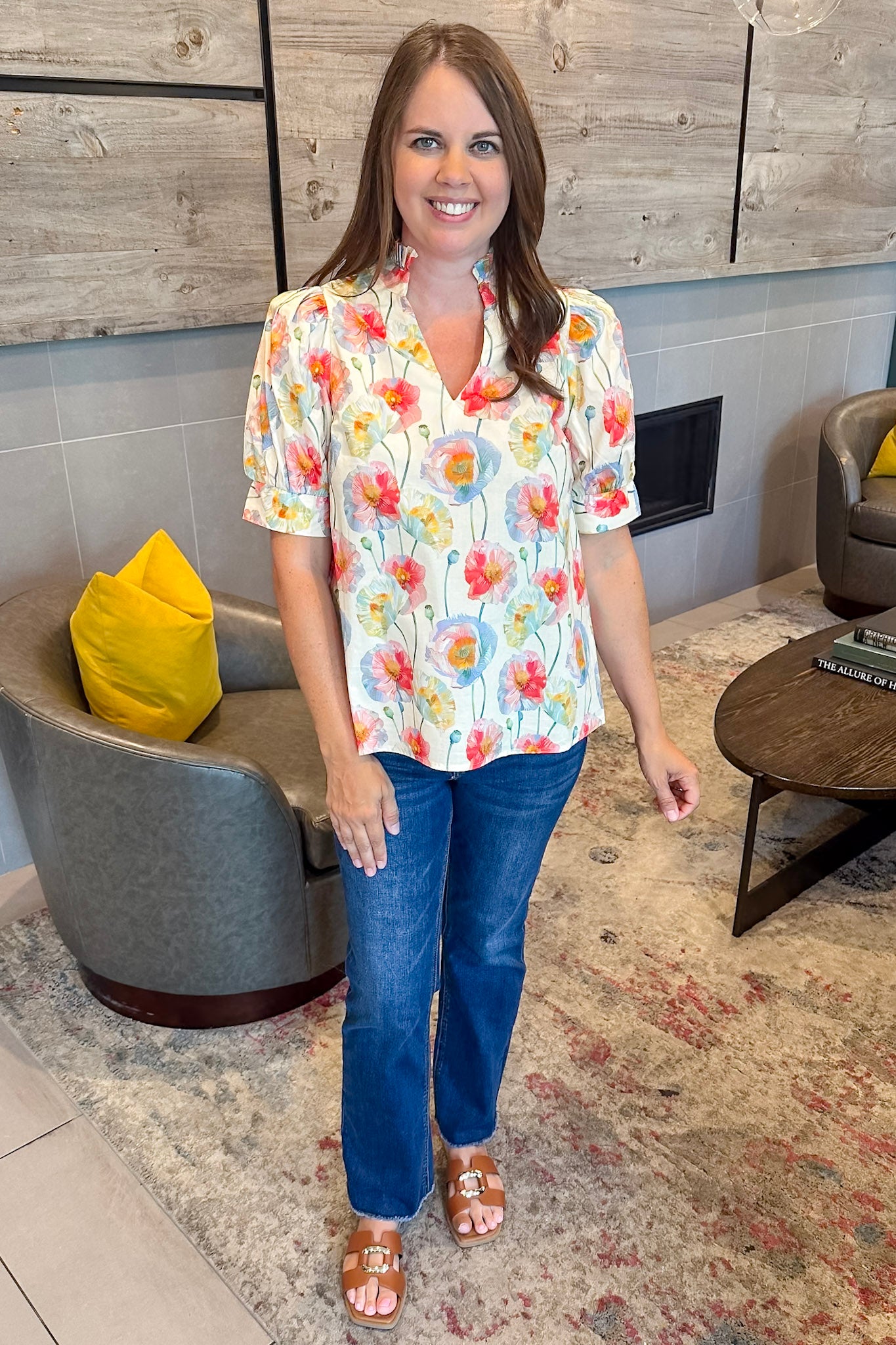 Soft and dreamy, this watercolor floral top is perfect for adding a feminine touch to your everyday style. The puff sleeves and ruffle-trim collar give it a polished look, while the pastel blooms pop against the light background for a fresh, cheerful vibe. Lightweight and breathable, it’s great for transitioning from work to weekend outings.