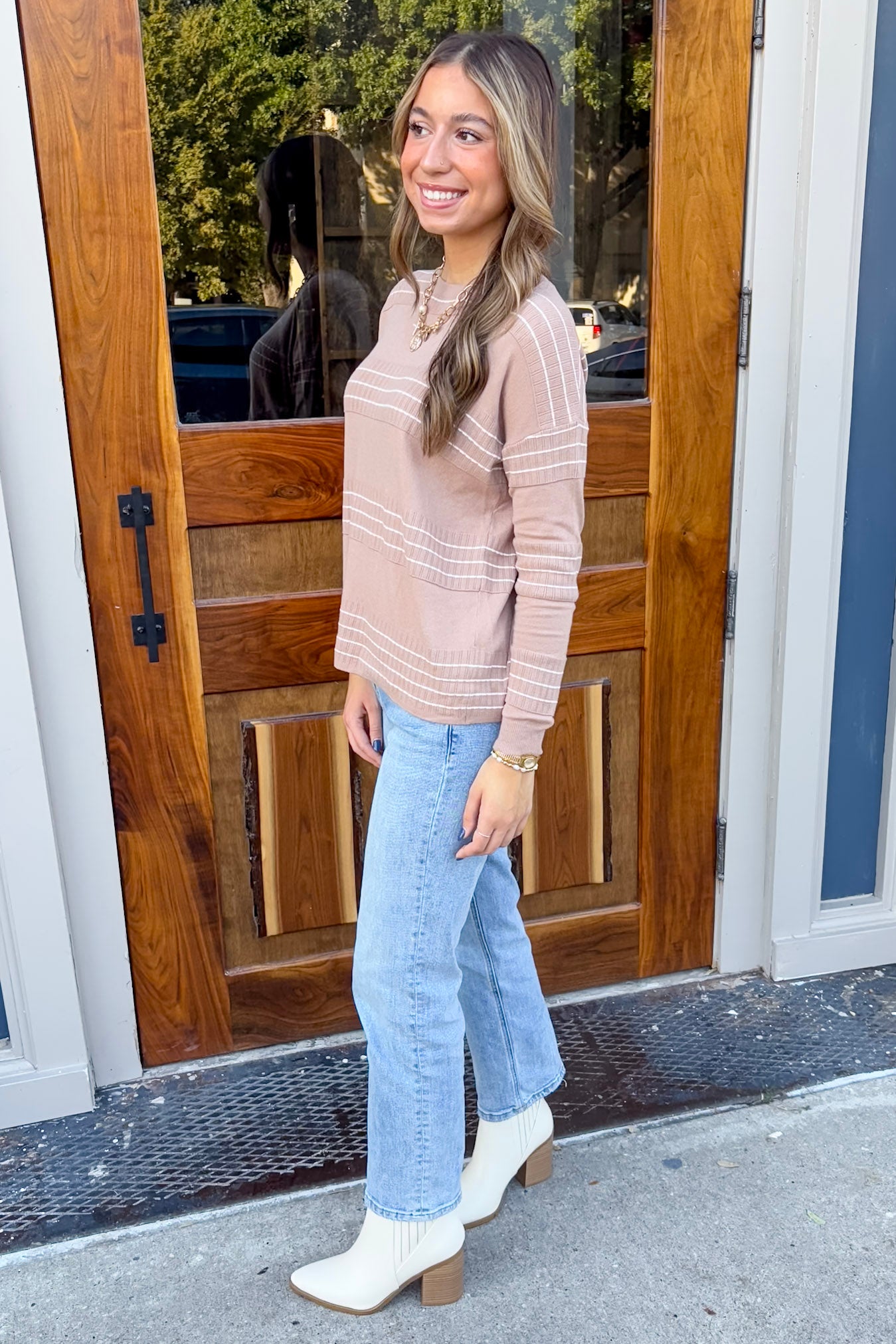 The Last Time Striped Light Camel Sweater is a cozy neutral dream! With a relaxed fit and soft knit feel, this mocha-toned piece is sweetened with white horizontal stripes and ribbed trim details. It’s lightweight enough for layering but warm enough for solo wear—perfect for chilly winter days when you want to look cute without trying too hard. Pair it with denim, leggings, or a mini skirt and boots for an easy winter outfit you’ll keep reaching for.