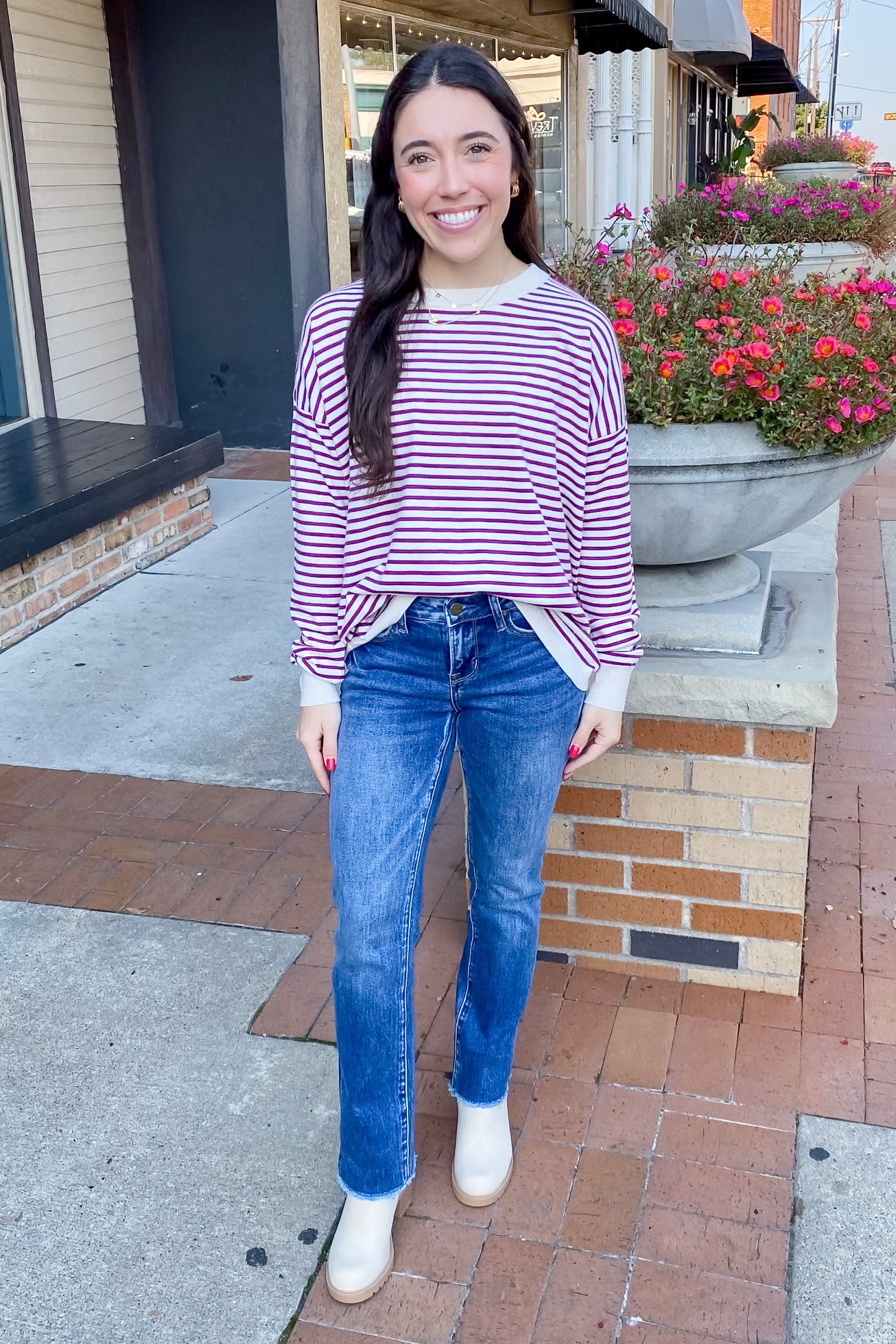 Say hello to the coziest kind of cute! The Magenta Love Striped Sweater brings all the fall feels in a lightweight, easy-fit knit. Featuring a dreamy magenta and ivory stripe combo, this top adds the perfect pop of color without going overboard. The classic crew neckline and relaxed shape make it a go-to for layering or tossing on solo. It’s playful, effortless, and totally ready for crisp air and cute plans.