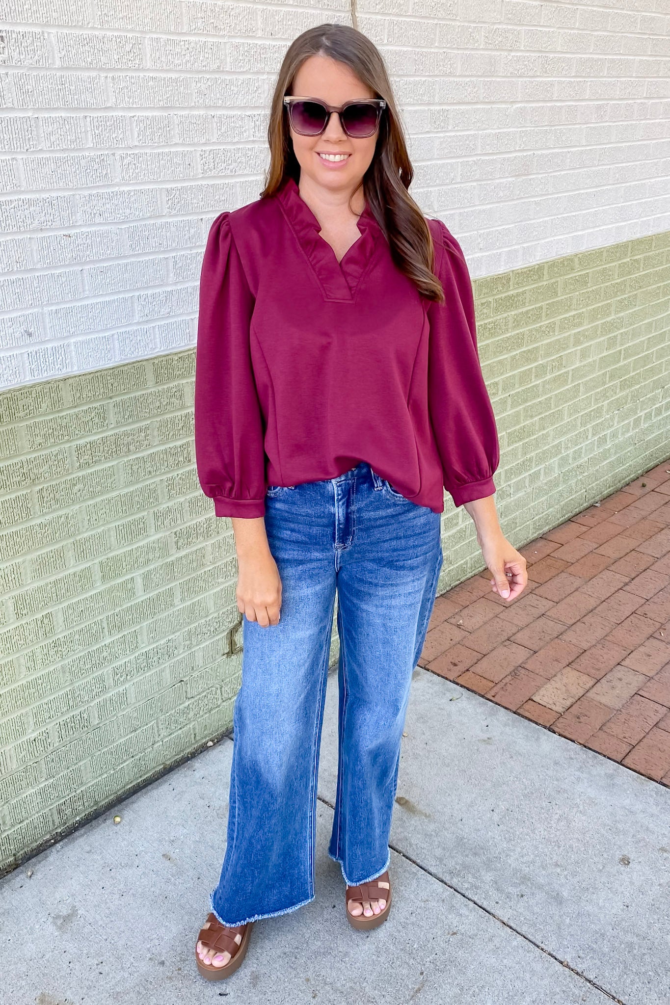 Chic and timeless, this bugundy ruffle neck top is a fall wardrobe essential. The soft, structured fabric and subtle puff sleeves give it a polished yet easygoing feel, while the delicate ruffle neckline adds just the right amount of feminine charm. Dress it up or keep it casual—this versatile top is perfect for any autumn occasion.