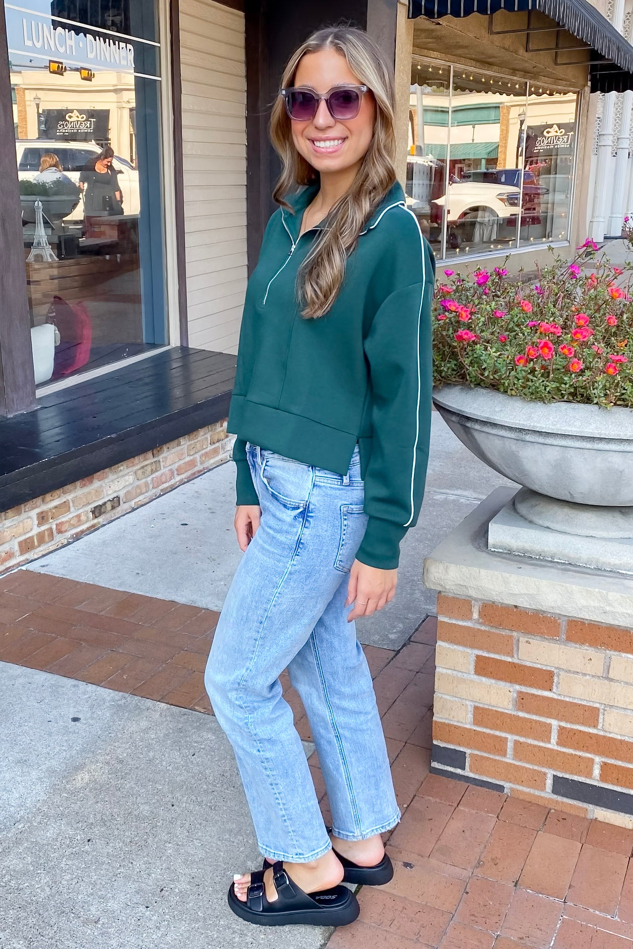 Meet your new fall favorite: Moody Day Piping Detail Hunter Green Sweater in a rich evergreen hue with crisp white piping. This pullover blends sporty structure with laid-back ease, featuring a high zip-up collar, relaxed fit, and soft-but-structured fabric that holds its shape just right. It's comfy, cute, and ready for any cool-weather plan.