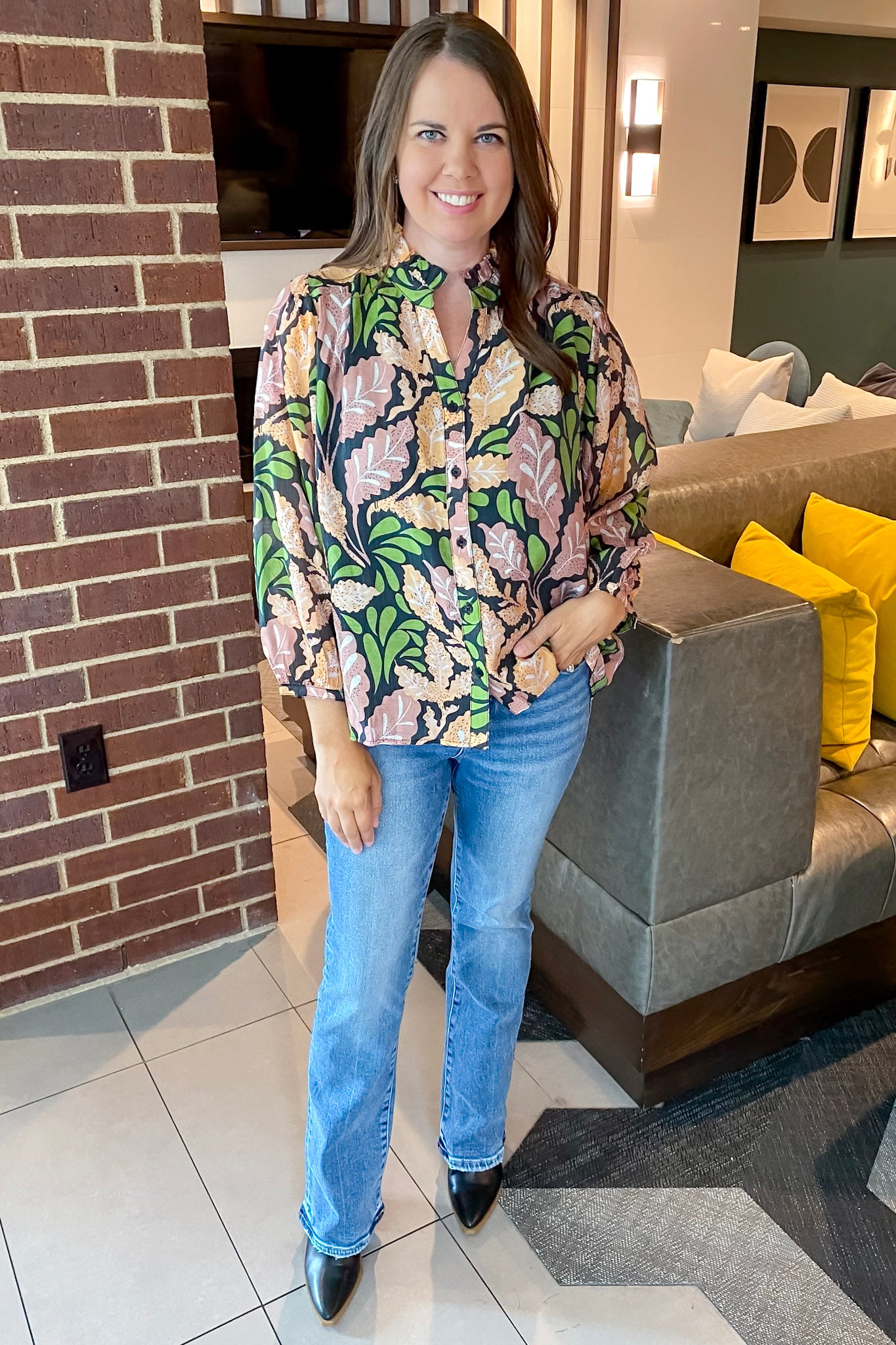 Bring on the crisp air and cozy vibes with this bold beauty! The Please Say Yes Floral Print Black Top features an artsy fall leaf print in soft pinks, greens, and deep navy, making it a standout piece for the season. With a subtle ruffle neckline, button front, and blousy sleeves, it’s a perfect mix of playful and polished.