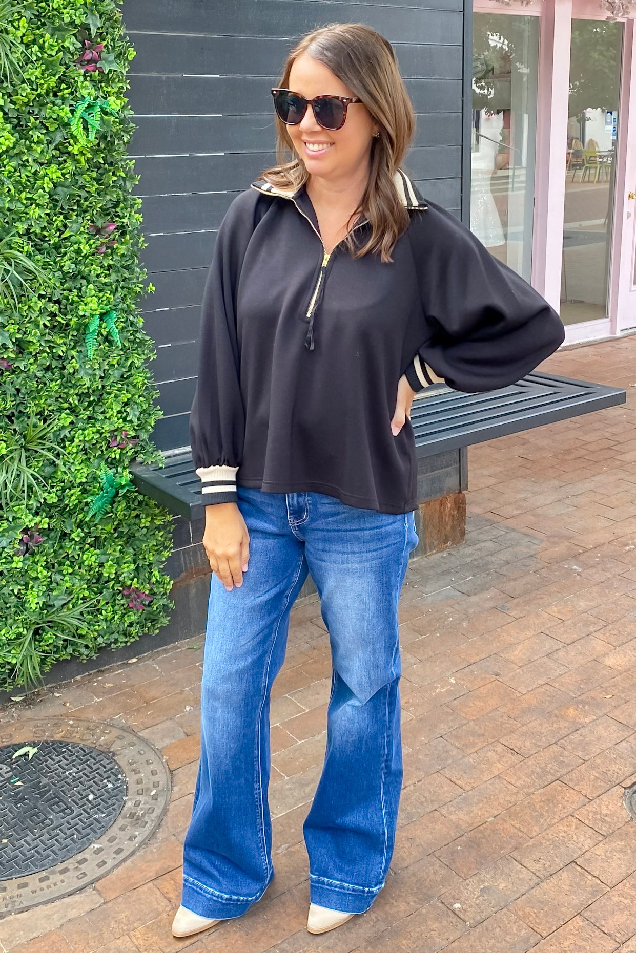 Cool, casual, and effortlessly polished—The Put It On Contrast Black Sweater is your new neutral fave for fall. With its soft black tone, relaxed fit, and sporty striped collar peeking out when unzipped, this top brings elevated coziness to your everyday style. The elastic cuff detail adds just the right amount of bounce, while the half-zip neckline lets you control the vibe—zipped up for sleek or unzipped for laid-back layers.