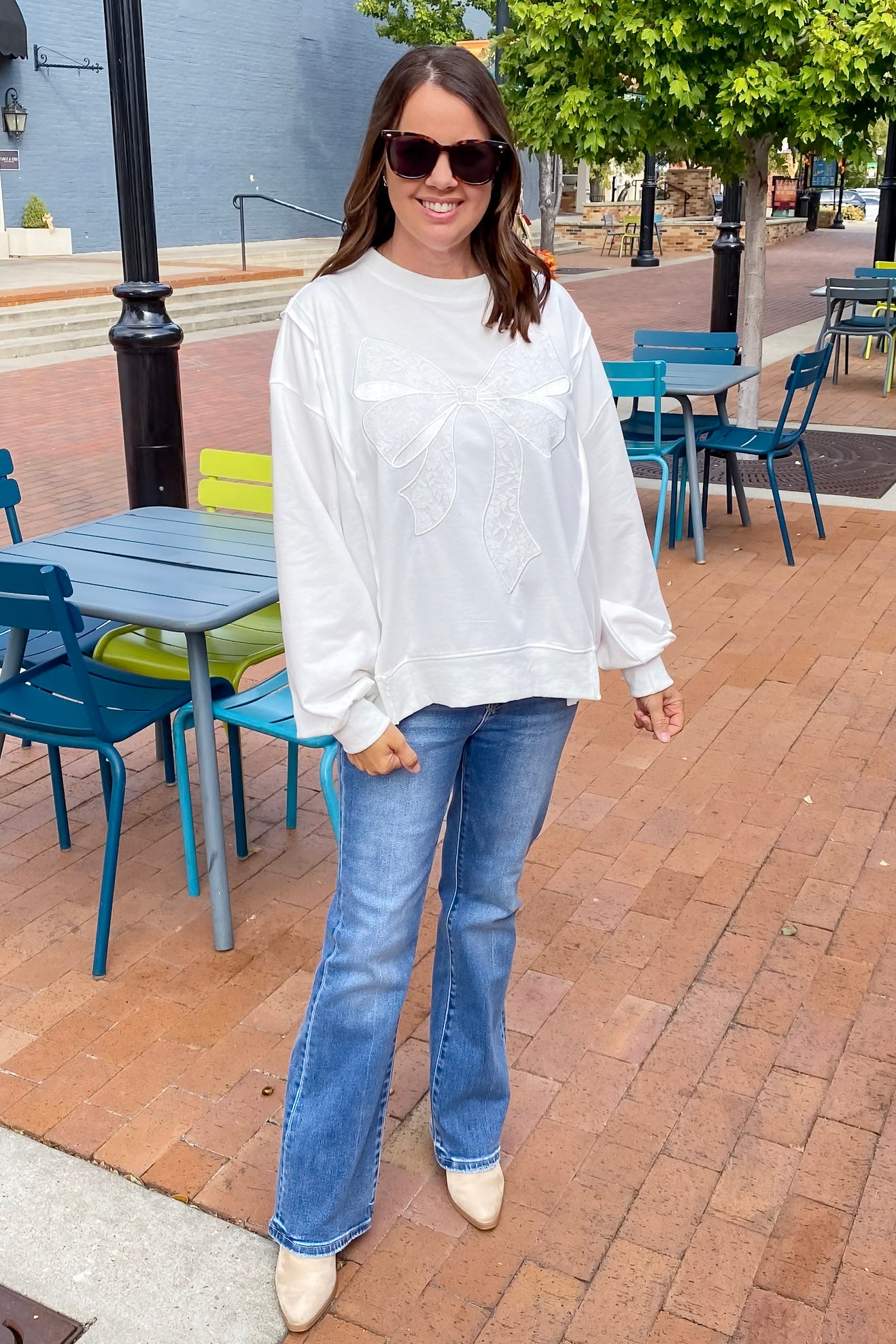 Meet the Ribbons and Bows White Sweater — the perfect mix of cozy and cute for winter days! This soft white pullover features an oversized textured bow across the front for a playful, feminine touch that still keeps things polished. With its relaxed fit and classic crew neckline, it’s made for comfy layering without skimping on style. From hot cocoa moments to downtown strolls, this sweatshirt is ready for it all.