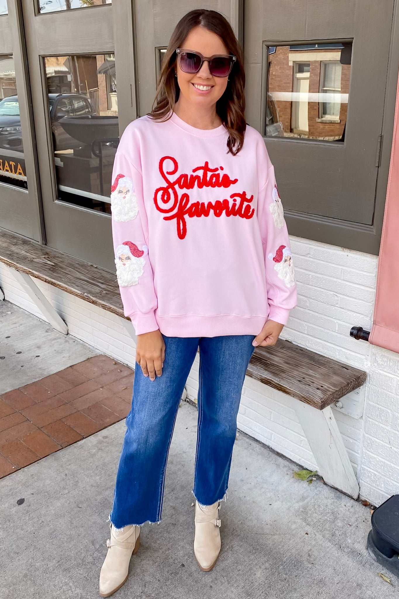 Embrace your individuality with our Santa's Favorite Sequin Pink Sweater! Featuring a classic crew neckline, relaxed drop shoulders, and ribbed trim, it offers a comfortable, relaxed fit perfect for holiday gatherings, winter outings, or cozy days at home. Soft, snuggly, and full of festive charm, the Holiday Sarah Sweatshirt is a seasonal must-have for your wardrobe.