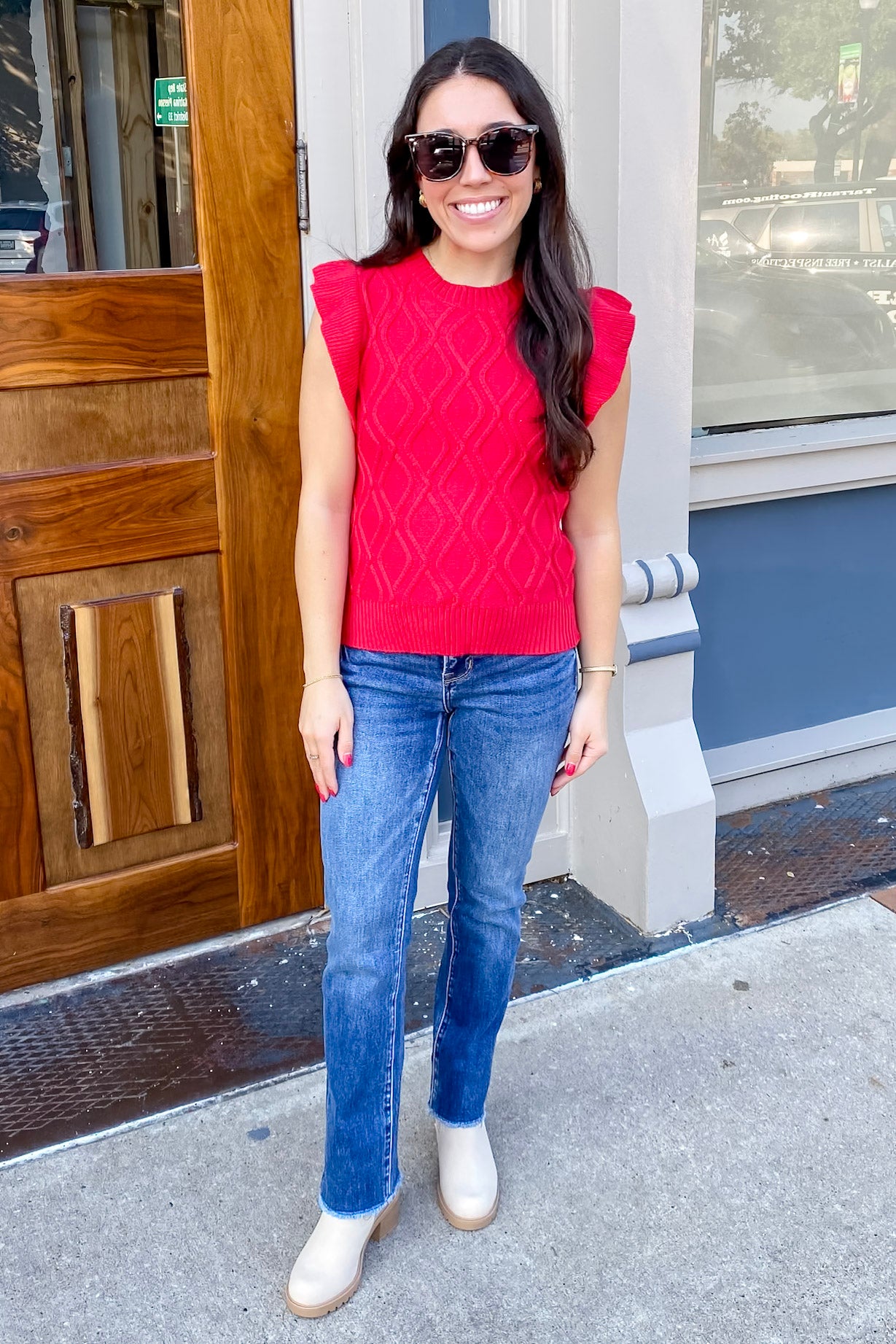 Bright, bold, and totally crush-worthy — this cranberry red sweater vest brings the fun! With chunky diamond-knit texture and fluttery ruffle sleeves, it's the kind of top that instantly livens up your layers. The ribbed hem adds a cozy, snug touch while the vibrant hue keeps it festive and flirty. Whether you're sipping cider or setting the holiday table, this little number is made for twirling into fall.