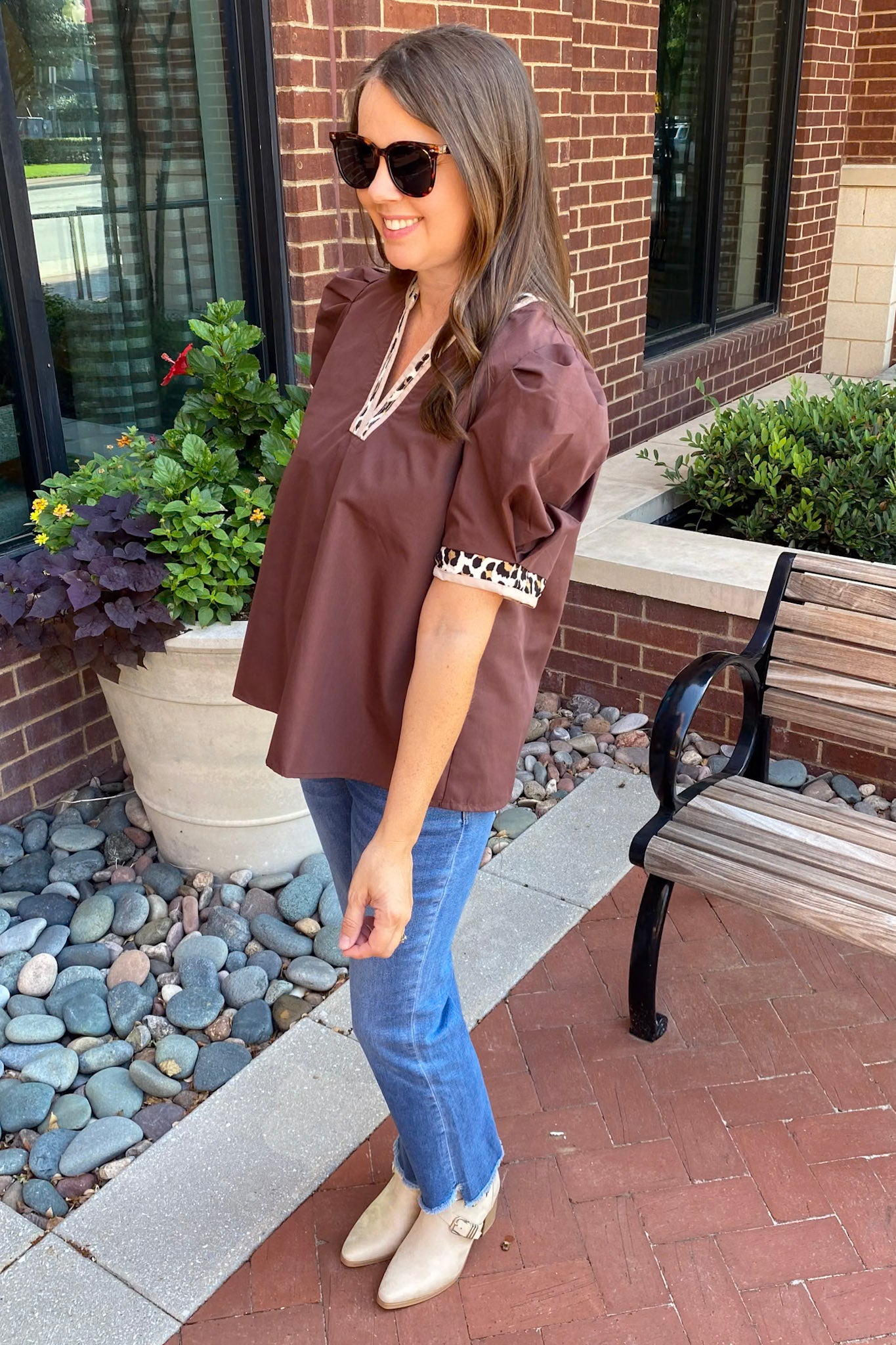 This deep chocolate brown top is anything but basic. The standout puff sleeves and bold animal print trim add a playful twist to a structured silhouette. A notched neckline trimmed in neutral leopard gives just the right amount of edge, while the relaxed fit keeps it easy and comfortable for all-day wear. It's fierce, fun, and effortlessly fall-ready.
